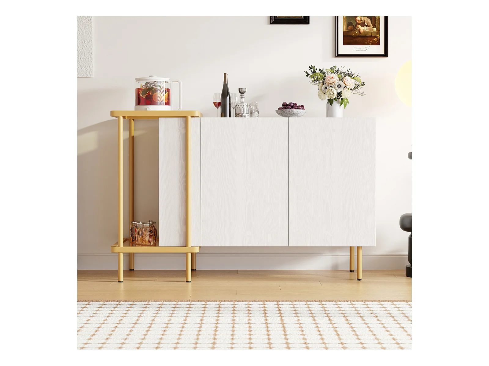 Aparador moderno de 4 portas em branco e dourado - MDF, pés de metal, para sala de estar e sala de jantar