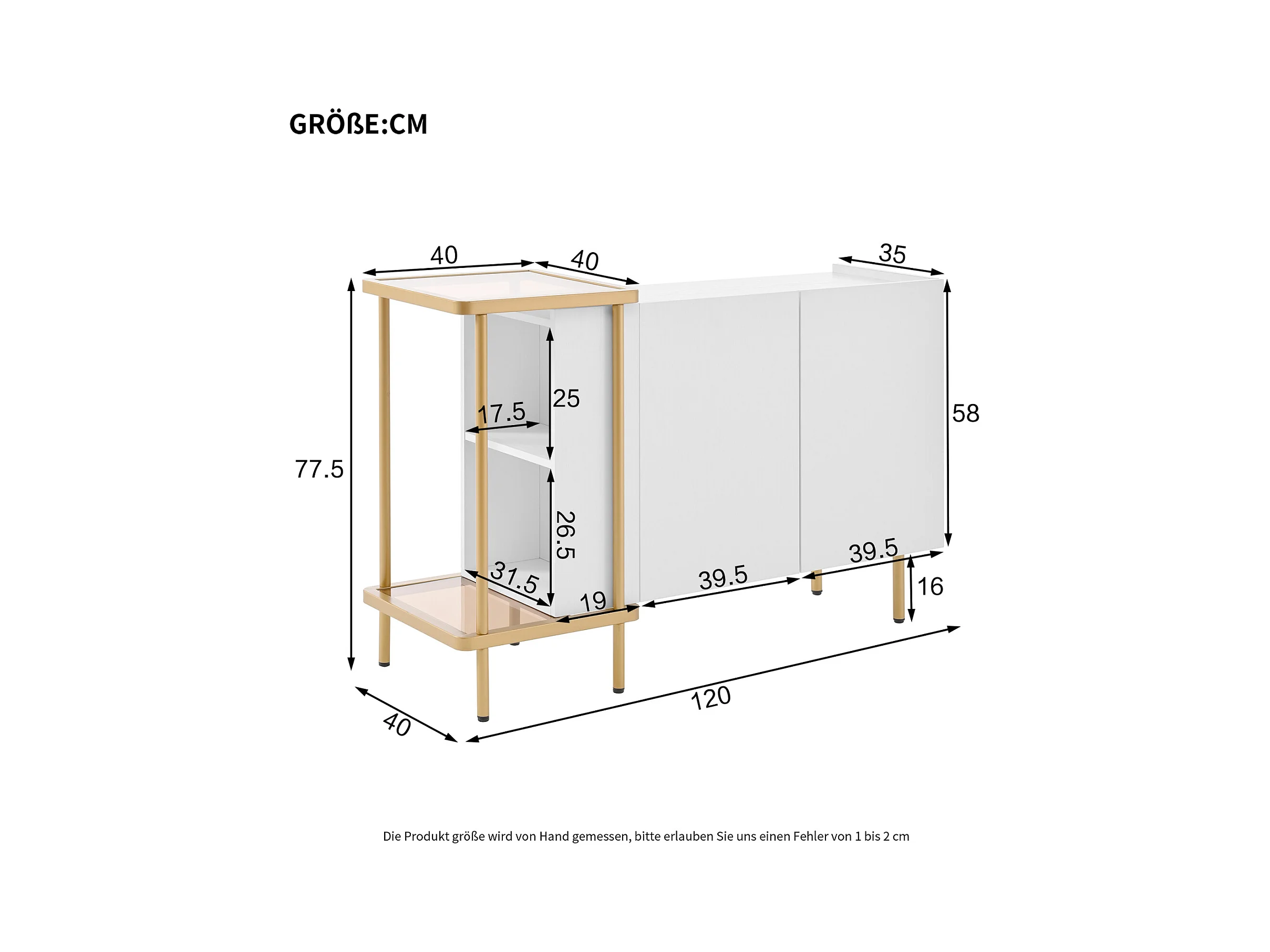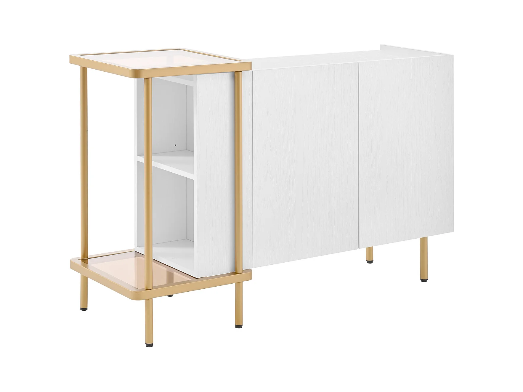 Aparador com 2 portas e 2 compartimentos abertos, mesa de centro em metal/vidro, branco, 120 x 40 x 77,5 cm