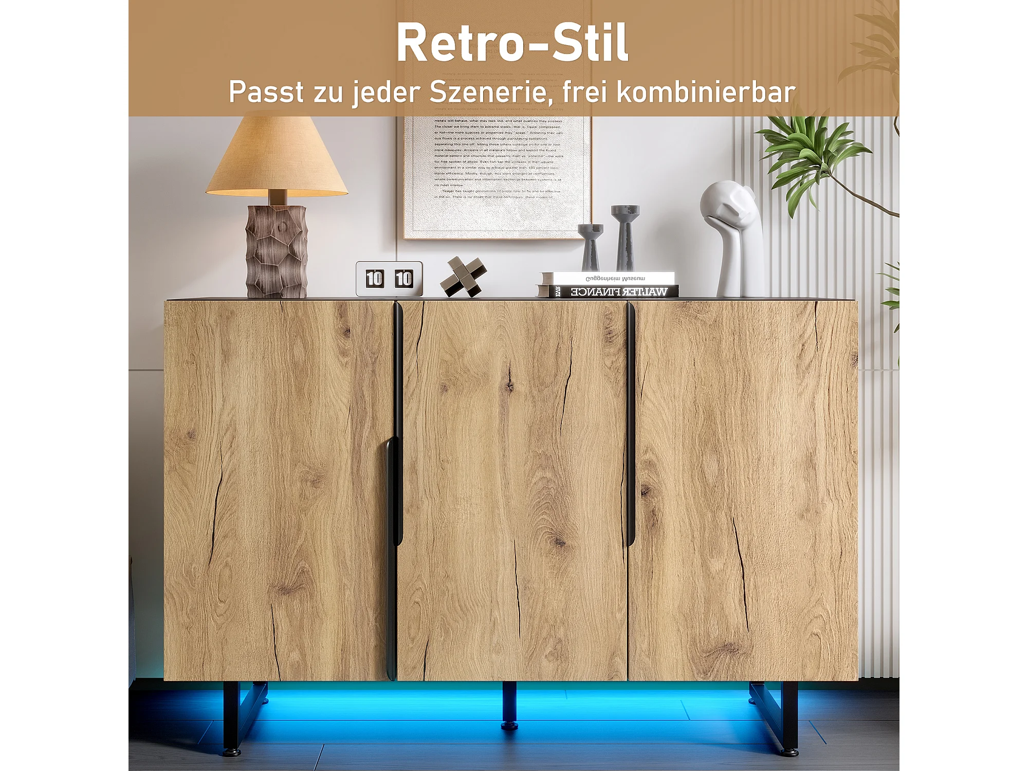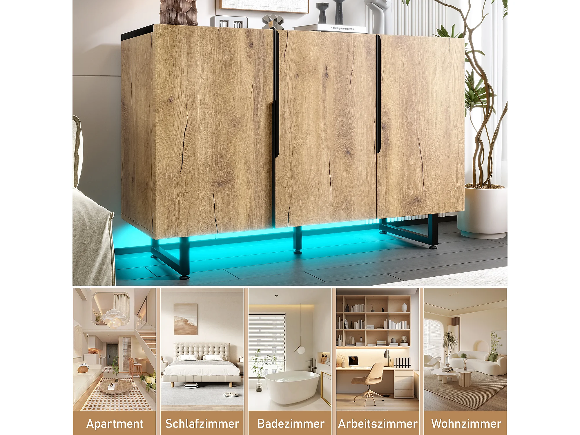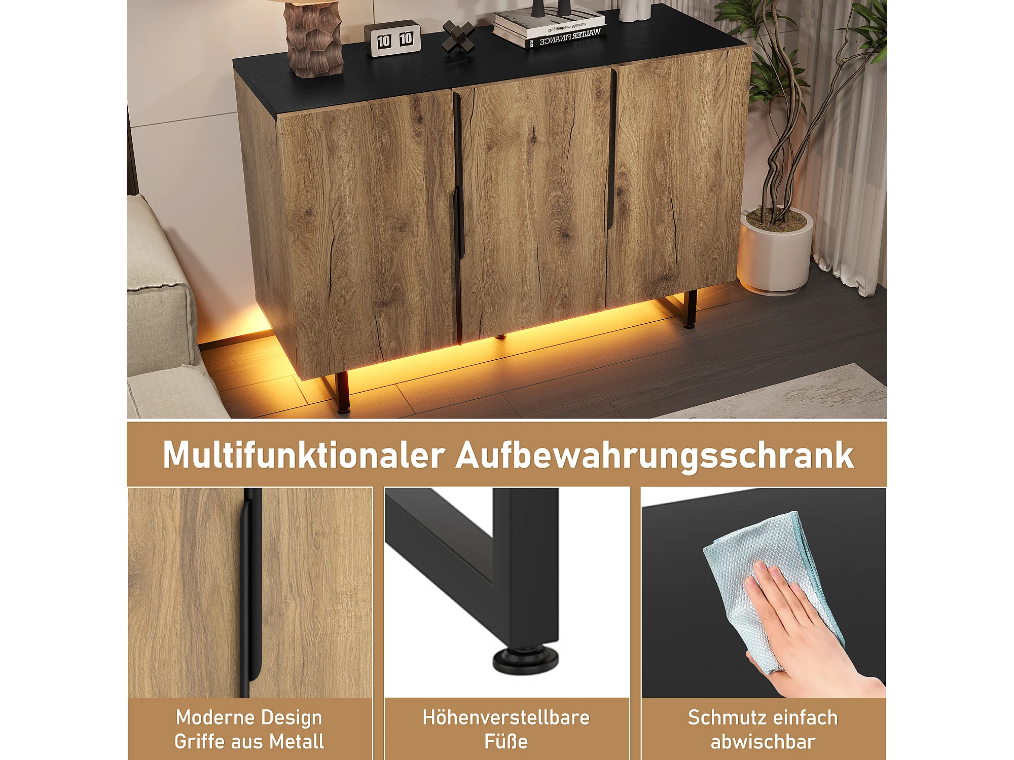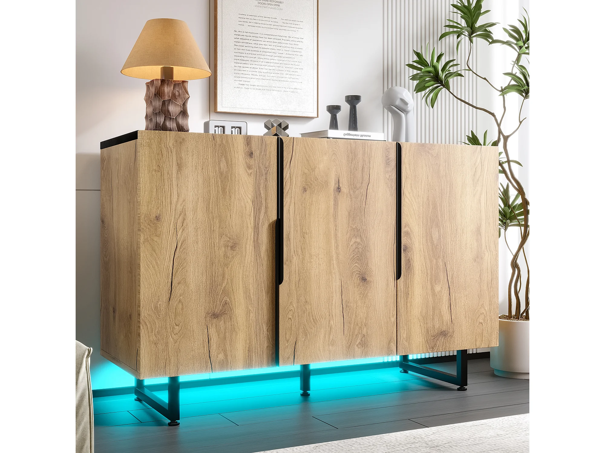 Aparador com iluminação LED, armário de cozinha, prateleira ajustável, 3 portas, 120 x 40 x 80 cm, madeira, cor natural.