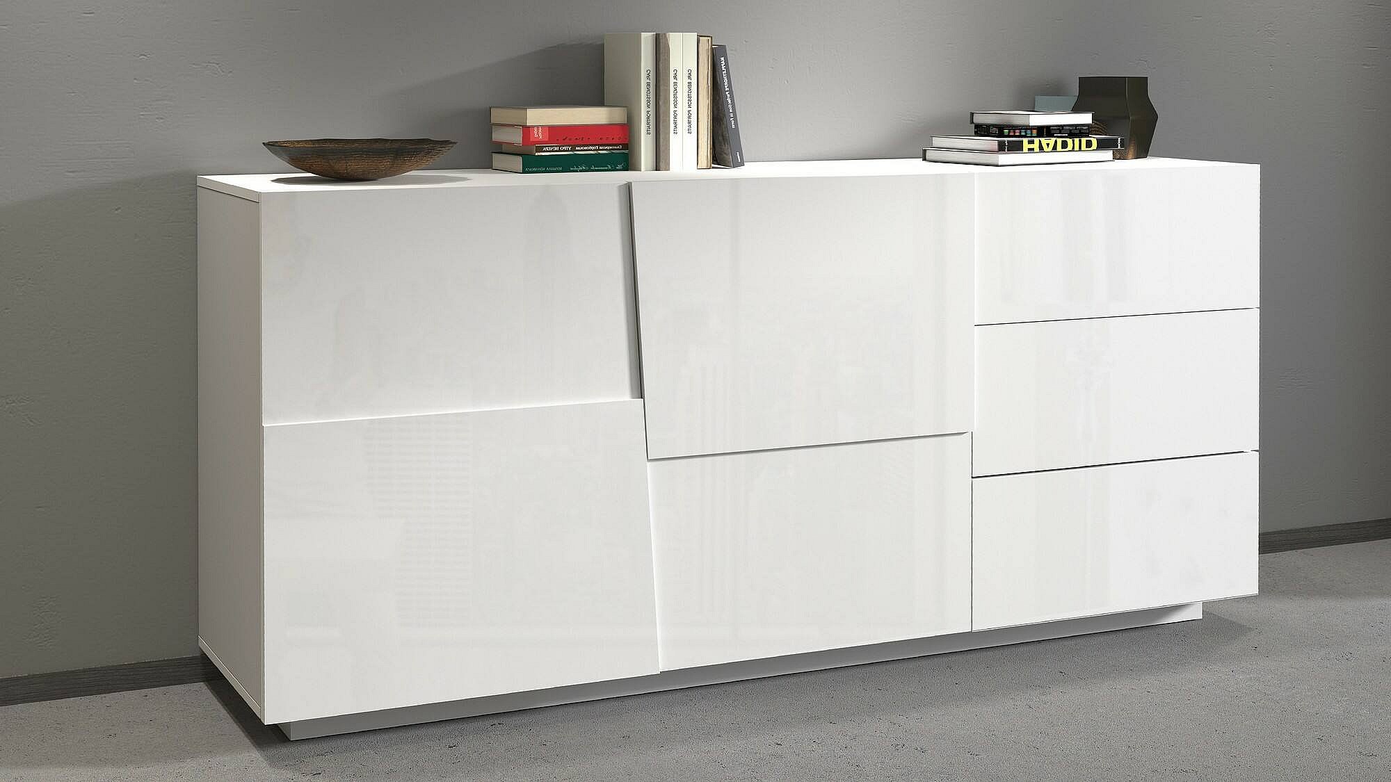 Aparador Dfogli, Aparador de cozinha com 2 portas e 3 gavetas, Buffet de sala, 100% Fabricado na Itália, 180x43h86 cm, Branco brilhante