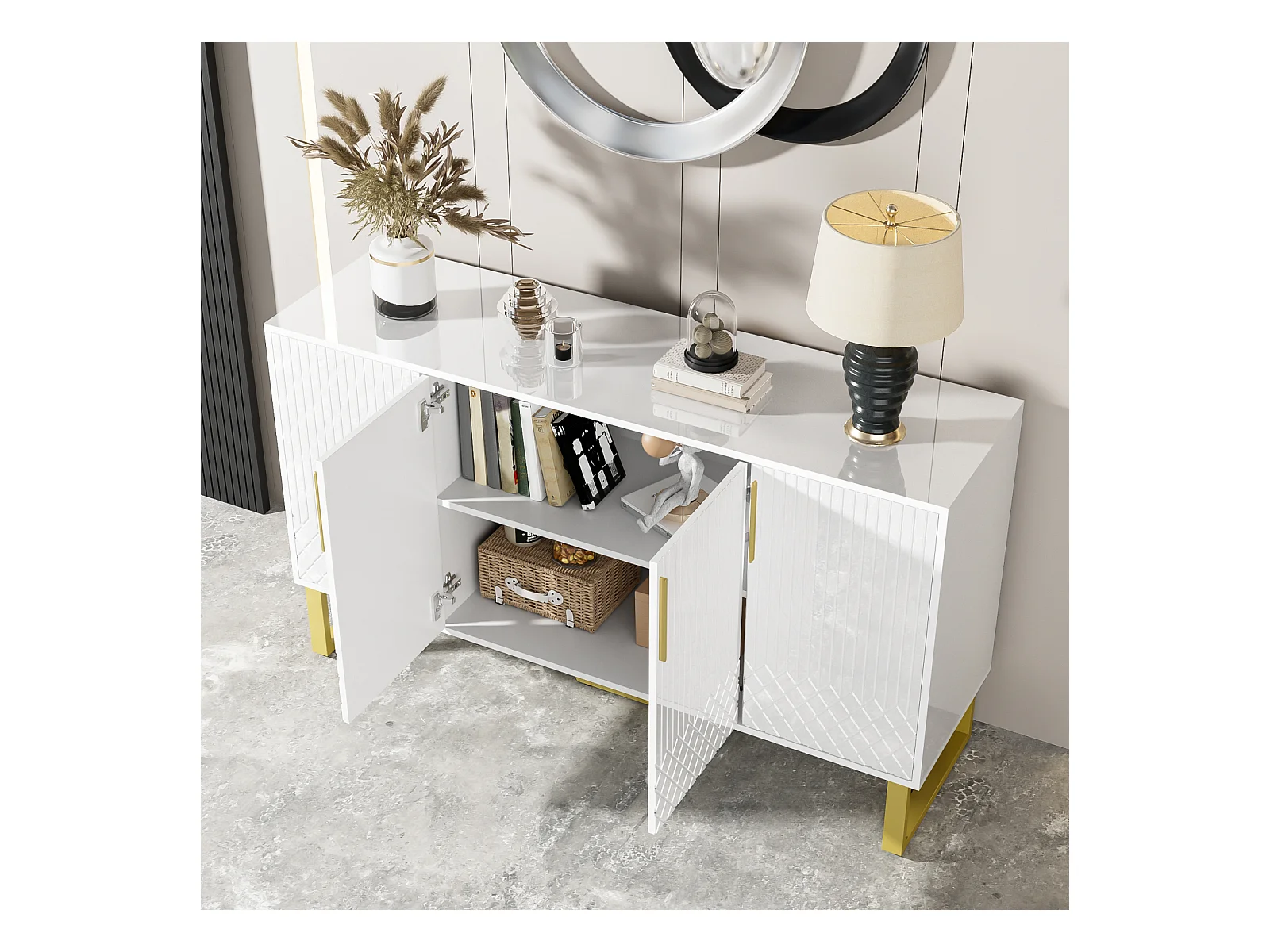 Aparador brilhante de 4 portas com puxadores e pés de metal, desenho geométrico branco