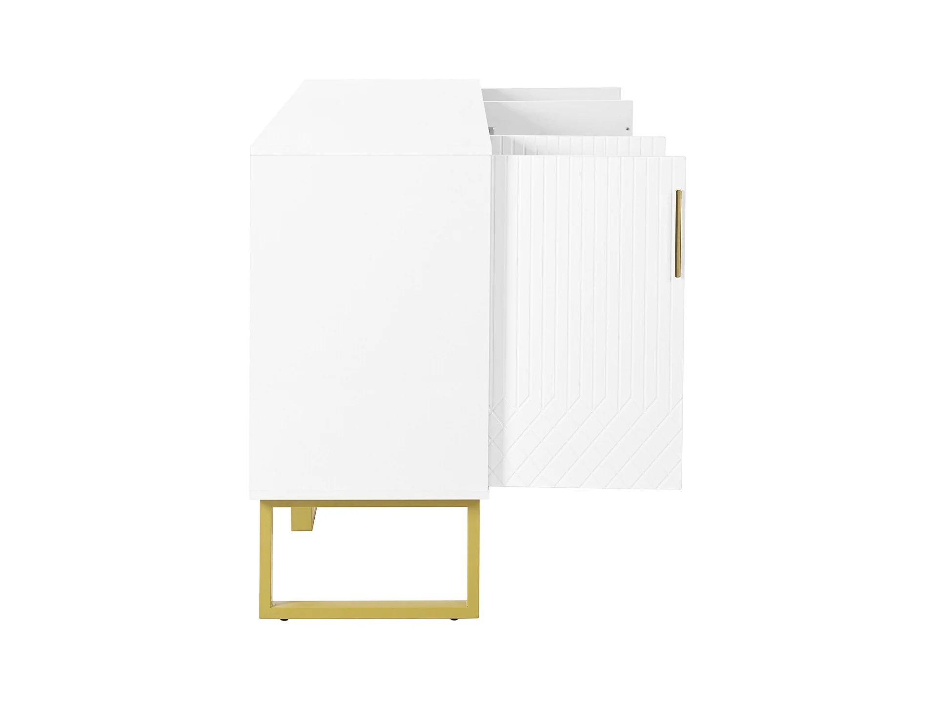 Aparador branco moderno com 4 portas texturizadas, frente brilhante, puxadores dourados