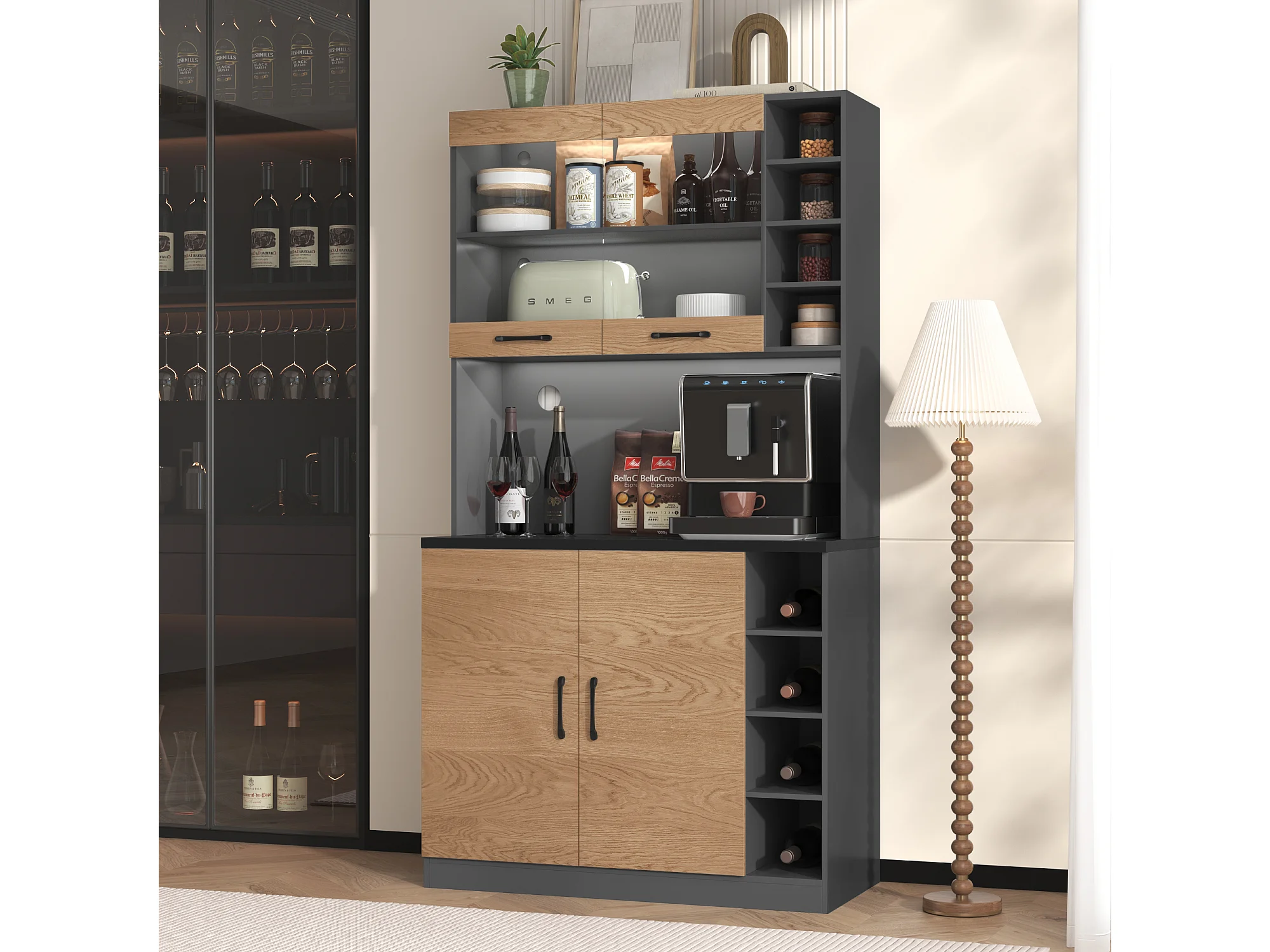 Aparador de cozinha 100x47x187cm MDF LED micro-ondas móvel moderno cinza