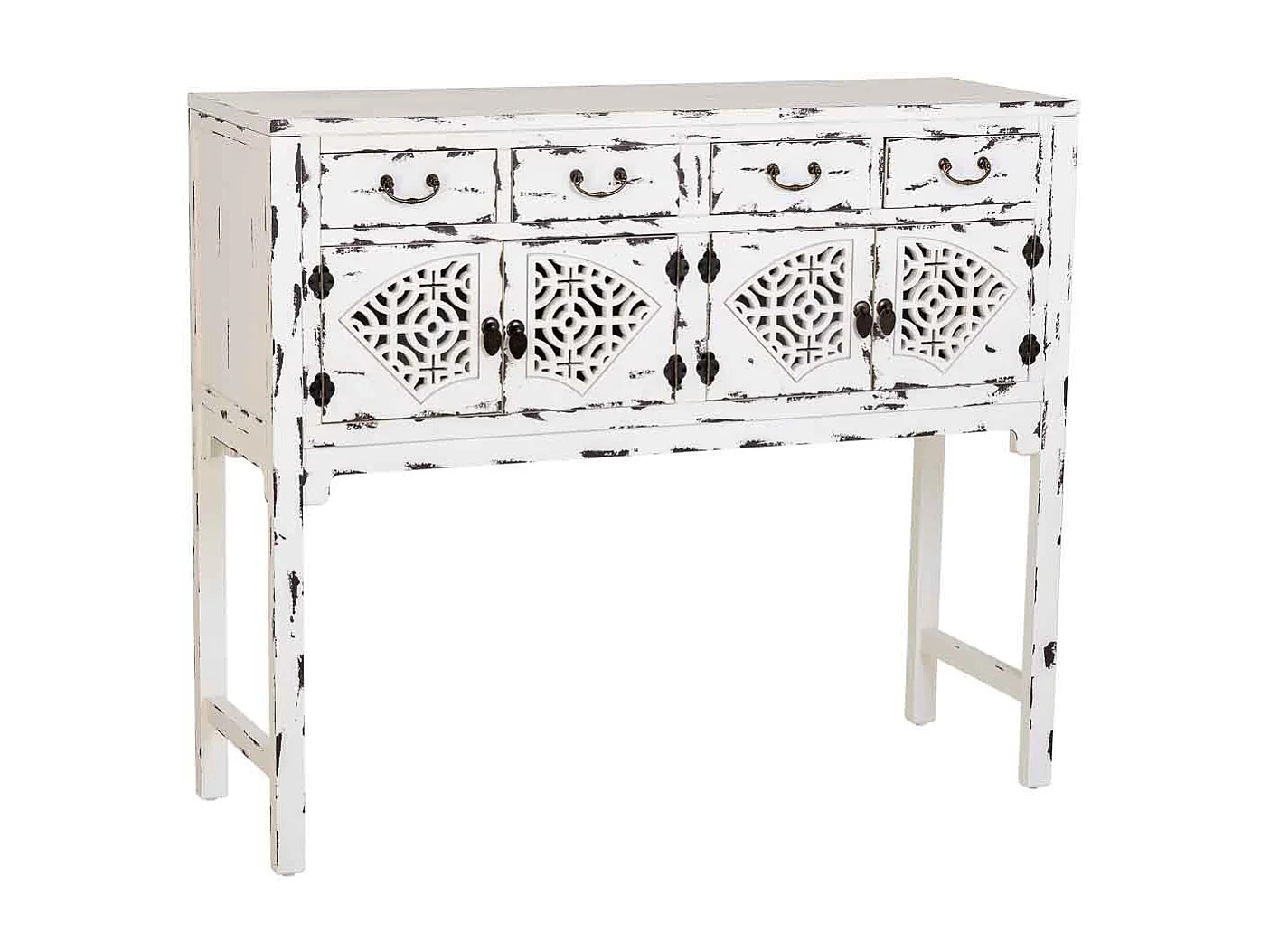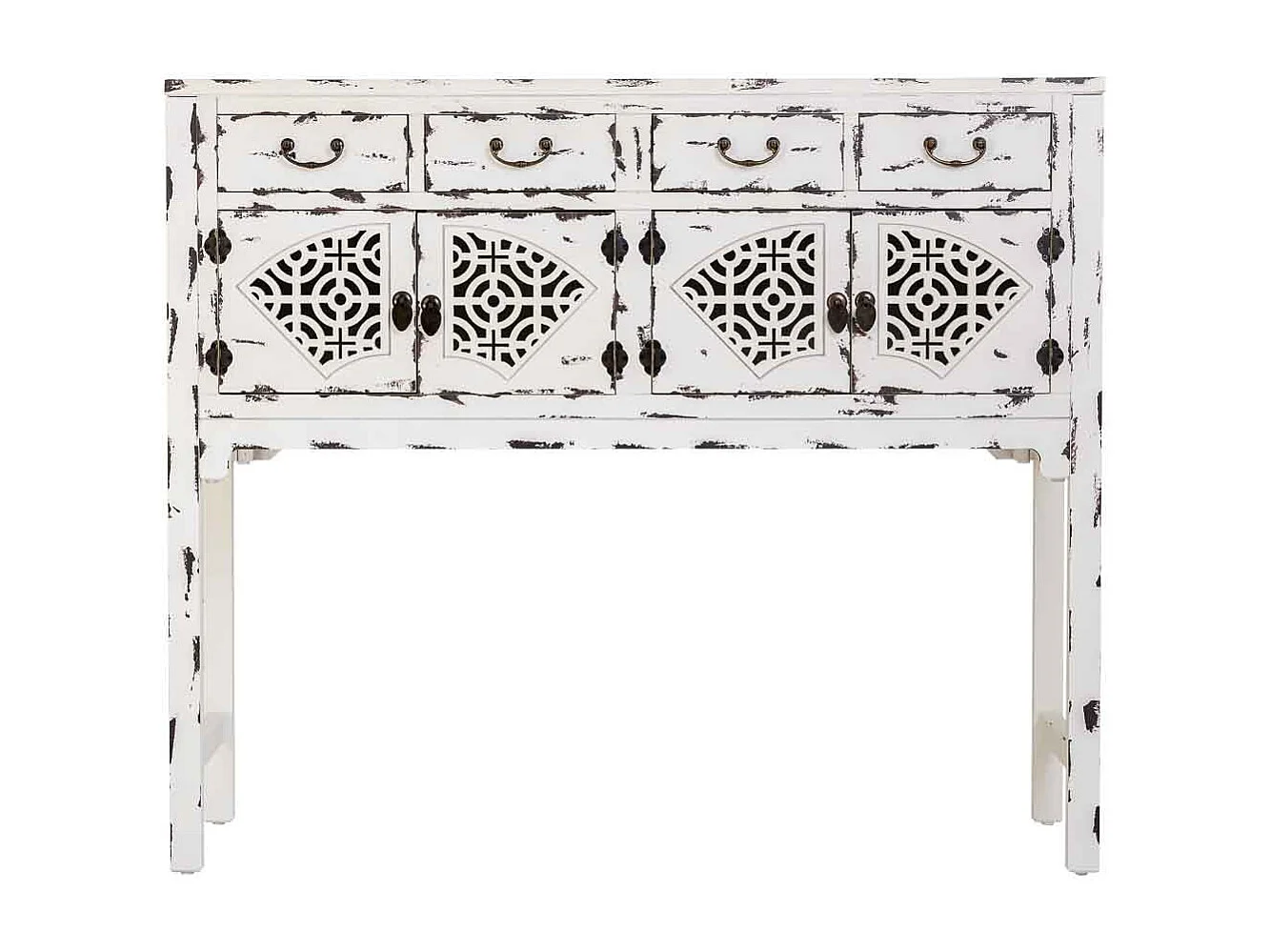 Aparador de entrada em madeira laqueada branca envelhecida com 4 gavetas e 4 portas.