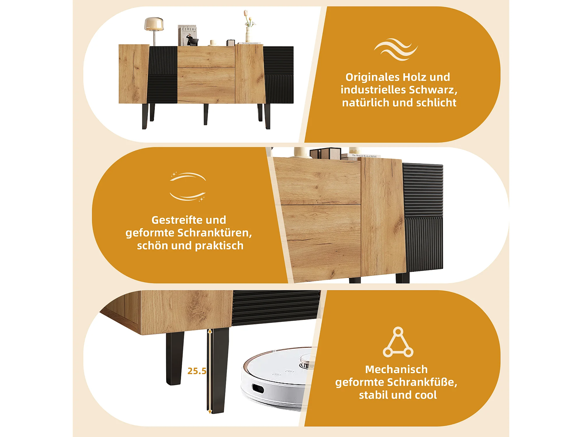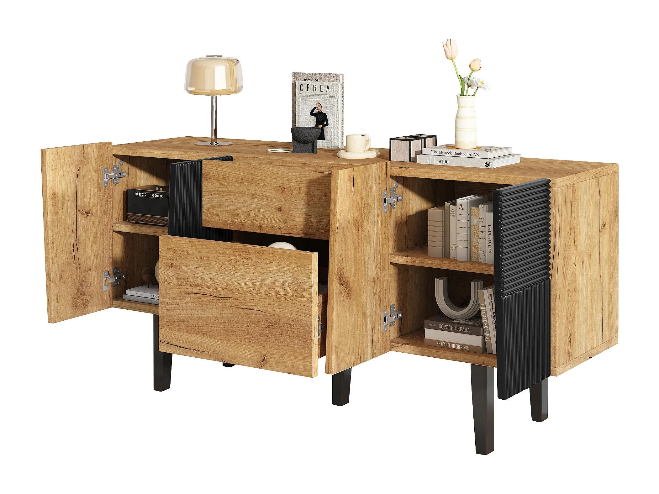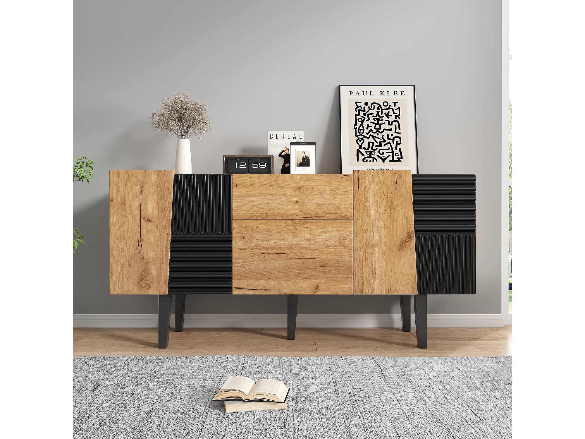 Aparador de imitação de madeira de carvalho de 140 cm, armazenamento moderno, 2 gavetas, 4 portas, sala de estar, entrada, TV, 80 kg