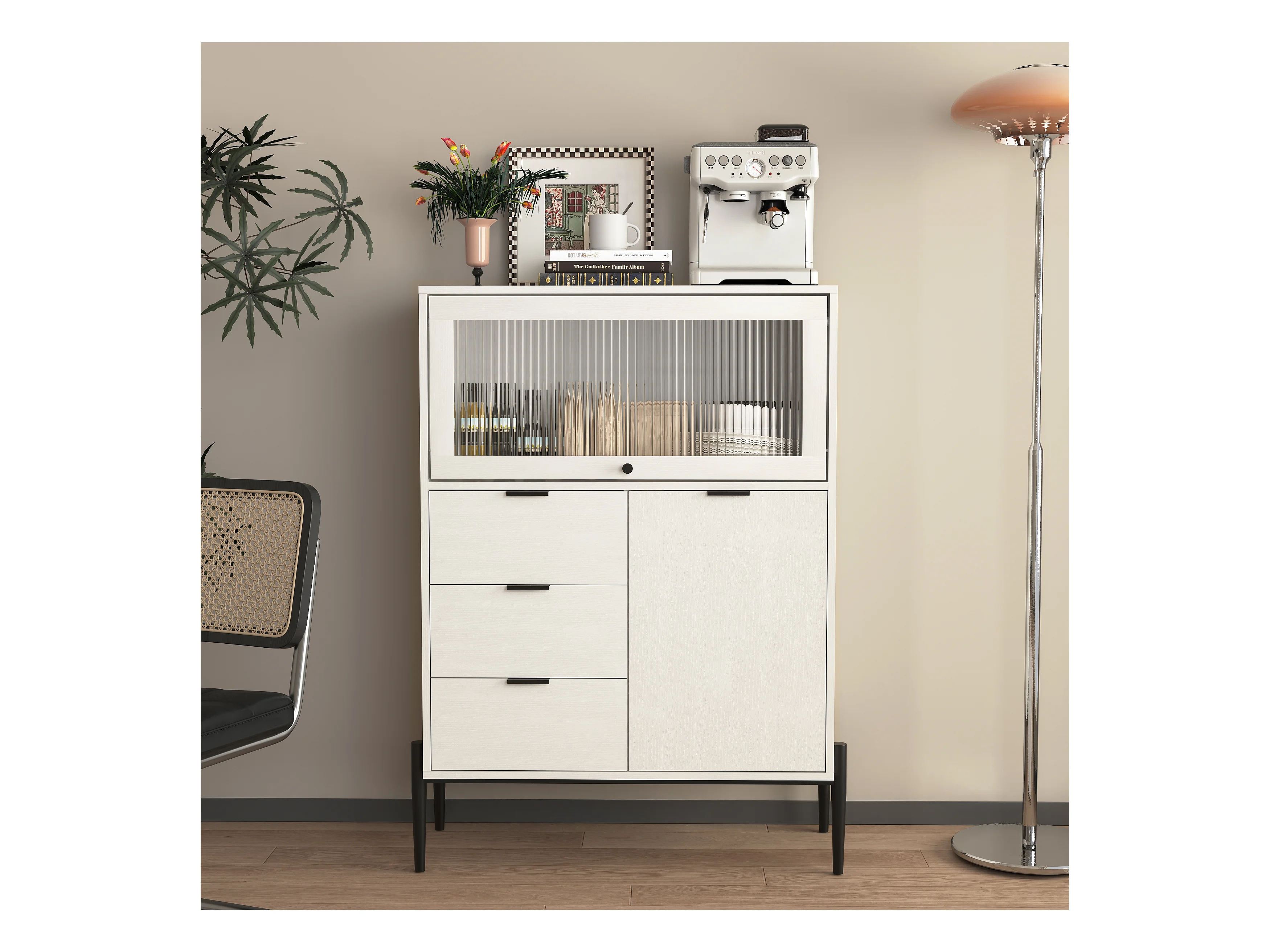 Aparador moderno de madeira branca com portas de vidro canelado e 3 gavetas para sala de estar e entrada