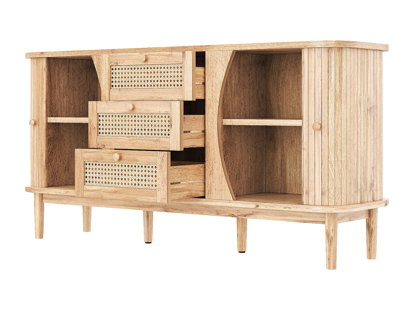 Aparador de madeira com gavetas de vime, 140 cm de arrumação para sala de estar ou sala de jantar, estilo natural