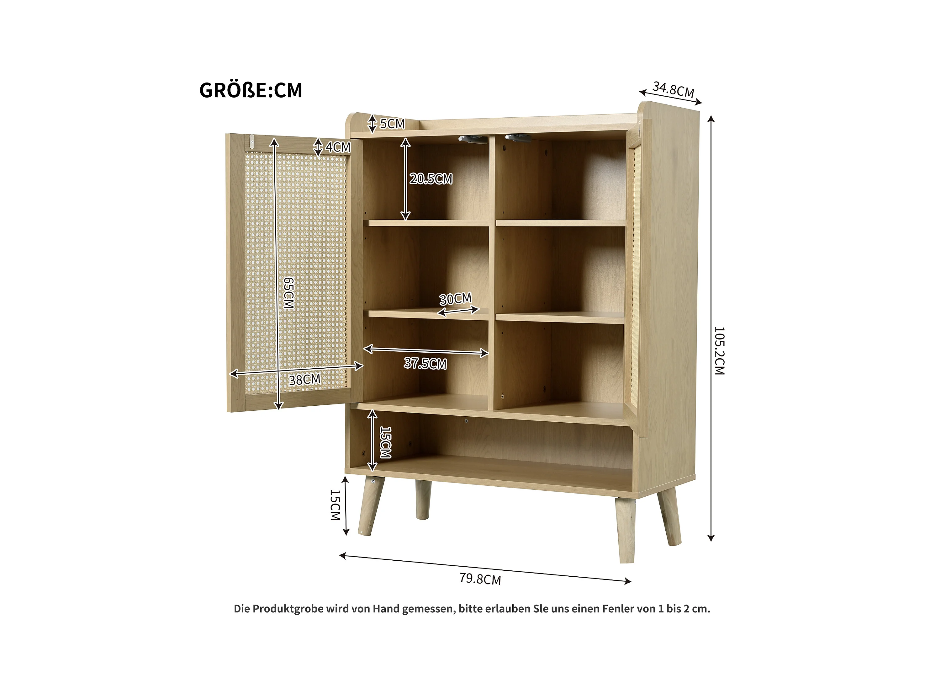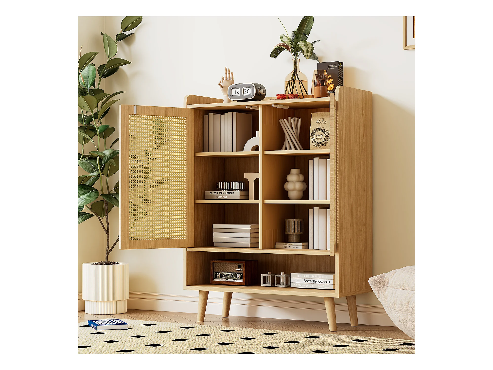 Aparador de vime natural com 2 portas e 3 prateleiras, móvel de arrumação para sala de estar e sala de jantar