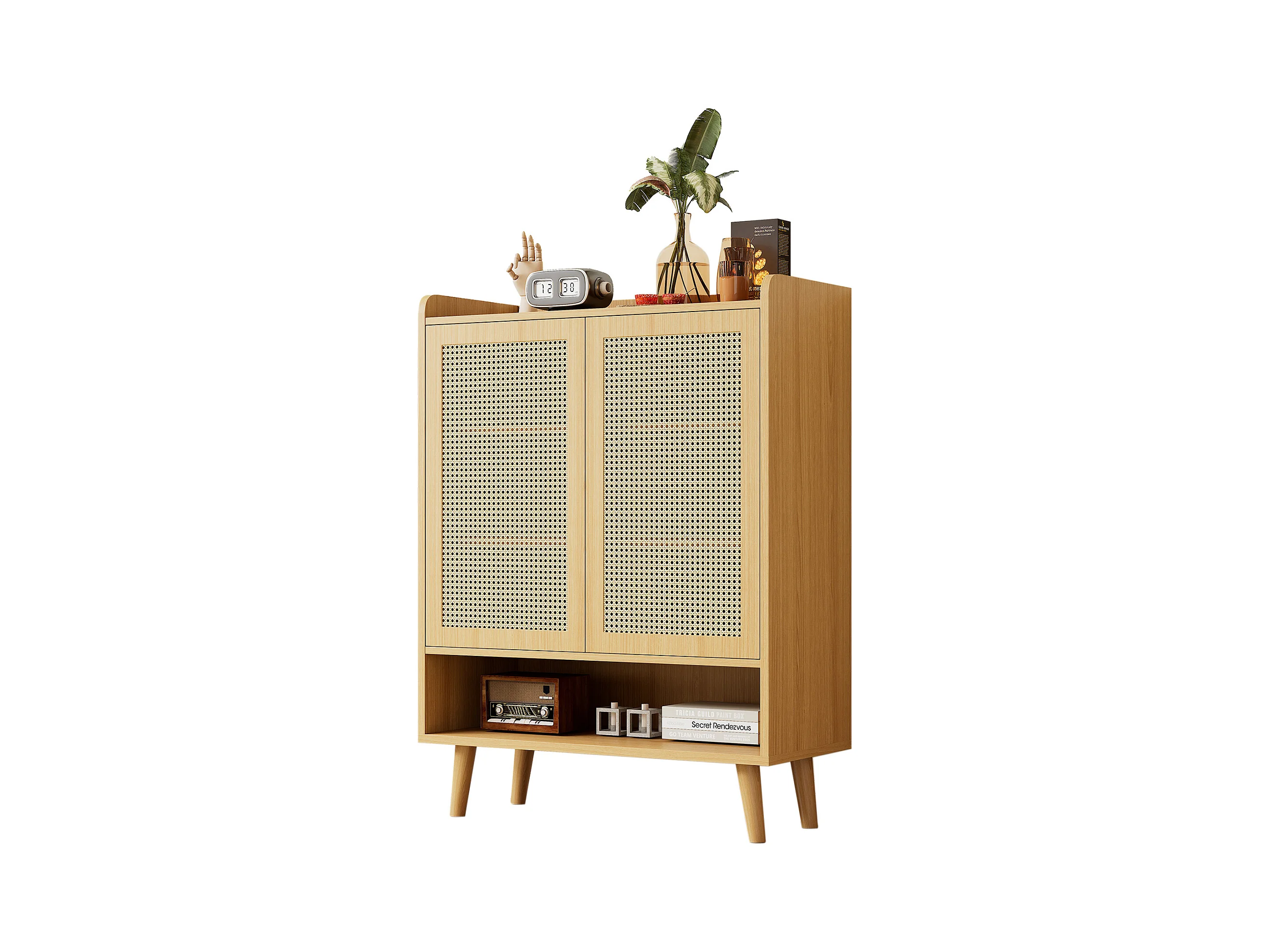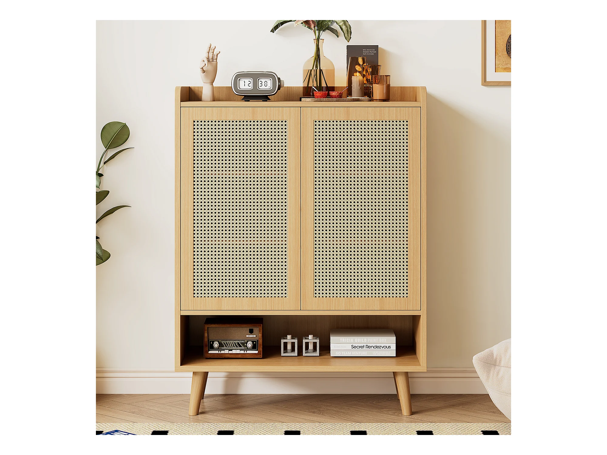 Sapateira de aglomerado com 2 portas, design de vime natural, 68x35x90 cm