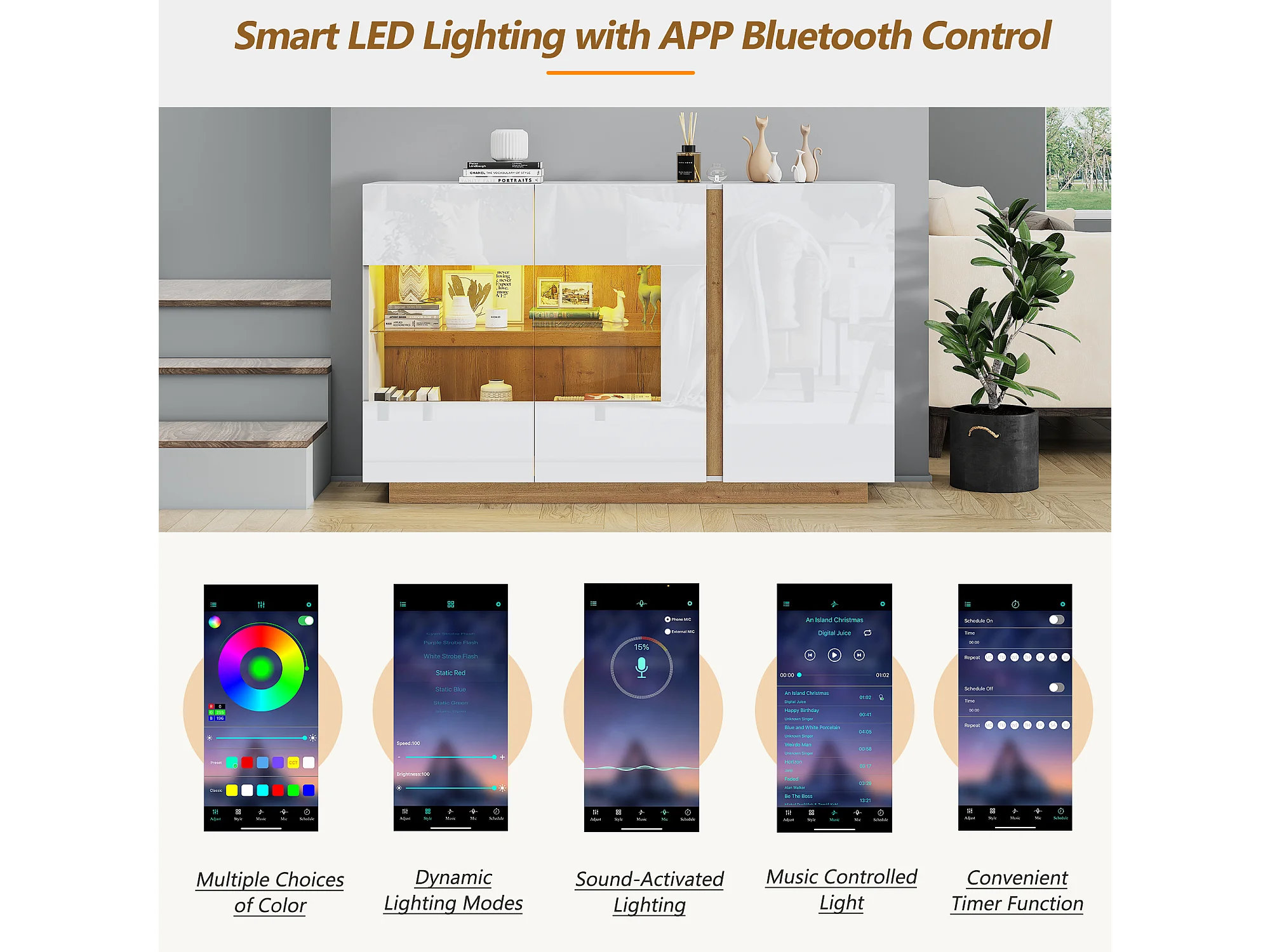Aparador de sala com LED, armário de armazenamento, portas de madeira e vidro, 138x38x90cm, branco