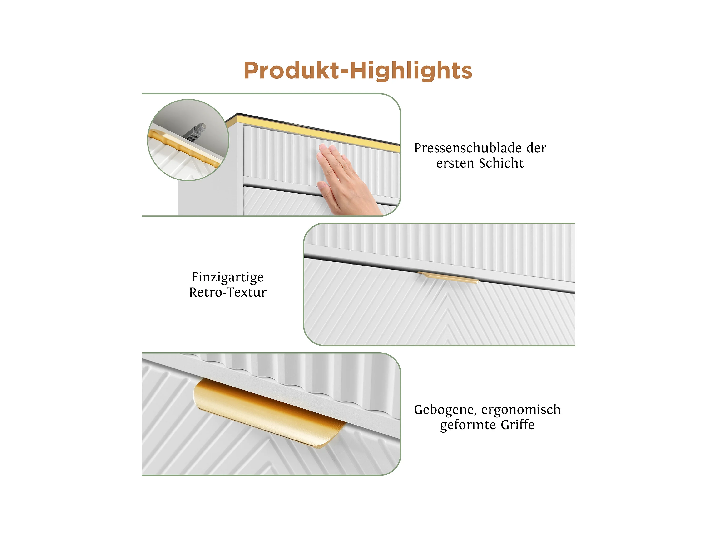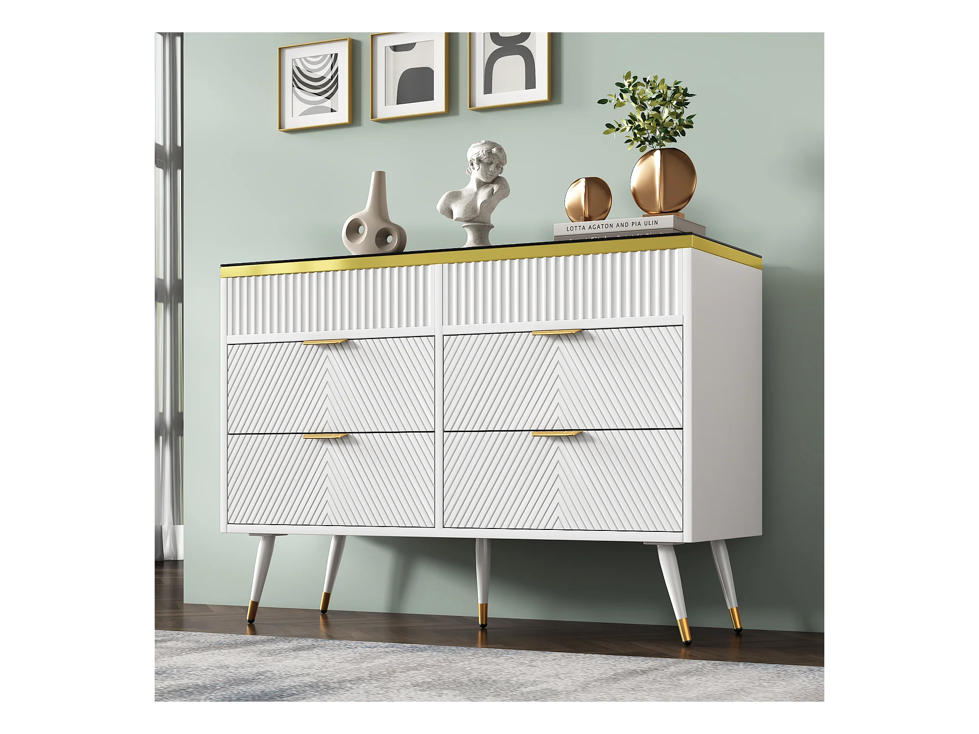 Aparador moderno de madeira branca e dourada com 6 gavetas 120x40x77 cm, unidade de armazenamento de sala de estar de designer