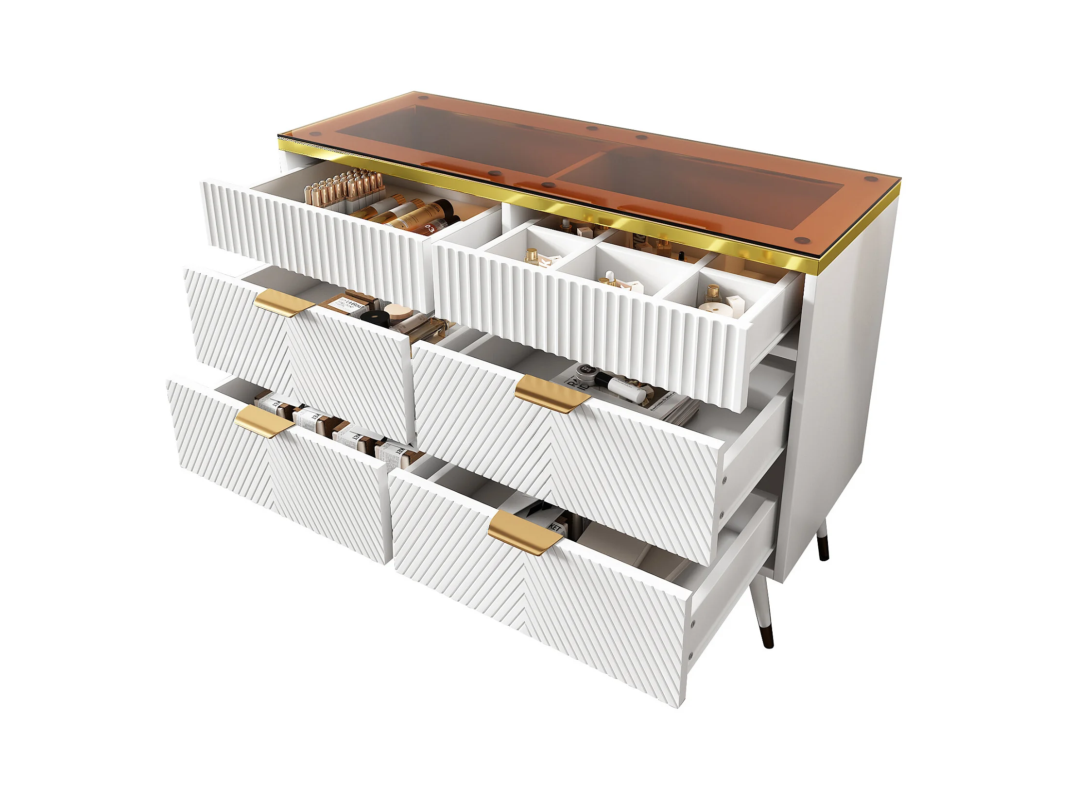 Aparador de vidro âmbar 6 gavetas MDF metal armazenamento sala estar quarto 120x40x76 cm branco