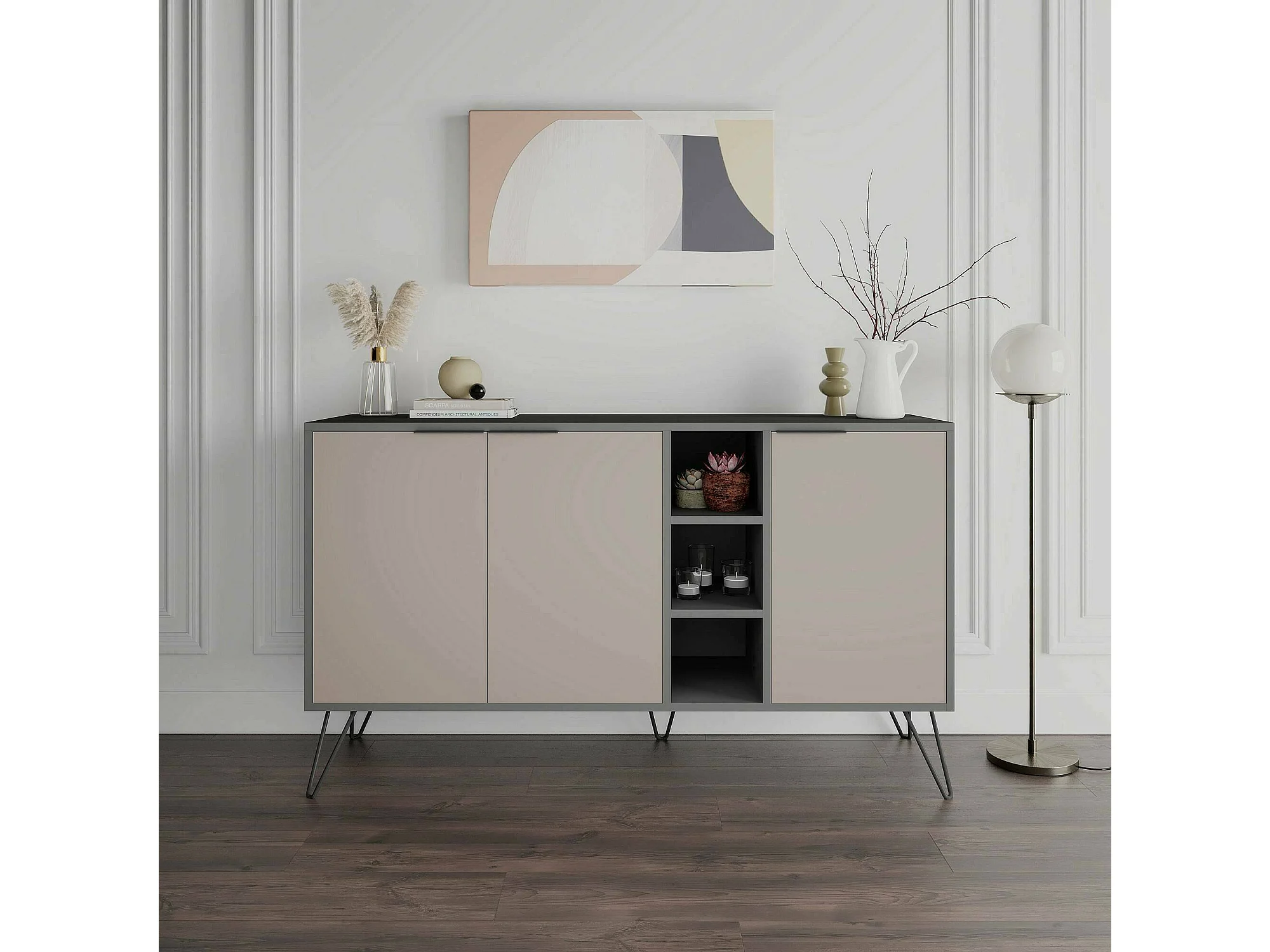 Aparador Dpenz, Buffet de sala, Madia de sala de estar, Despensa de cozinha, 142x36h83 cm, Antracite e Bege