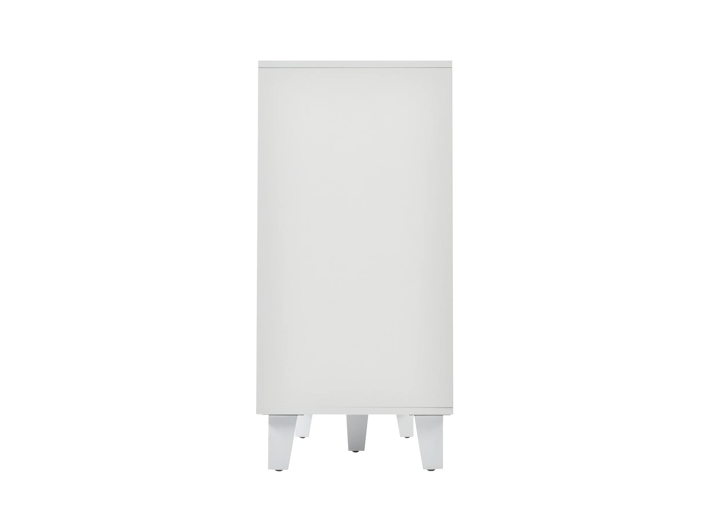 Aparador brilhante de 4 portas com puxadores e pés de metal, desenho geométrico branco