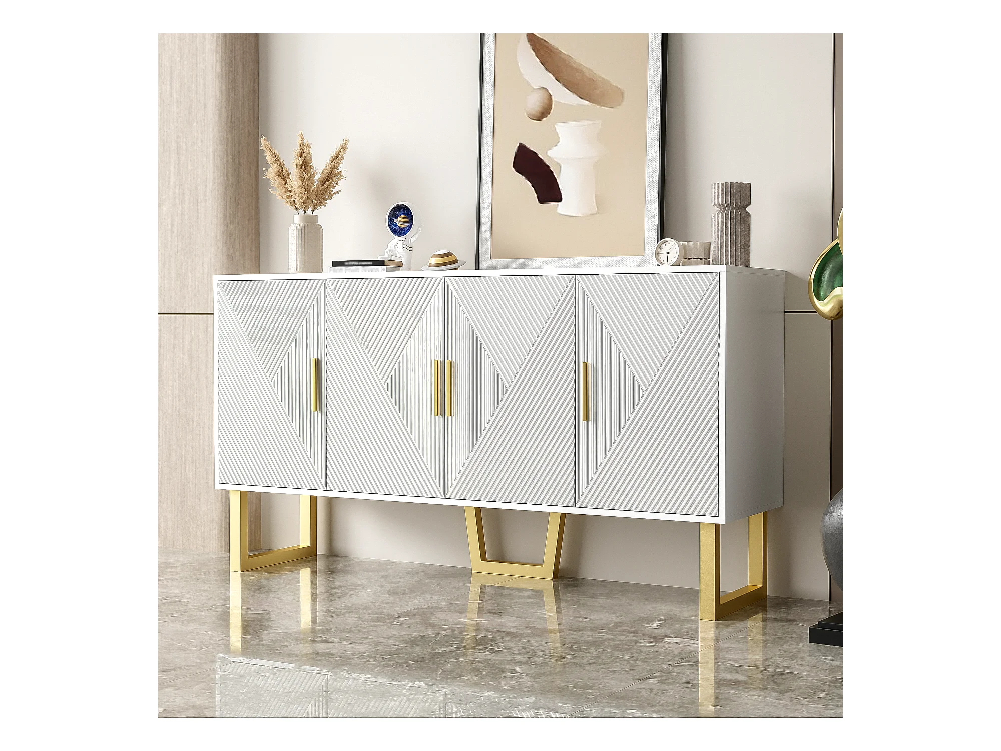 Aparador em MDF 152x40x75cm branco com desenho ondulado e puxadores e pés dourados para sala de jantar