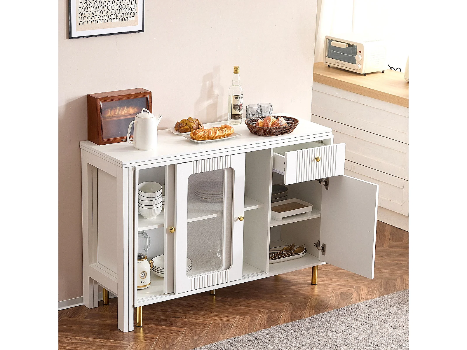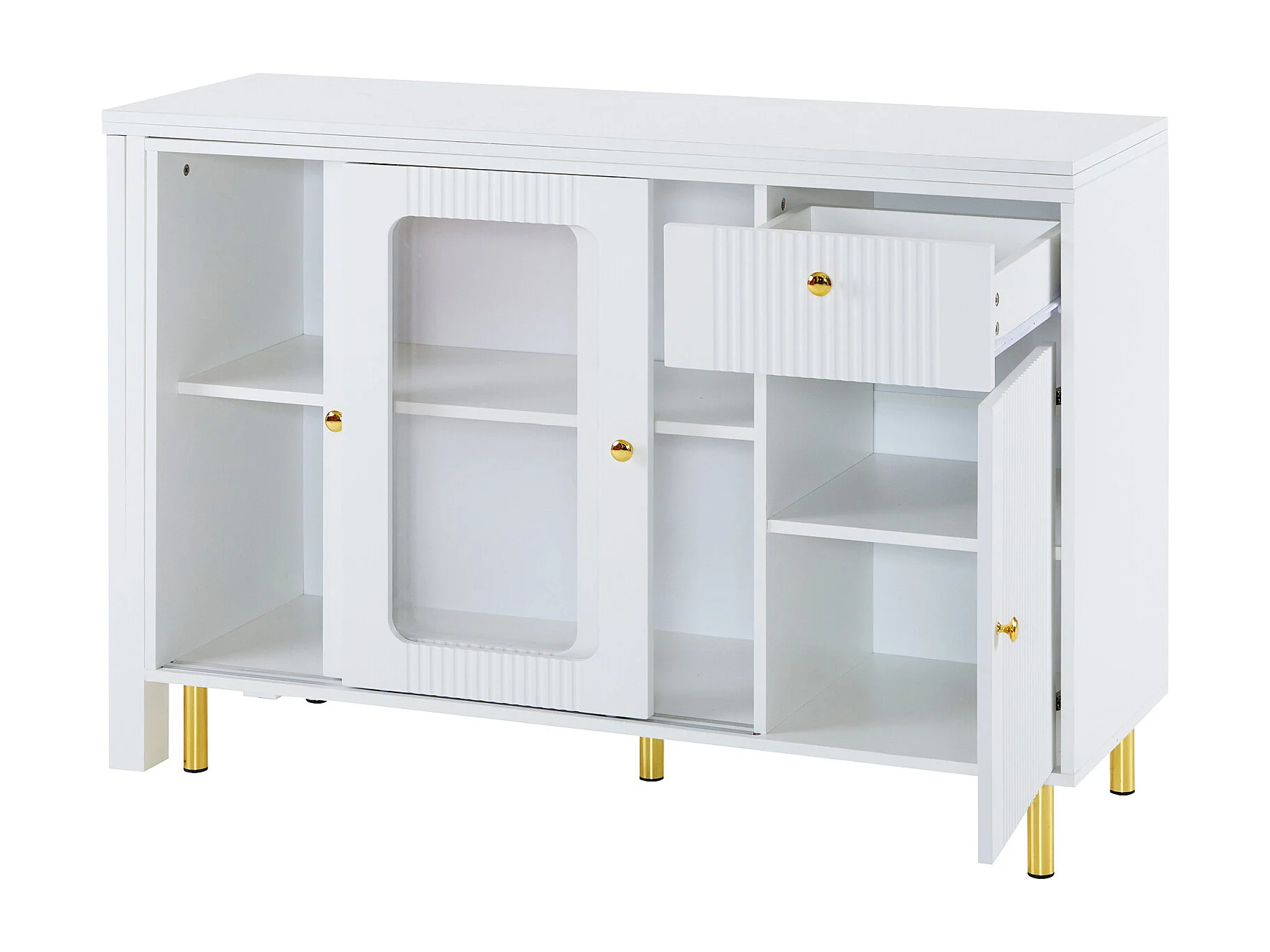 Aparador moderno branco com tampo rebatível, portas de vidro e pés dourados, para cozinha/sala de jantar.
