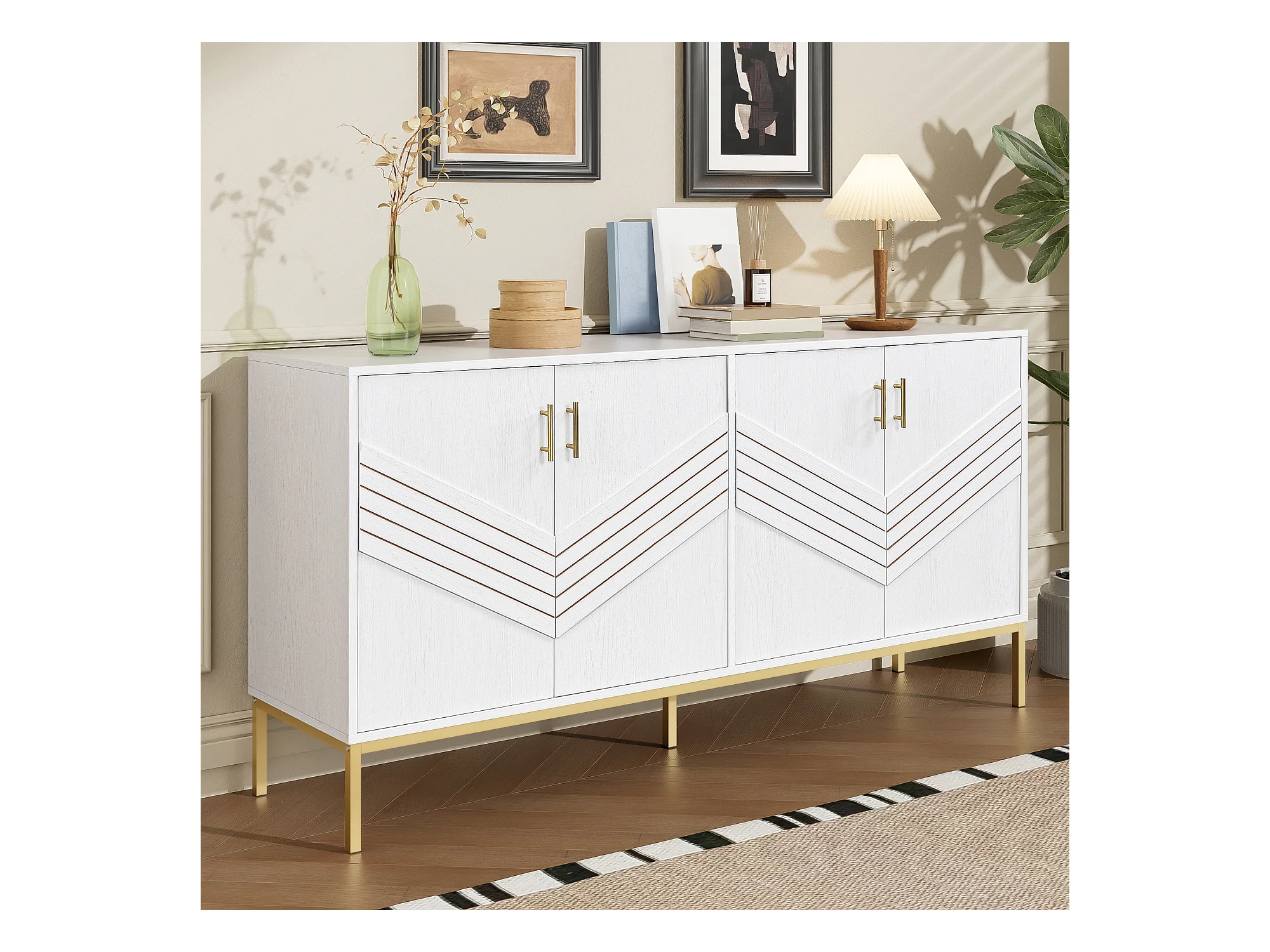 Aparador moderno de 4 portas em MDF branco com armazenamento modular e puxadores dourados, 160 x 40 x 80,5 cm