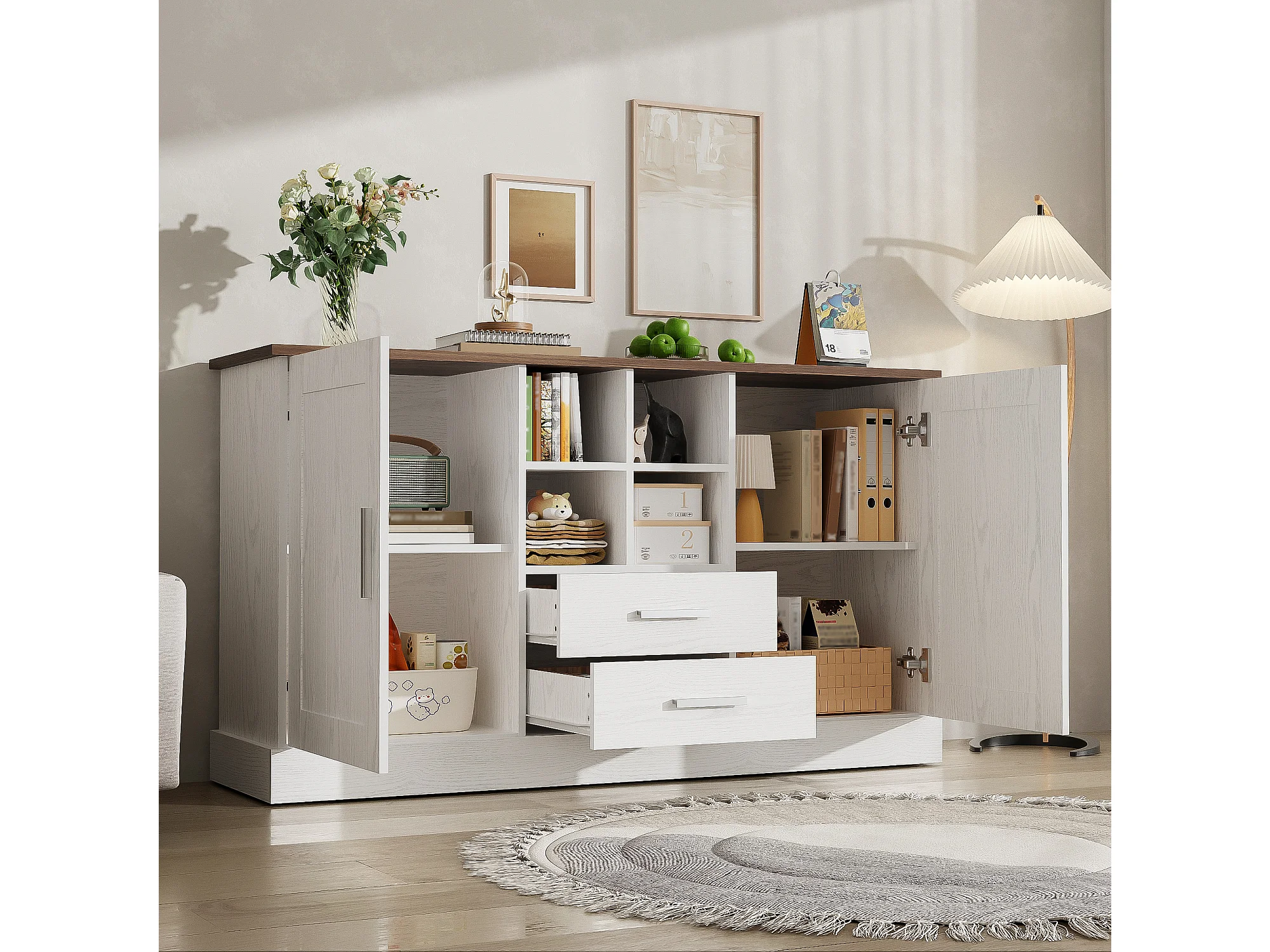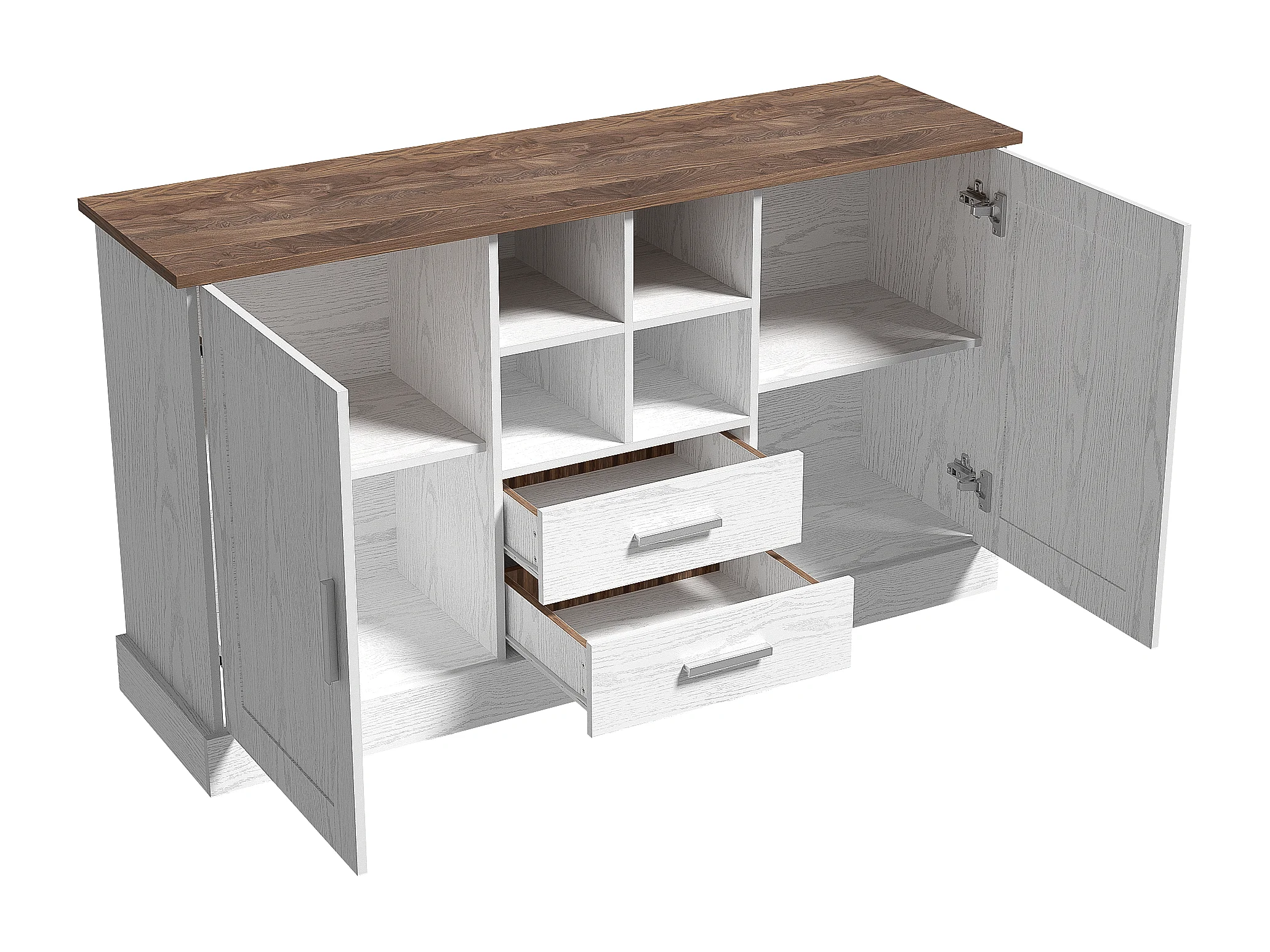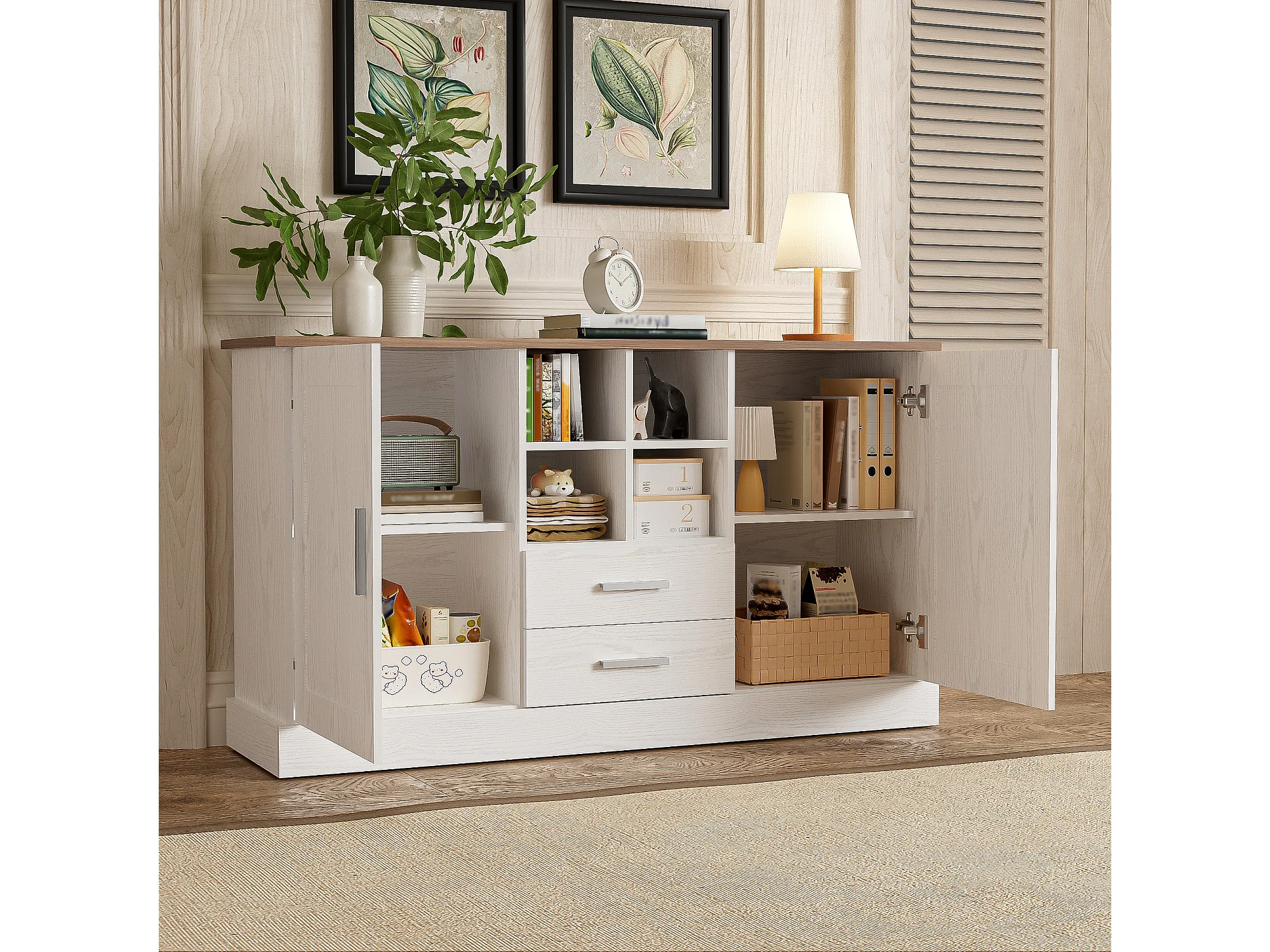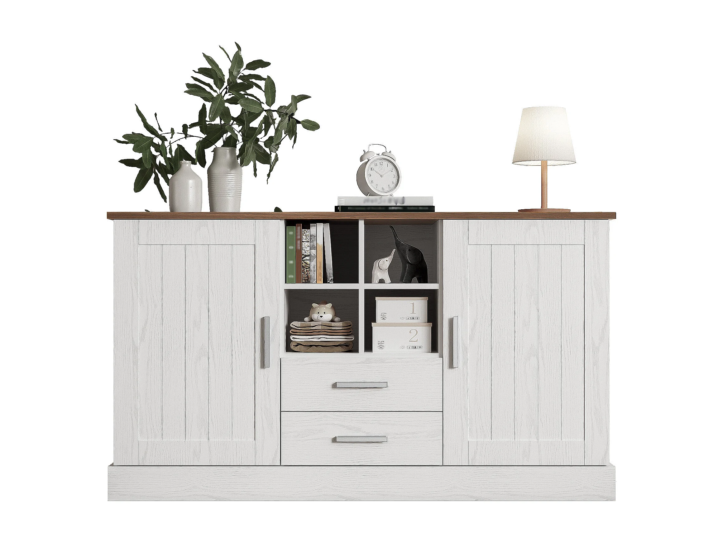 Aparador moderno de madeira branca e marrom 140 cm com 2 portas, 2 gavetas e nichos de armazenamento