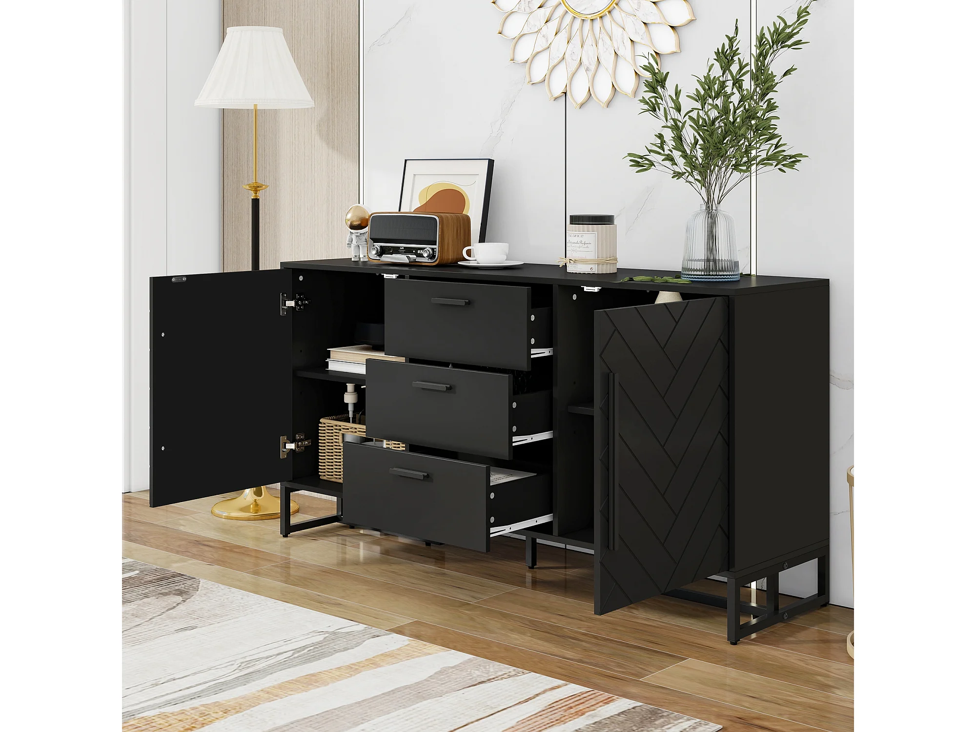 Aparador moderno em MDF preto com 2 portas e 3 gavetas, armazenamento, sala de estar, cozinha, espinha de peixe