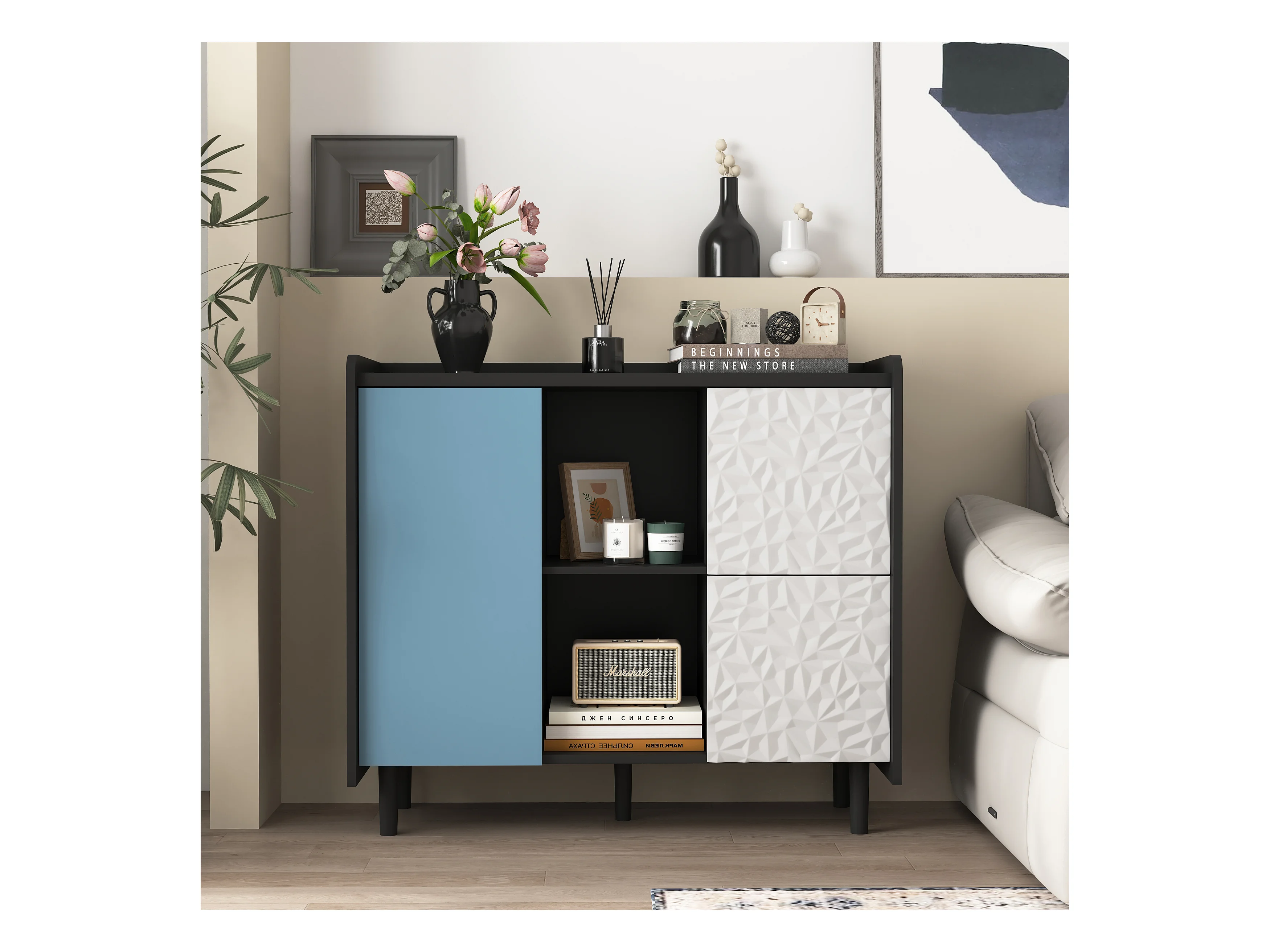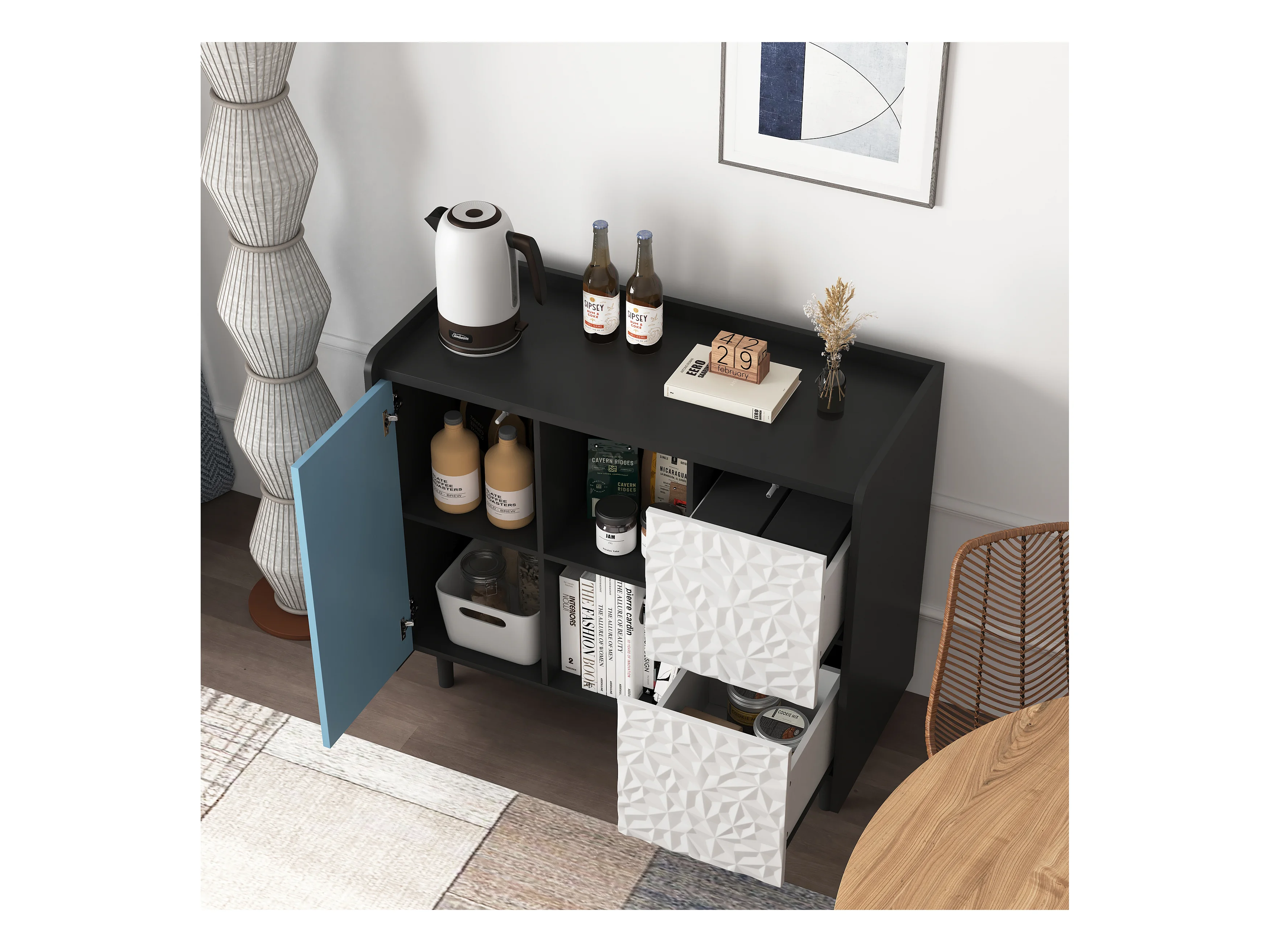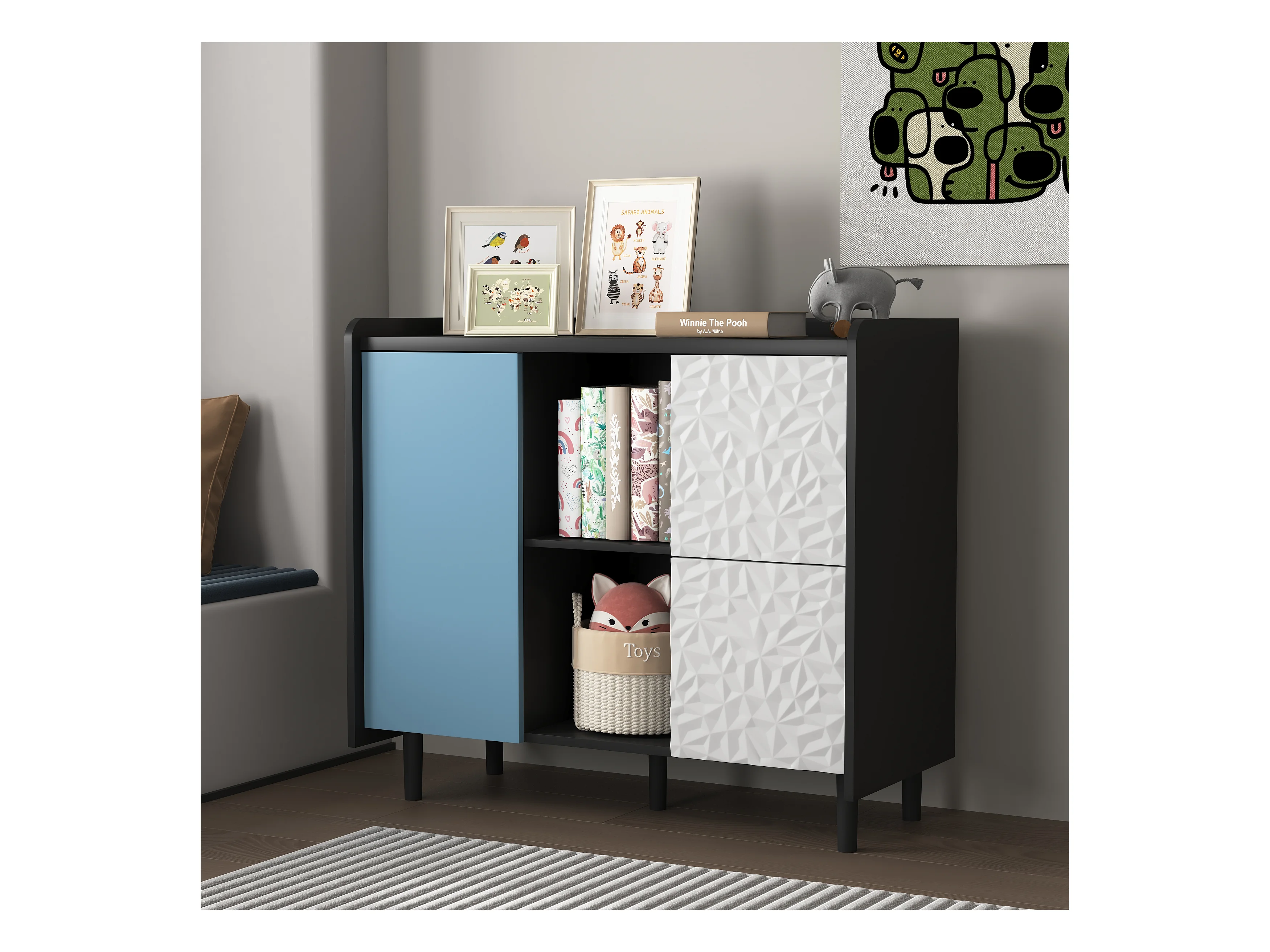Aparador preto com portas azuis, 2 gavetas e 2 nichos abertos, módulo de arrumação 90x40x80 cm