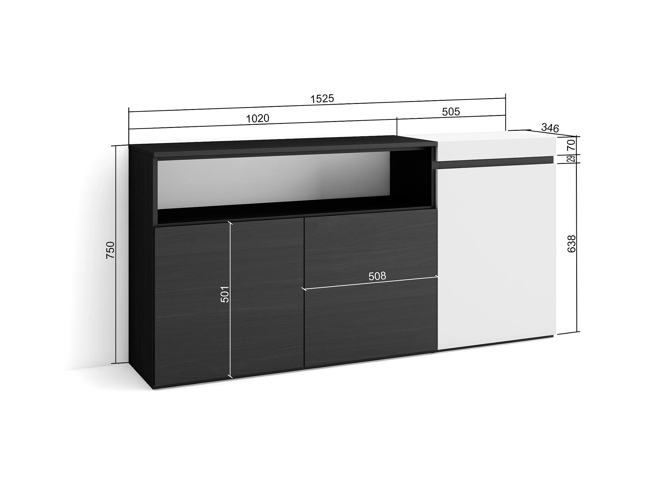 Aparador sala de jantar, 150x35x75cm, 3 Portas, Armário arrumação, Branco e preto