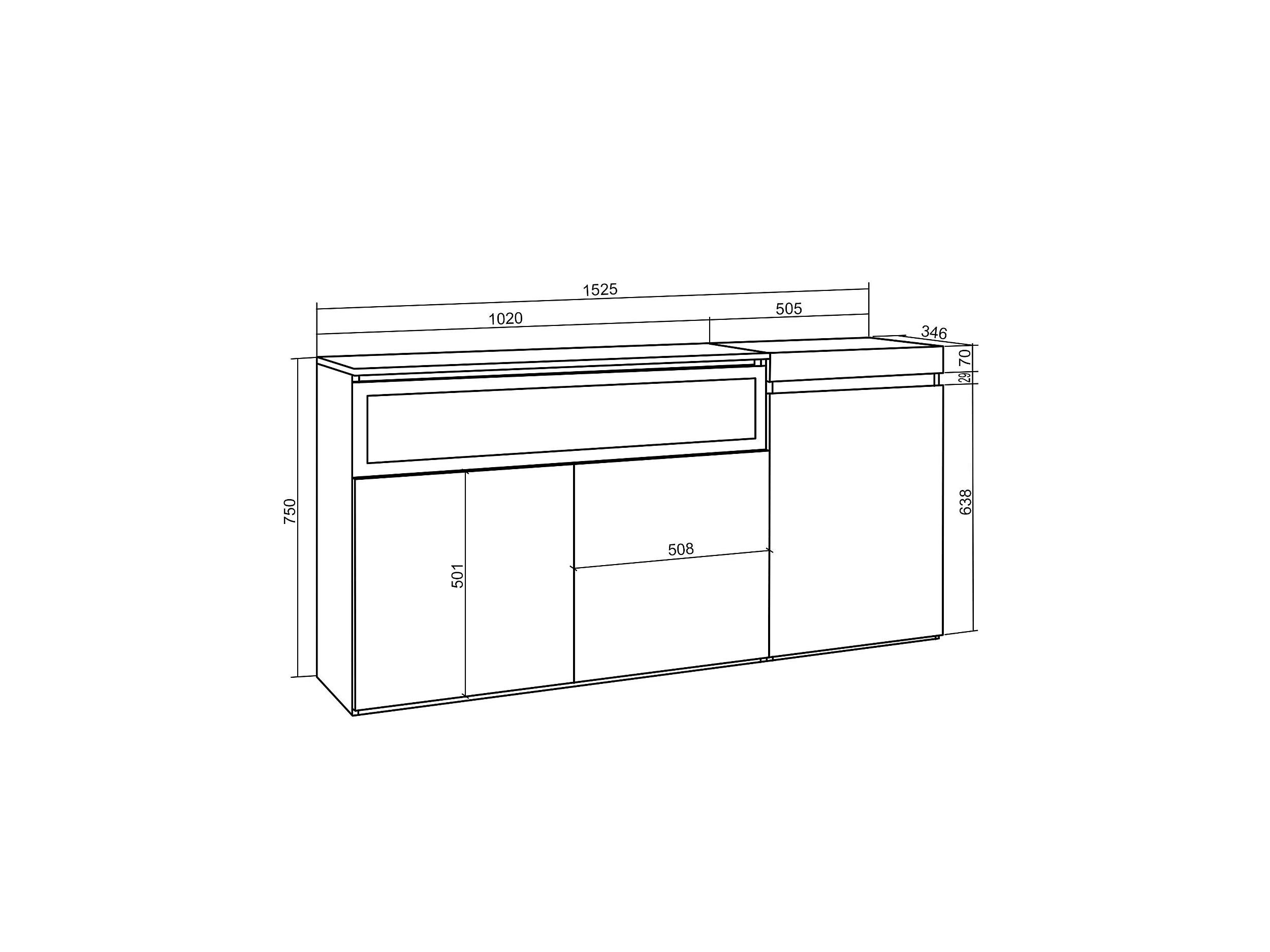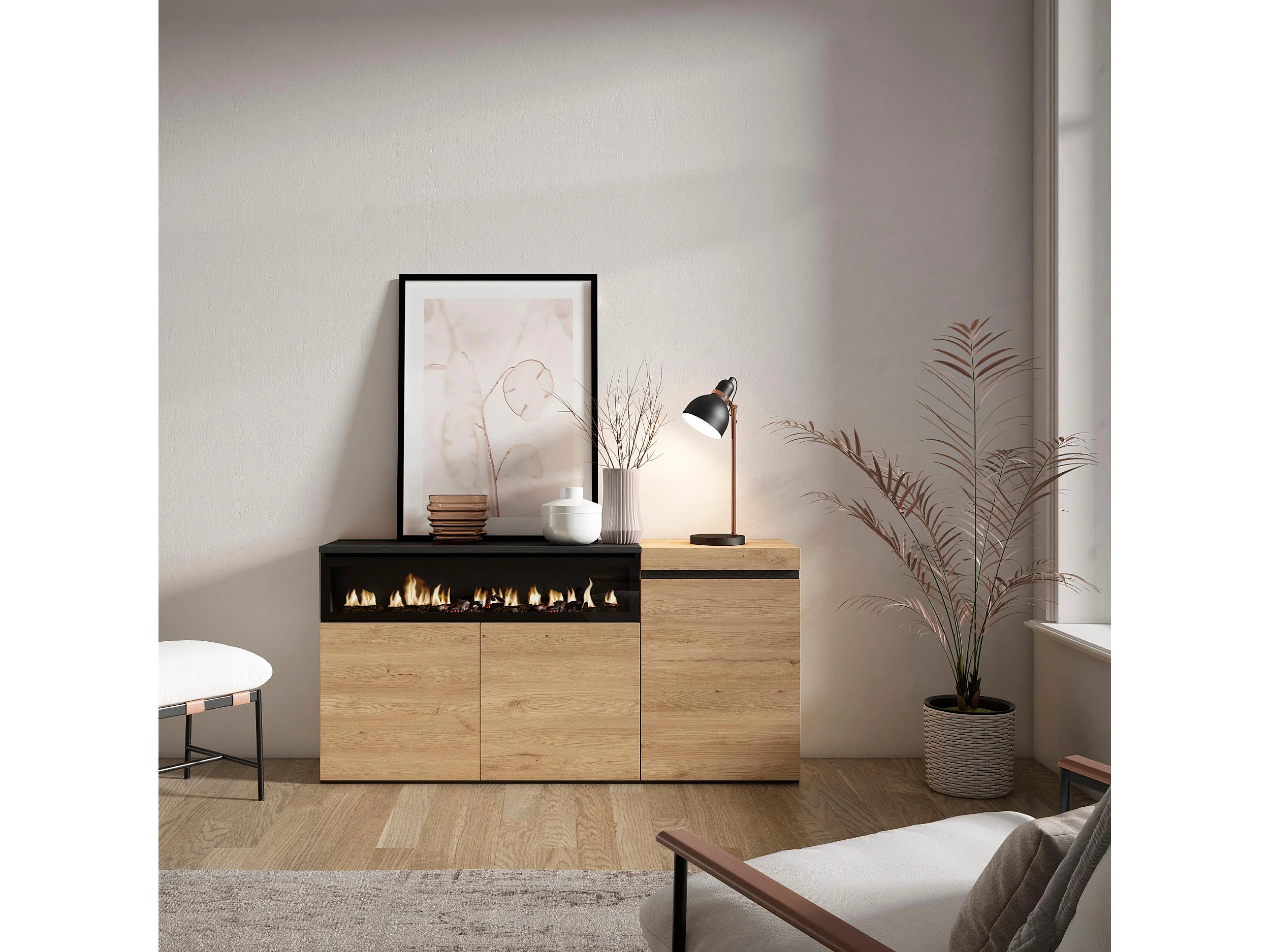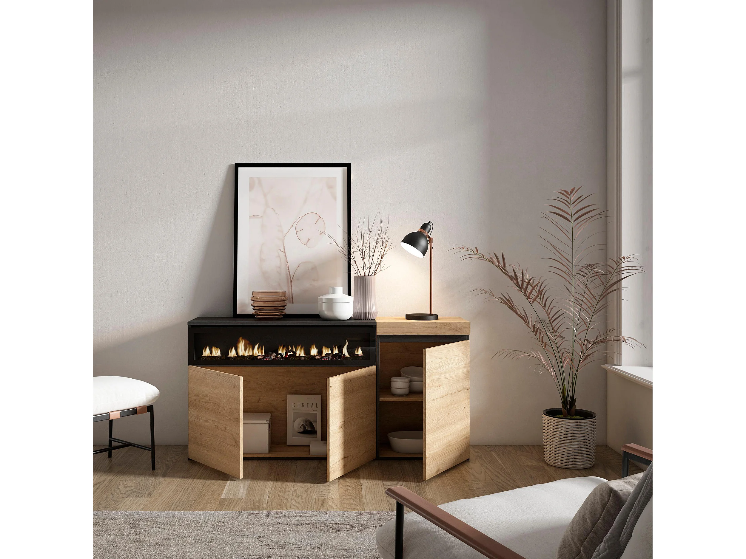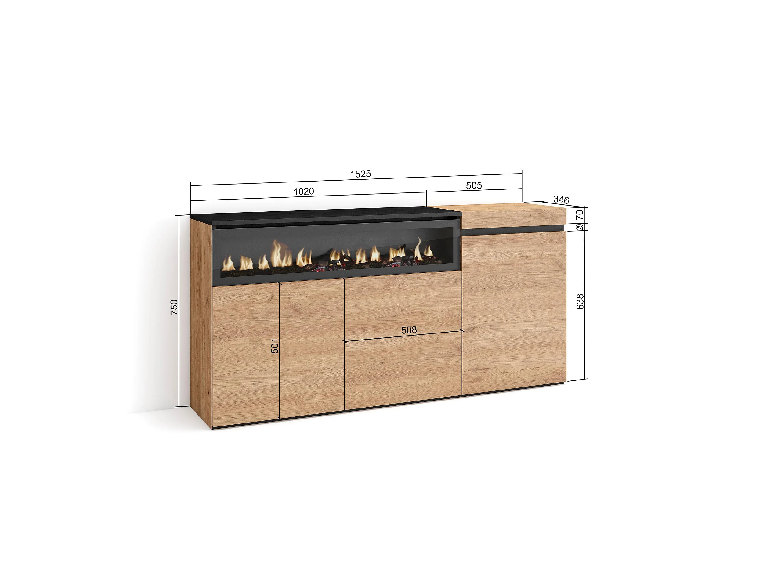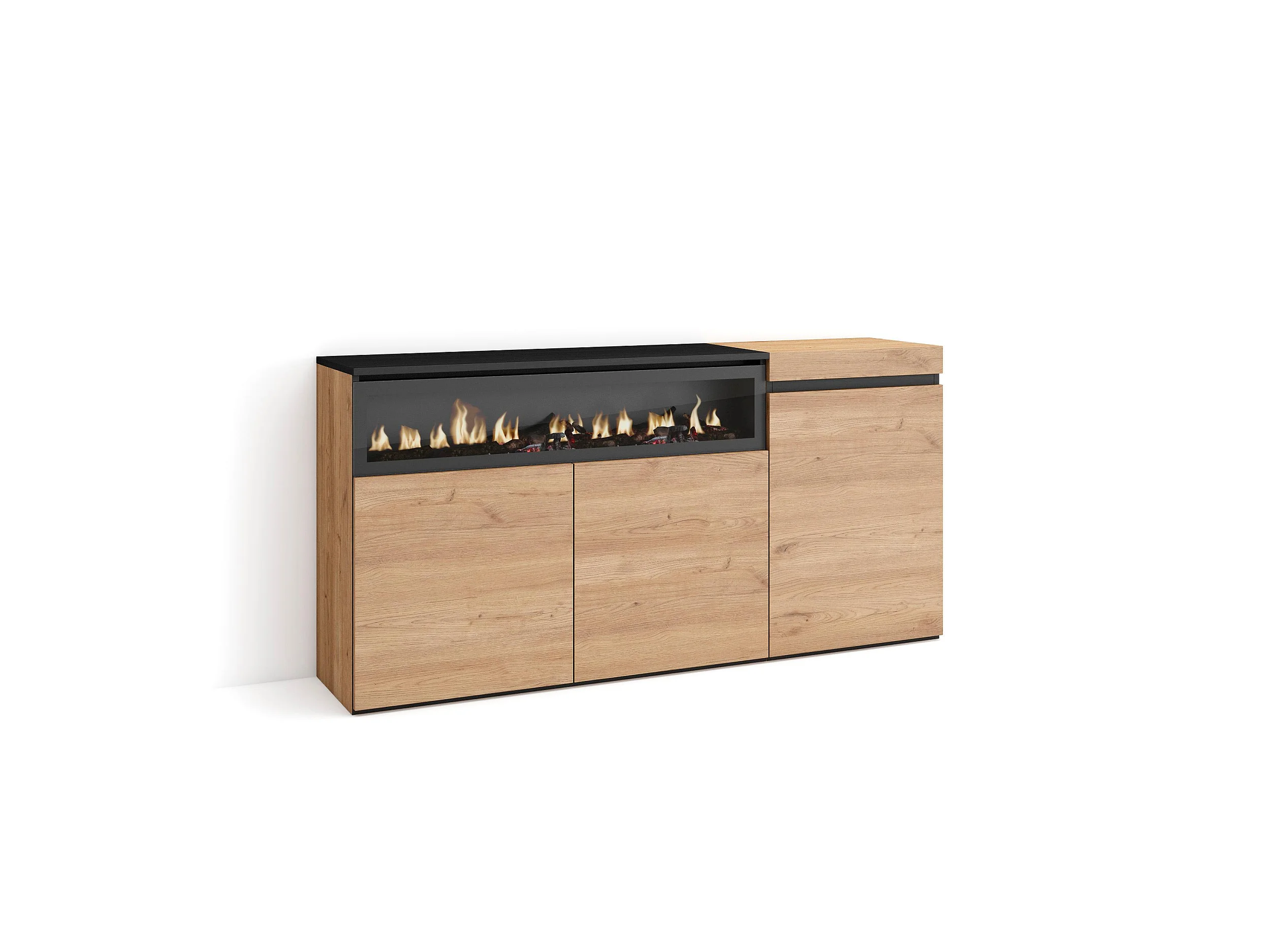 Aparador sala de jantar, 150x35x75cm, 3 Portas, Lareira eléctrica, Carvahlo e preto