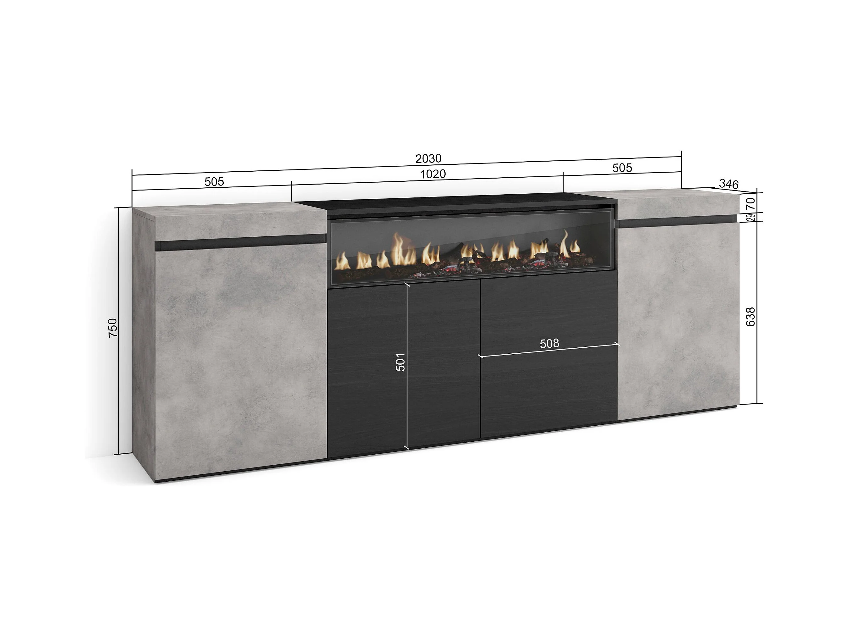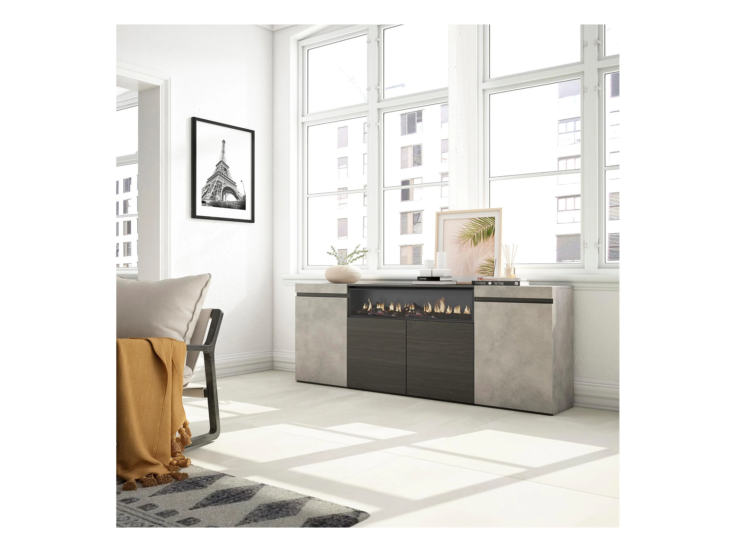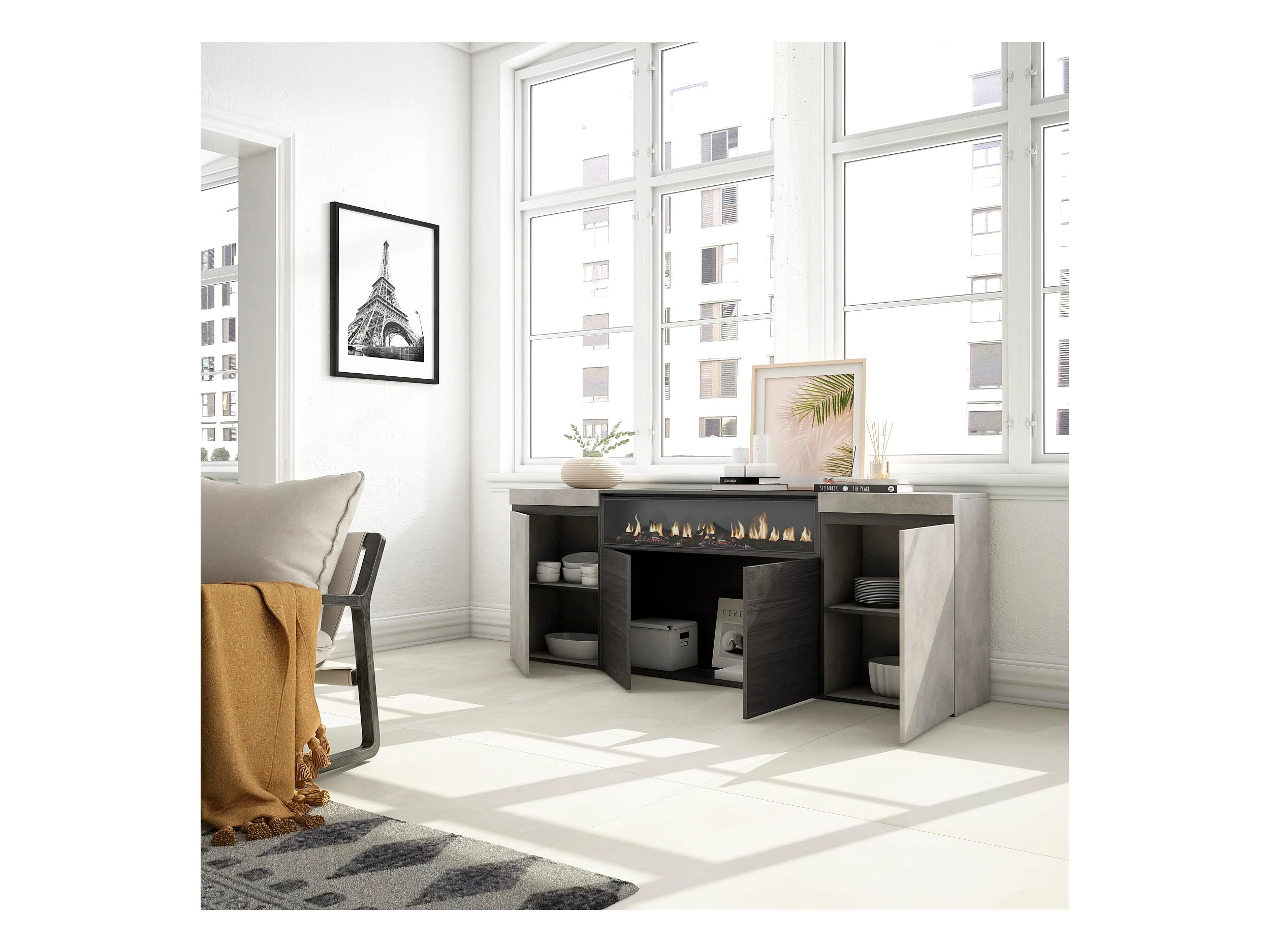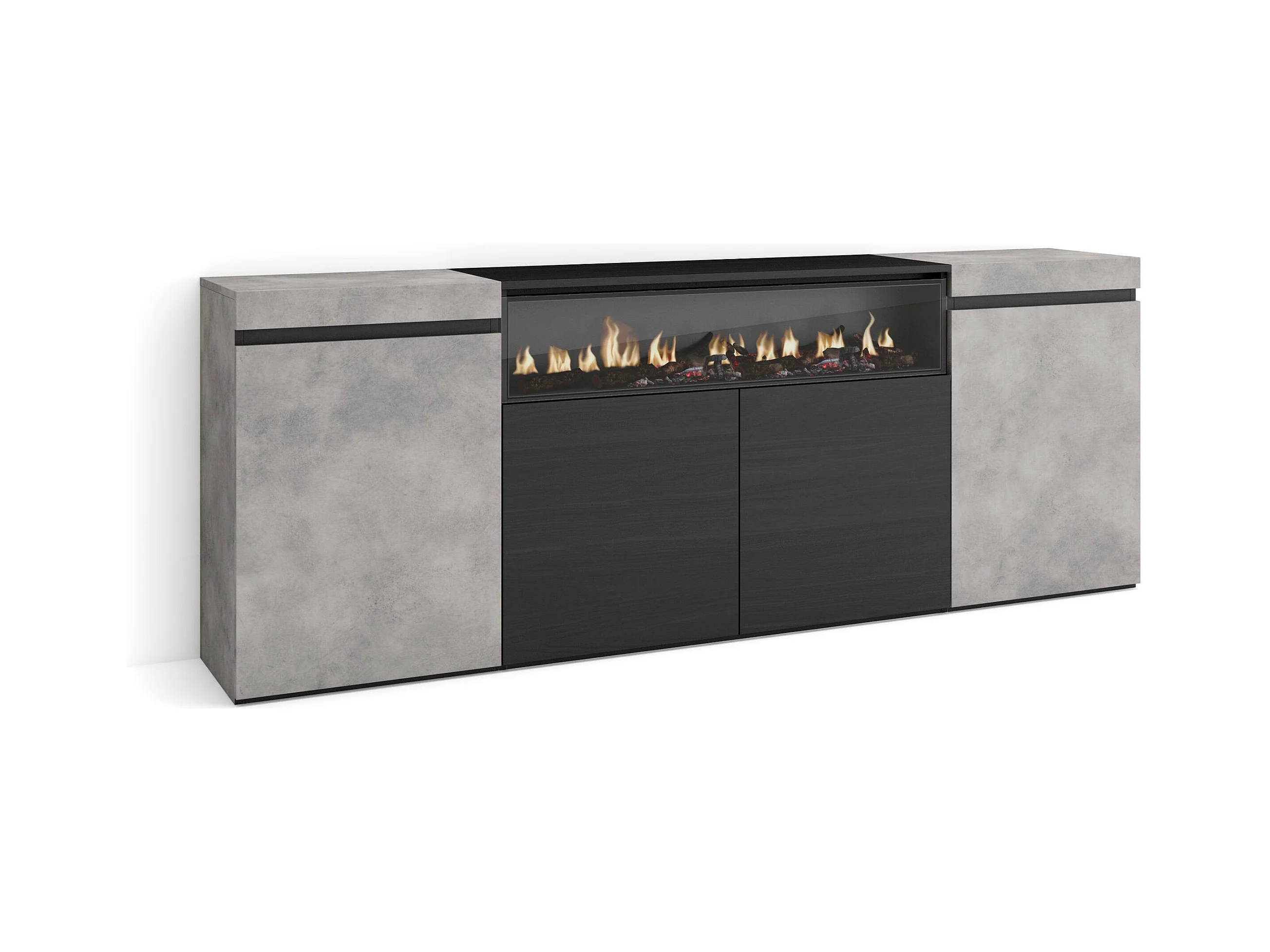 Aparador sala de jantar, 200x35x87cm, 4 Portas, Lareira eléctrica, Design industrial, Cimento