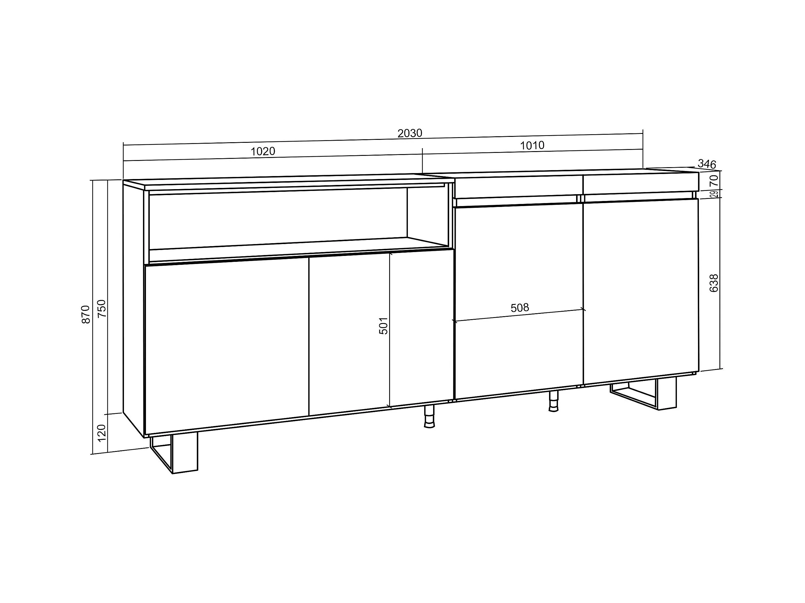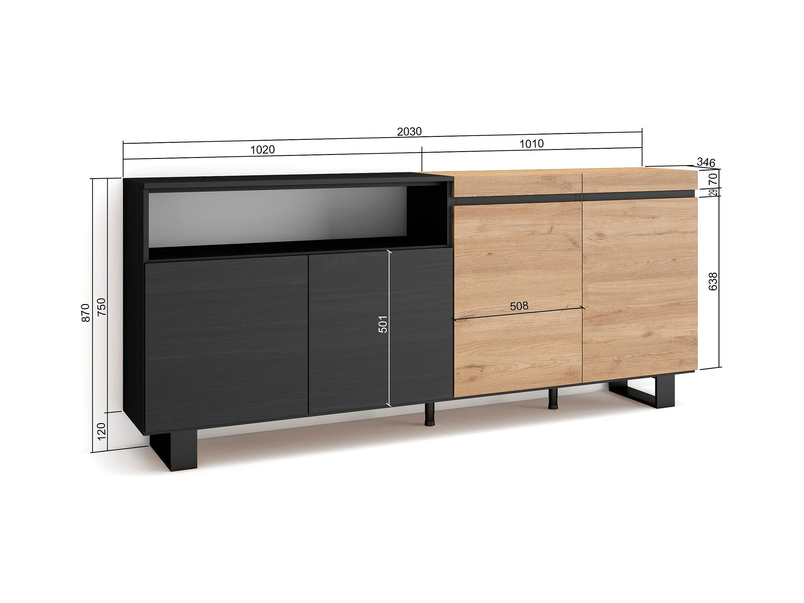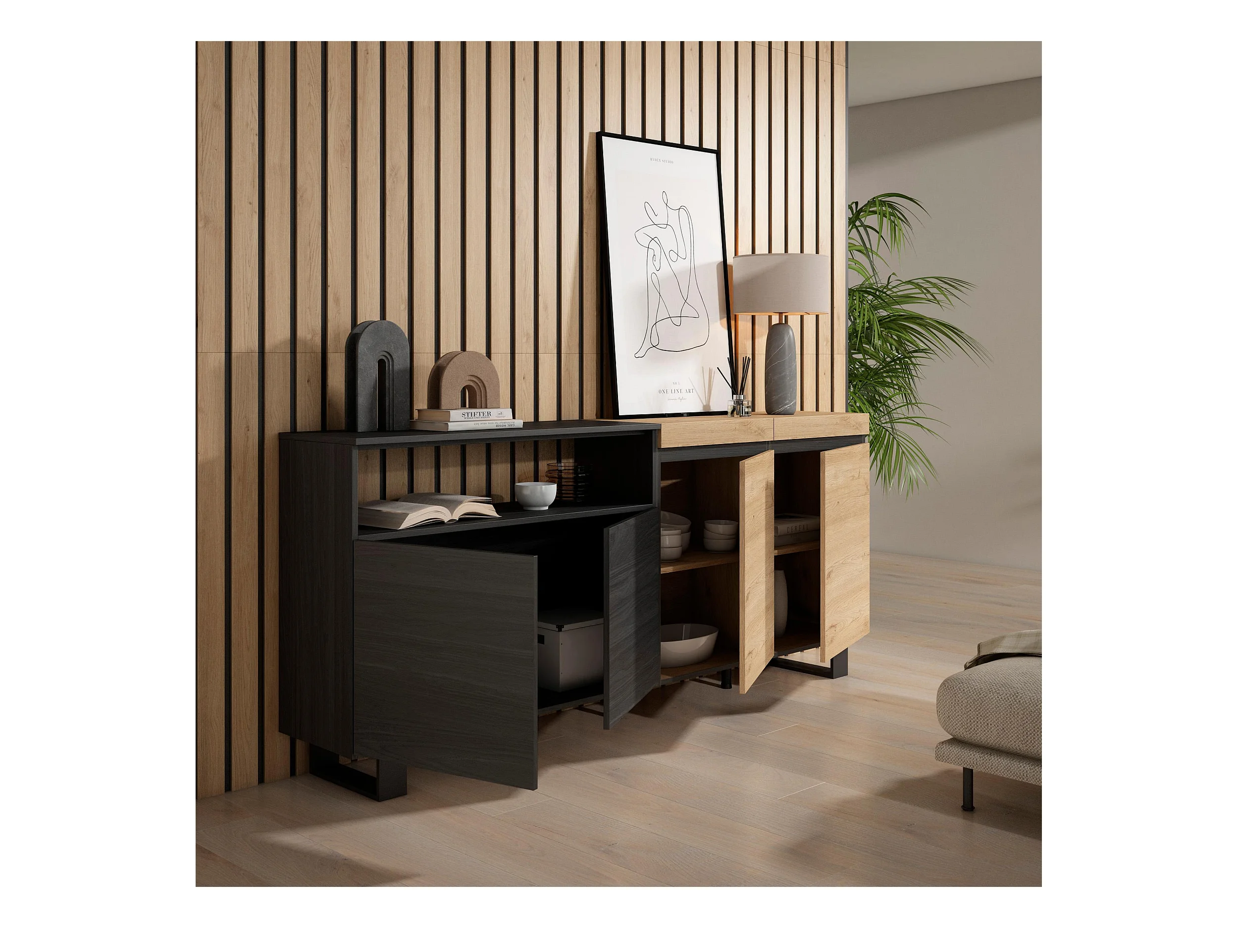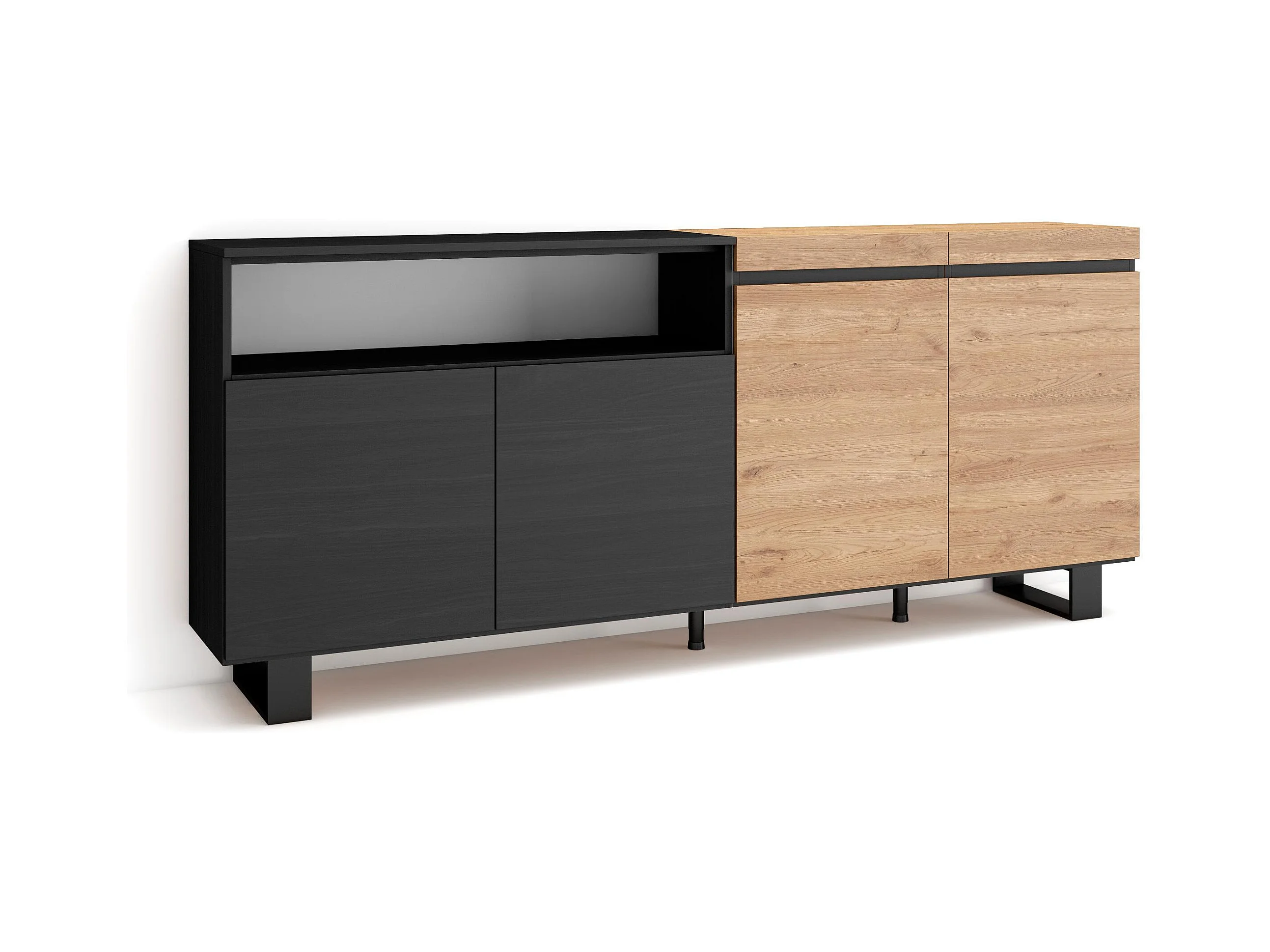 Aparador sala de jantar, 200x35x87cm, 4 Portas, Design industrial, Carvahlo e preto