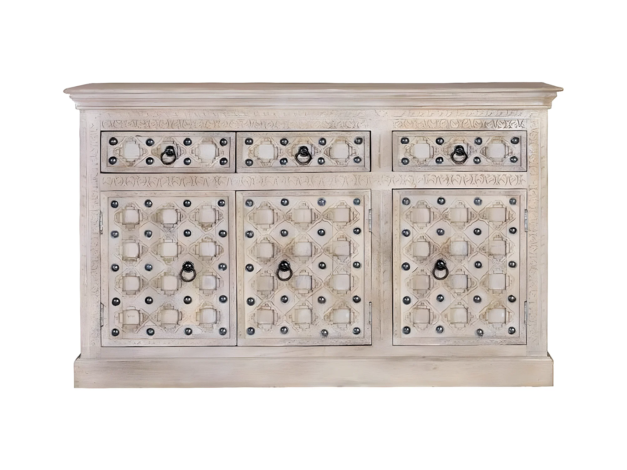 Aparador em madeira maciça de manga com três gavetas e três portas