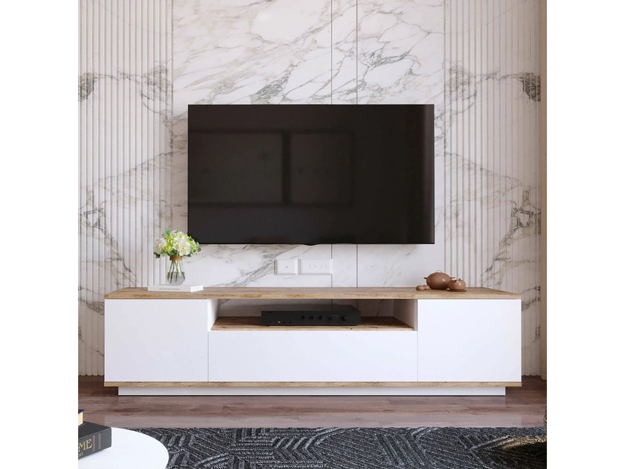 Armário de suporte de TV Dpierott, Aparador de sala, Armário de TV baixo, Base de parede equipada, 180x45h45 cm, Carvalho e Branco