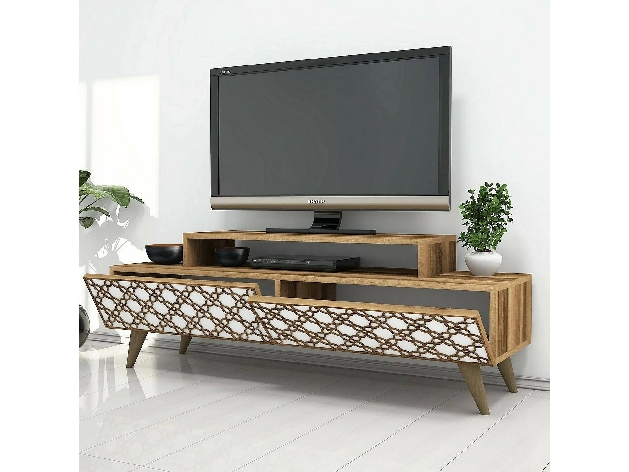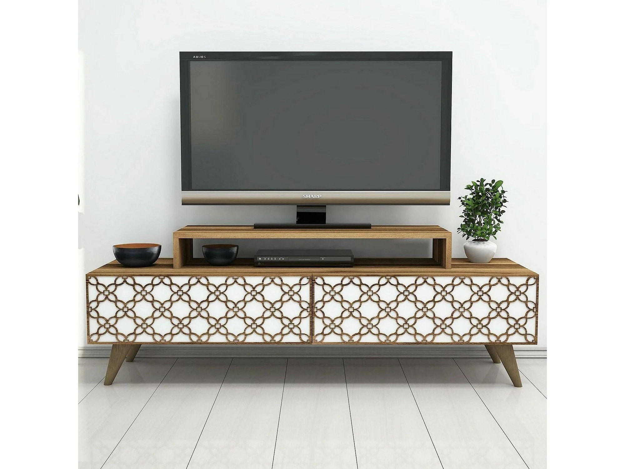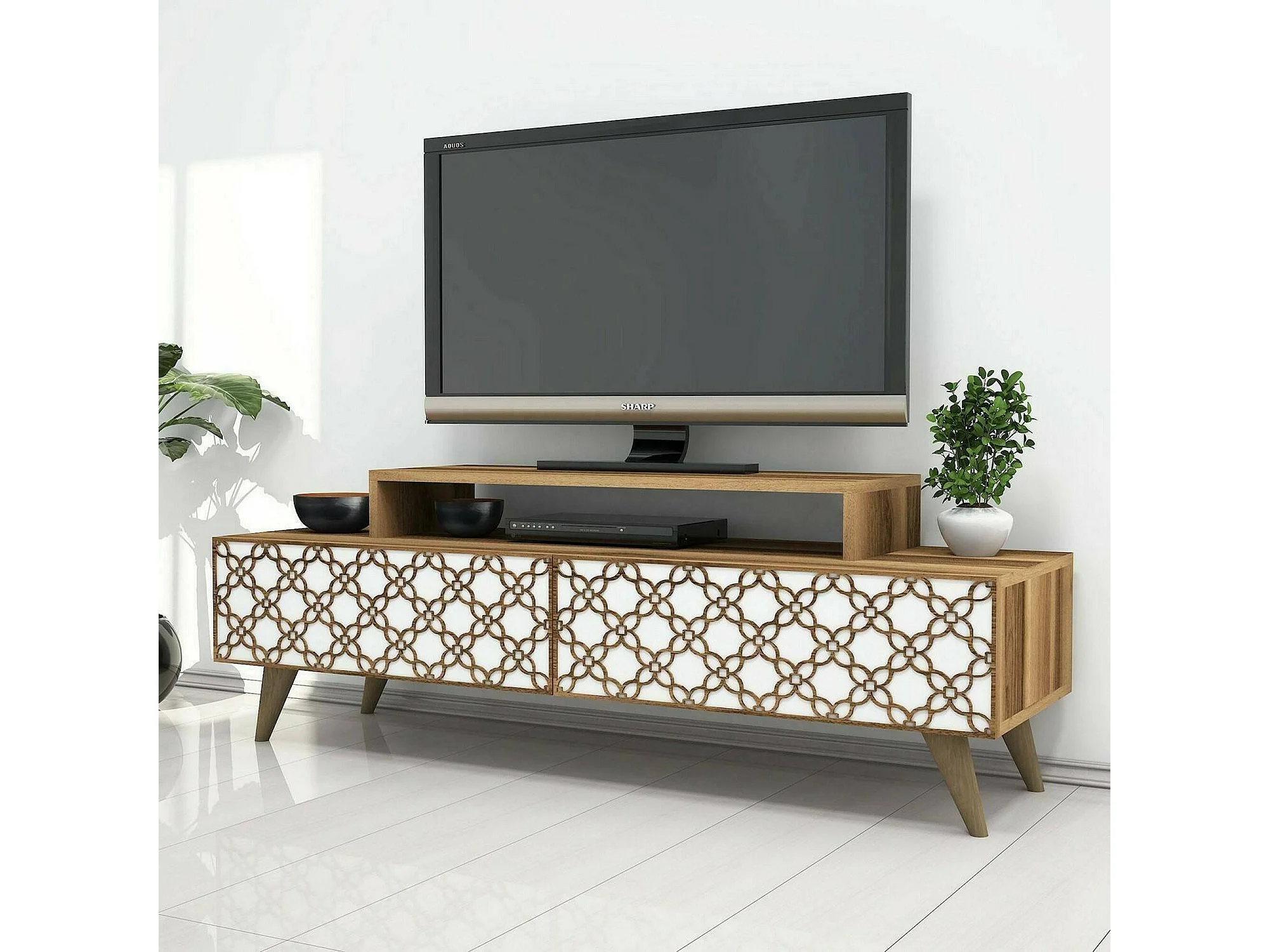 Armário de TV DpieroBo, Aparador de sala, Armário de TV baixo, Base de parede equipada, 140x42h49 cm, Nogueira e Branco