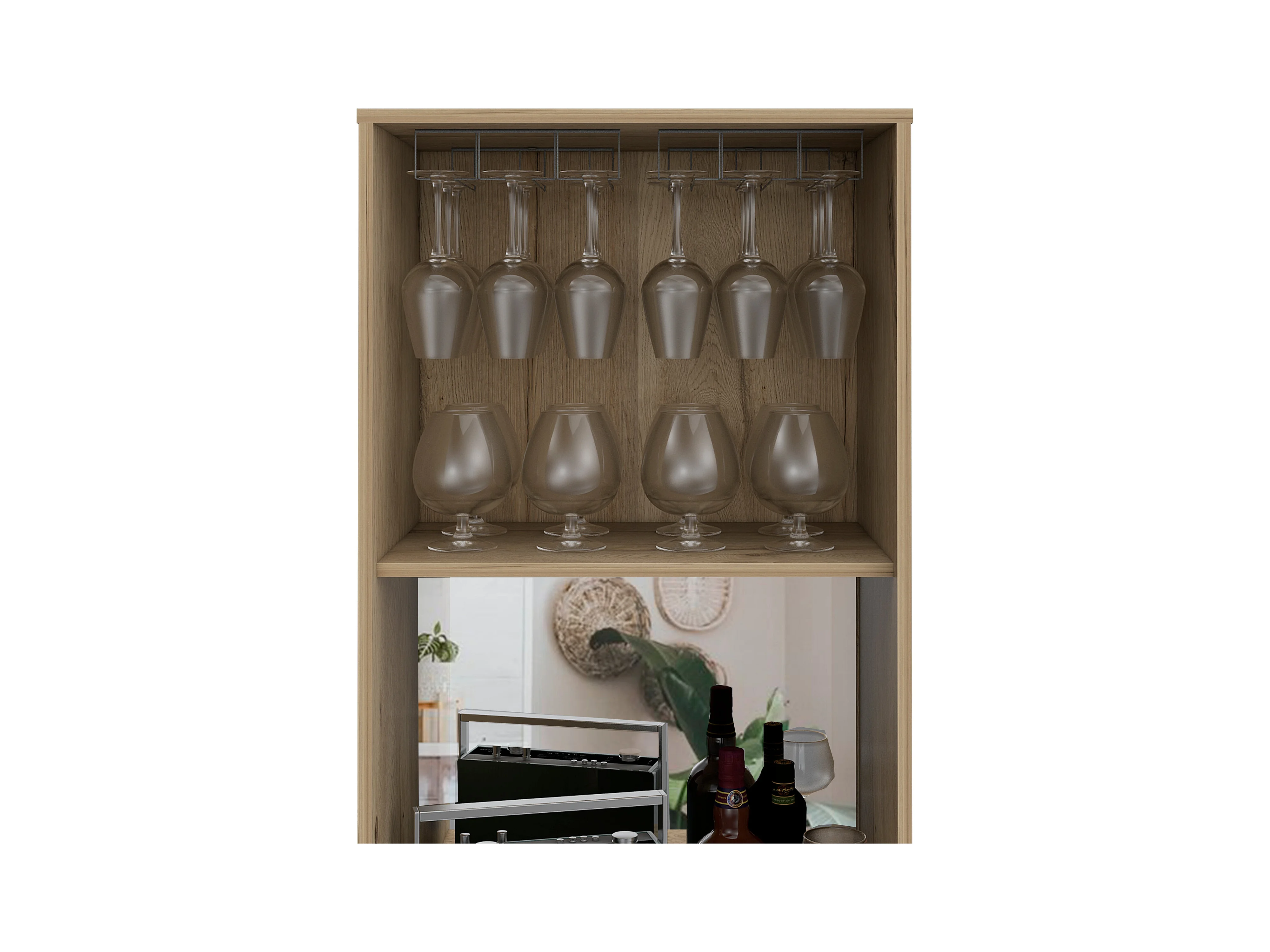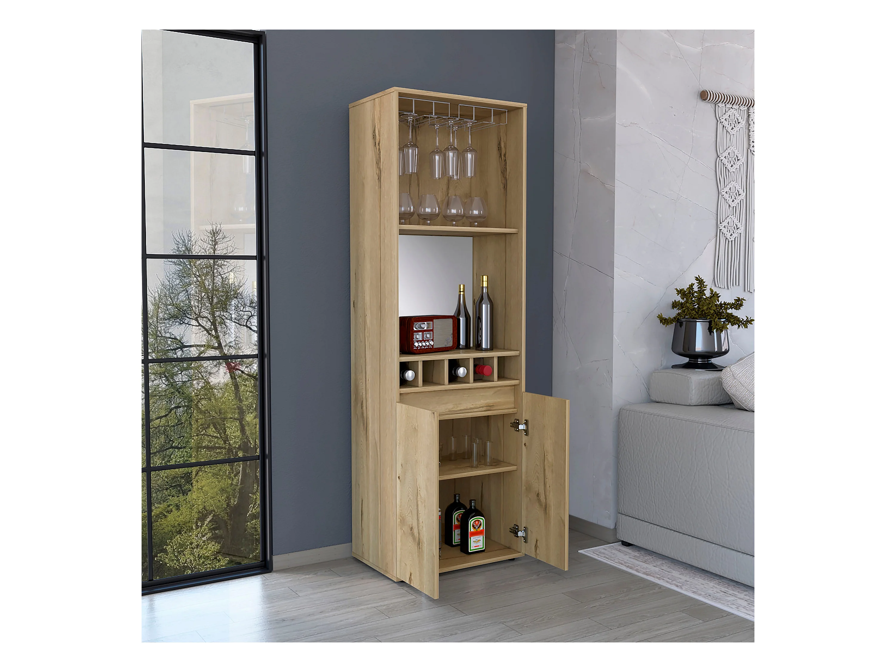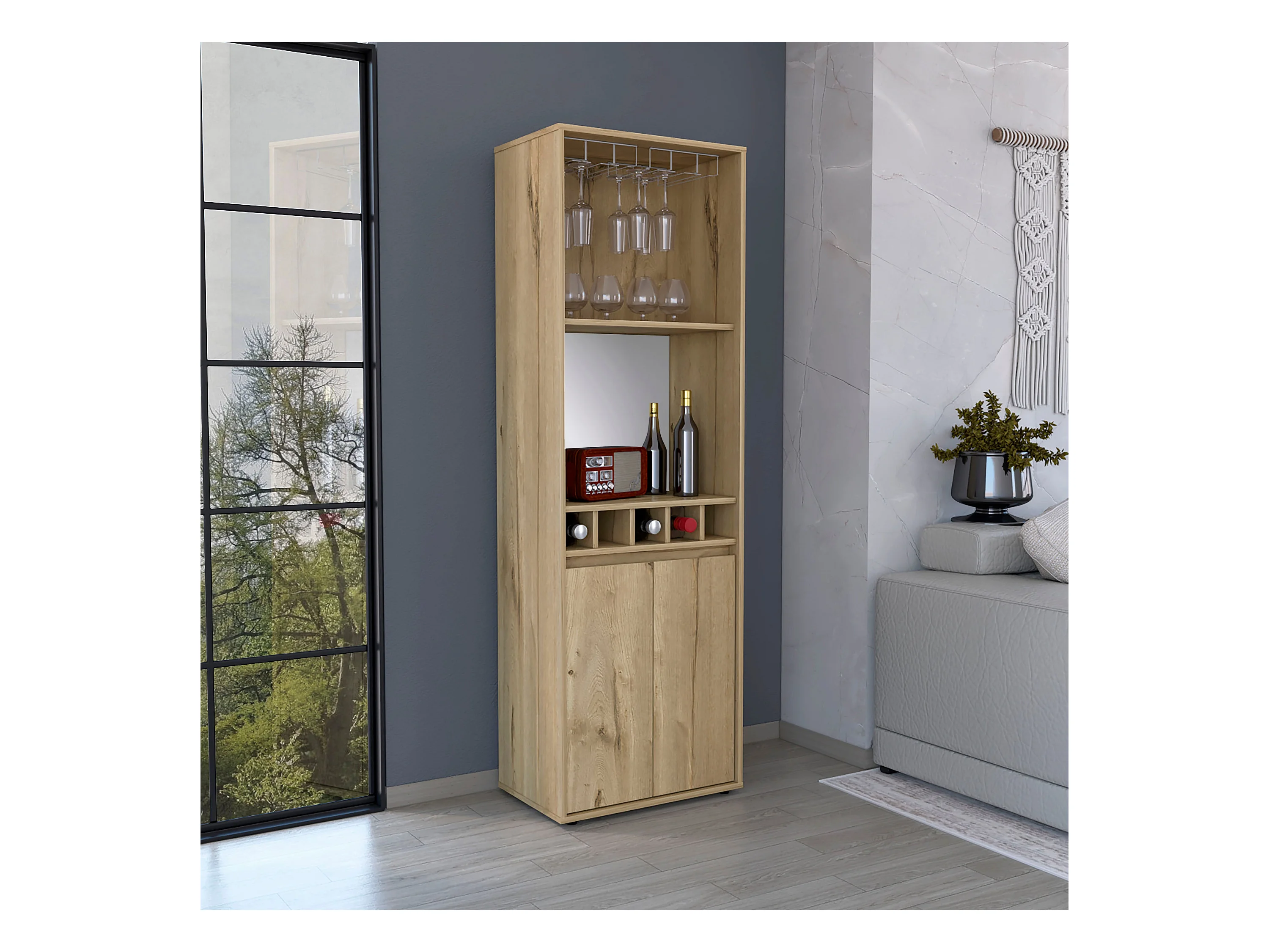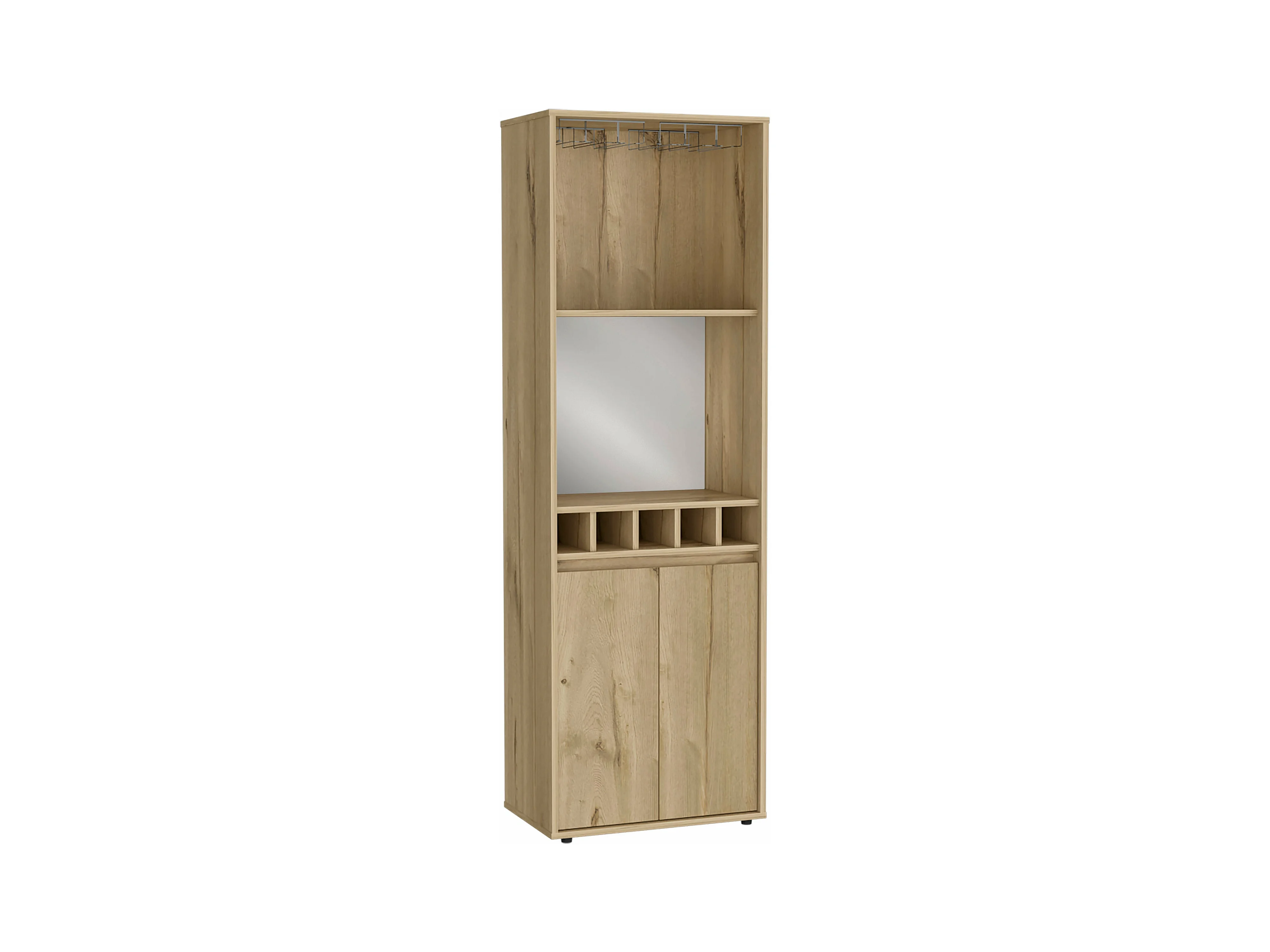 Armário bar em melamina Prana com 4 prateleiras, 2 portas, 4 suportes para garrafas e 6 suportes para copos, bege, 180 cm X 58.4 cm X 37 cm