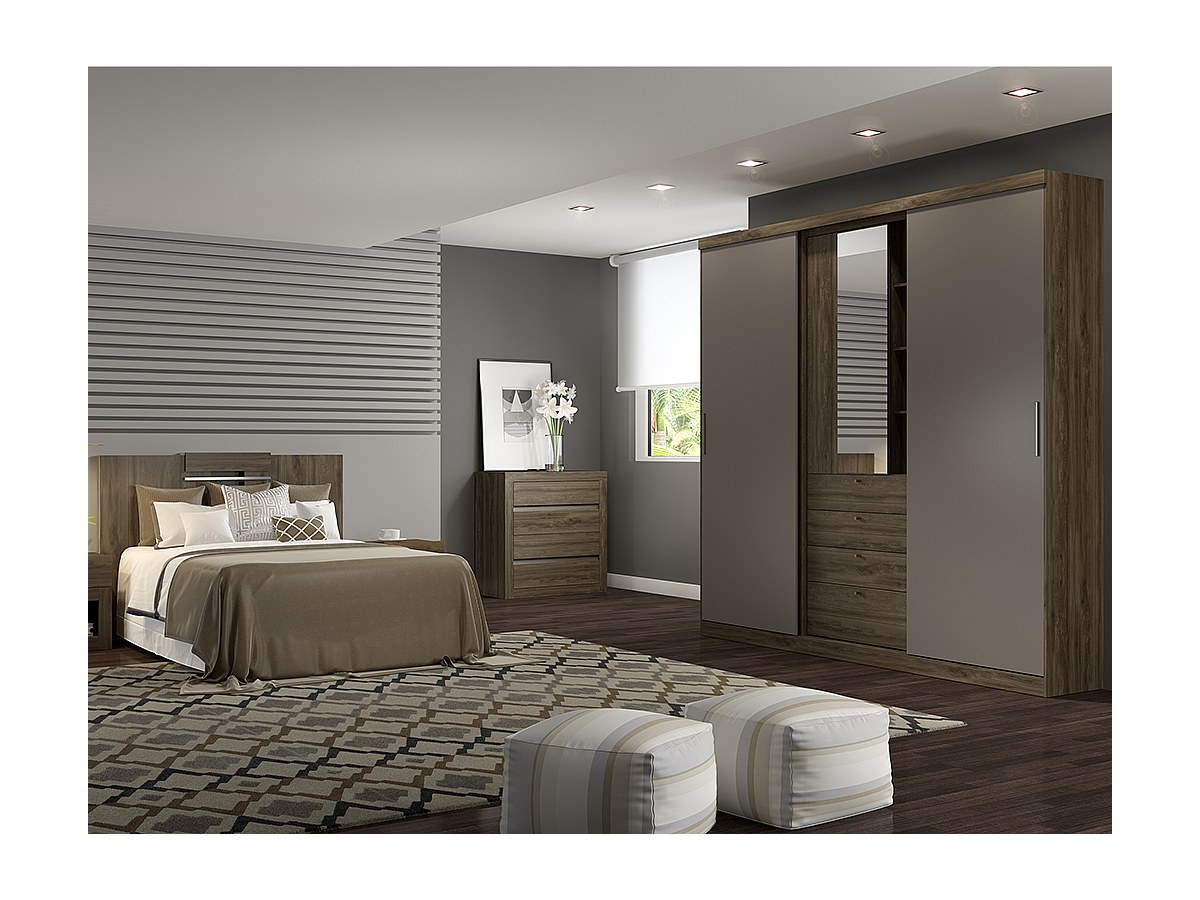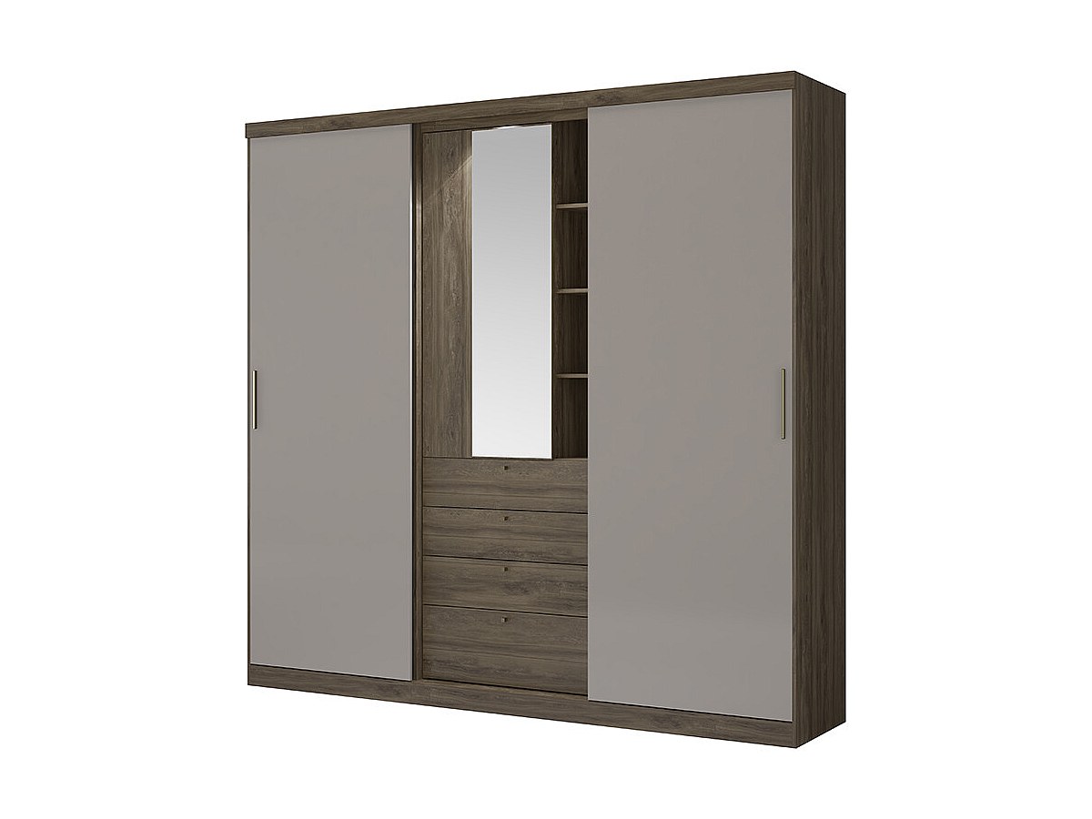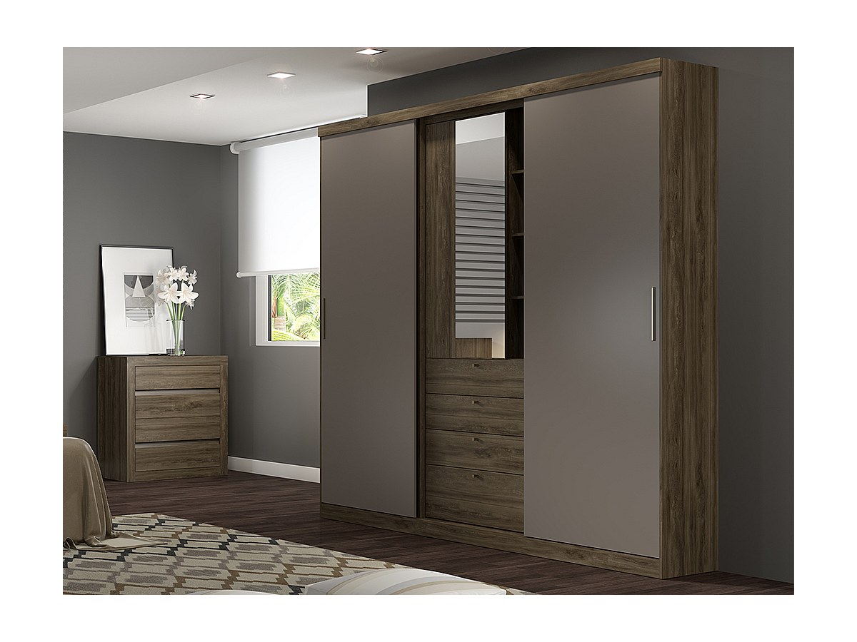 Armário BODIL - portas deslizantes - Espelho e gavetas - C240 cm - Chocolate e toupeira