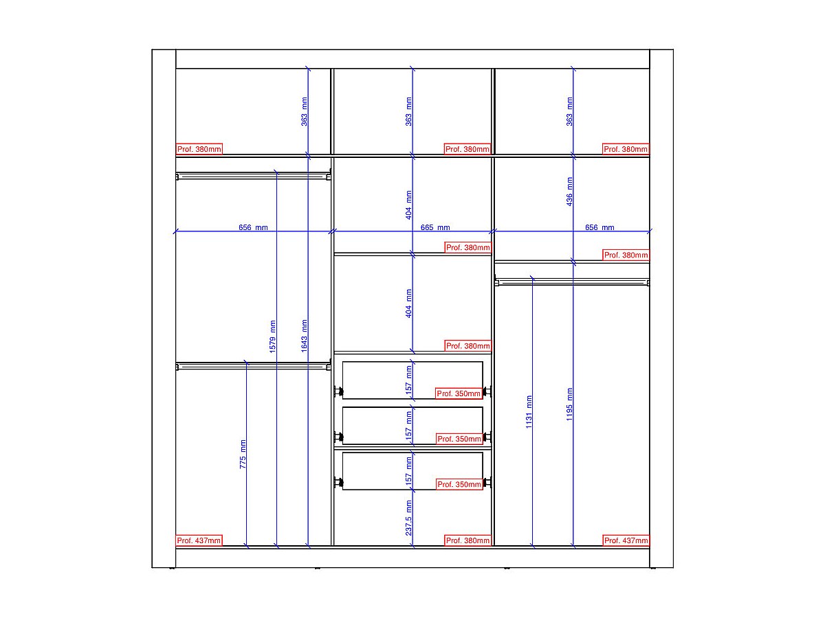 - Interior: 3 barras de pendurados, 6 prateleiras e 3 gavetas