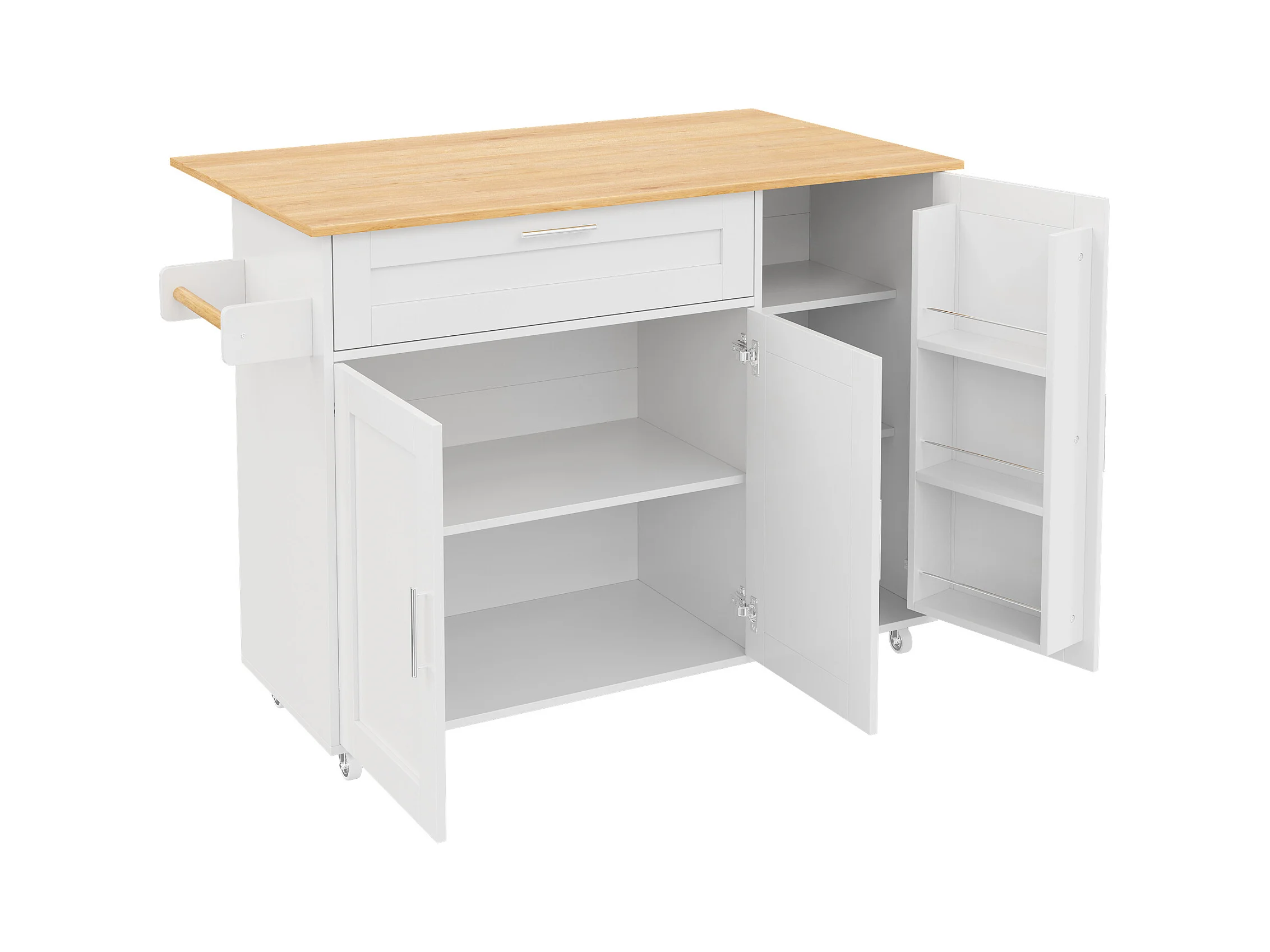 Armário de cozinha, mesa de cozinha móvel, bancada dobrável, porta-tempero, toalheiro, 5 rodas, 132,5x44(70)x90 cm, Branco