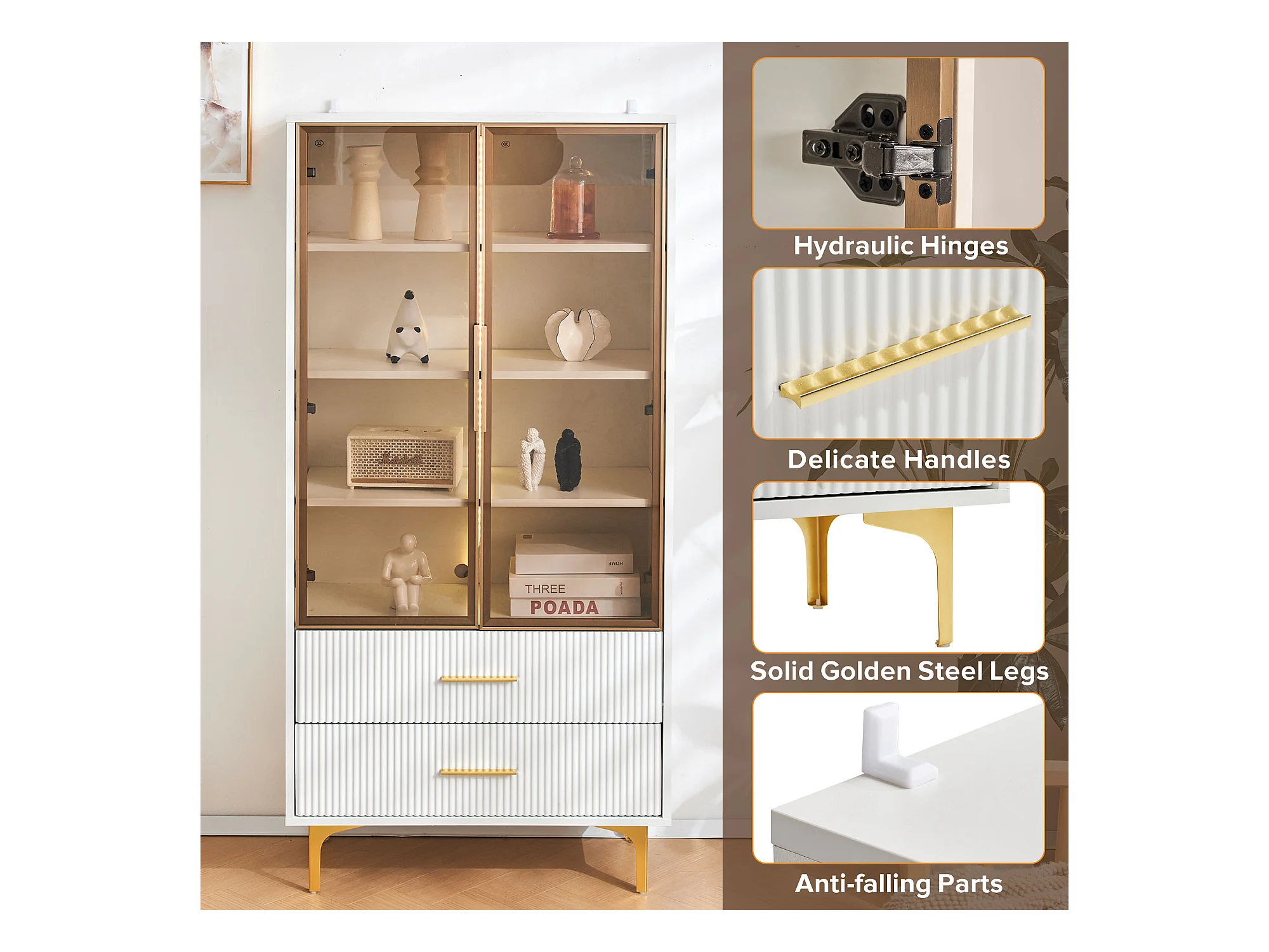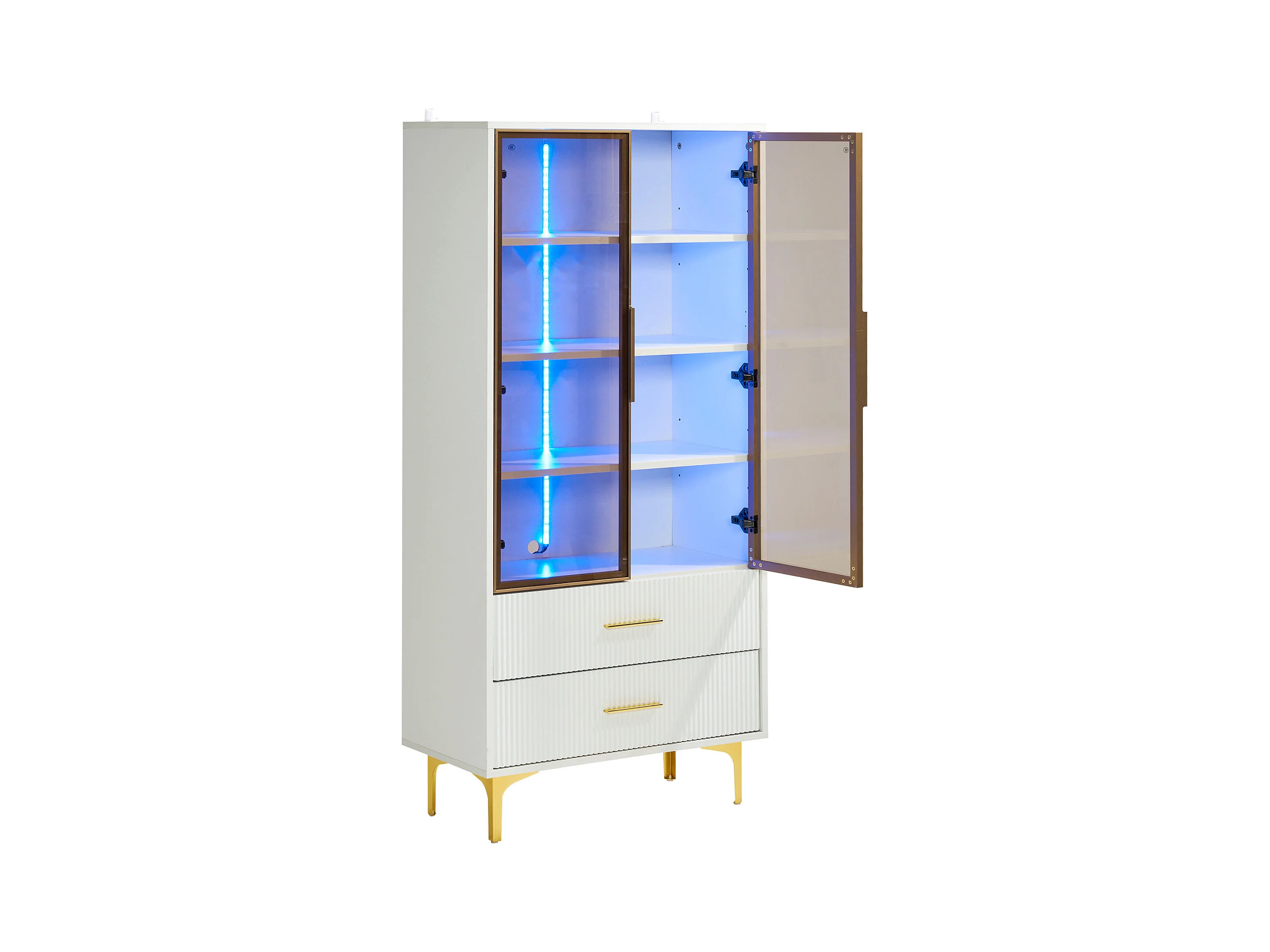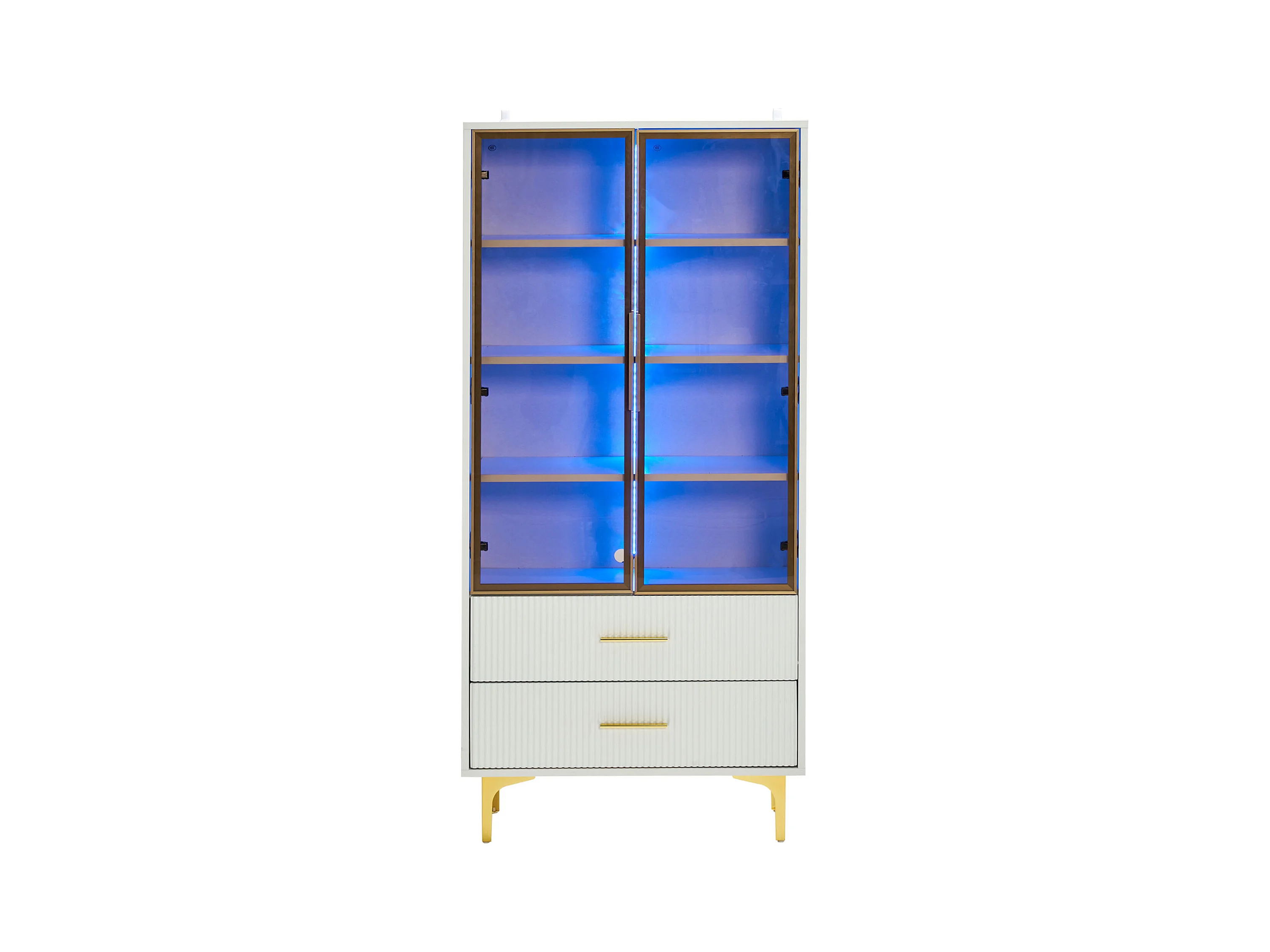 Armário de exposição LED branco com portas de vidro e gavetas, 70x35x150cm, sala de estar moderna