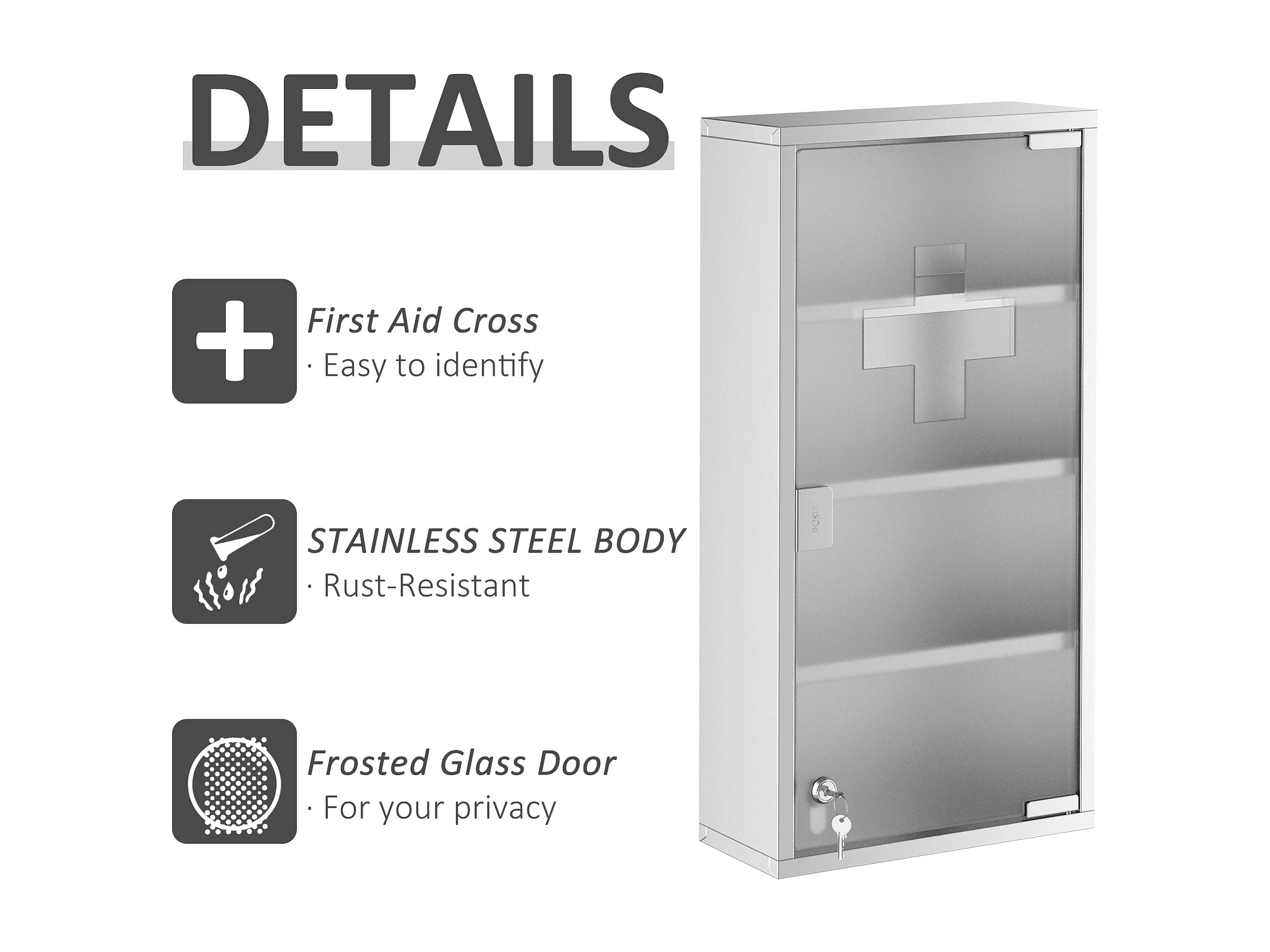 Armário de remédios de aço inoxidável com fechadura e porta de vidro opaco para montagem na parede do banheiro 30×12×60 cm