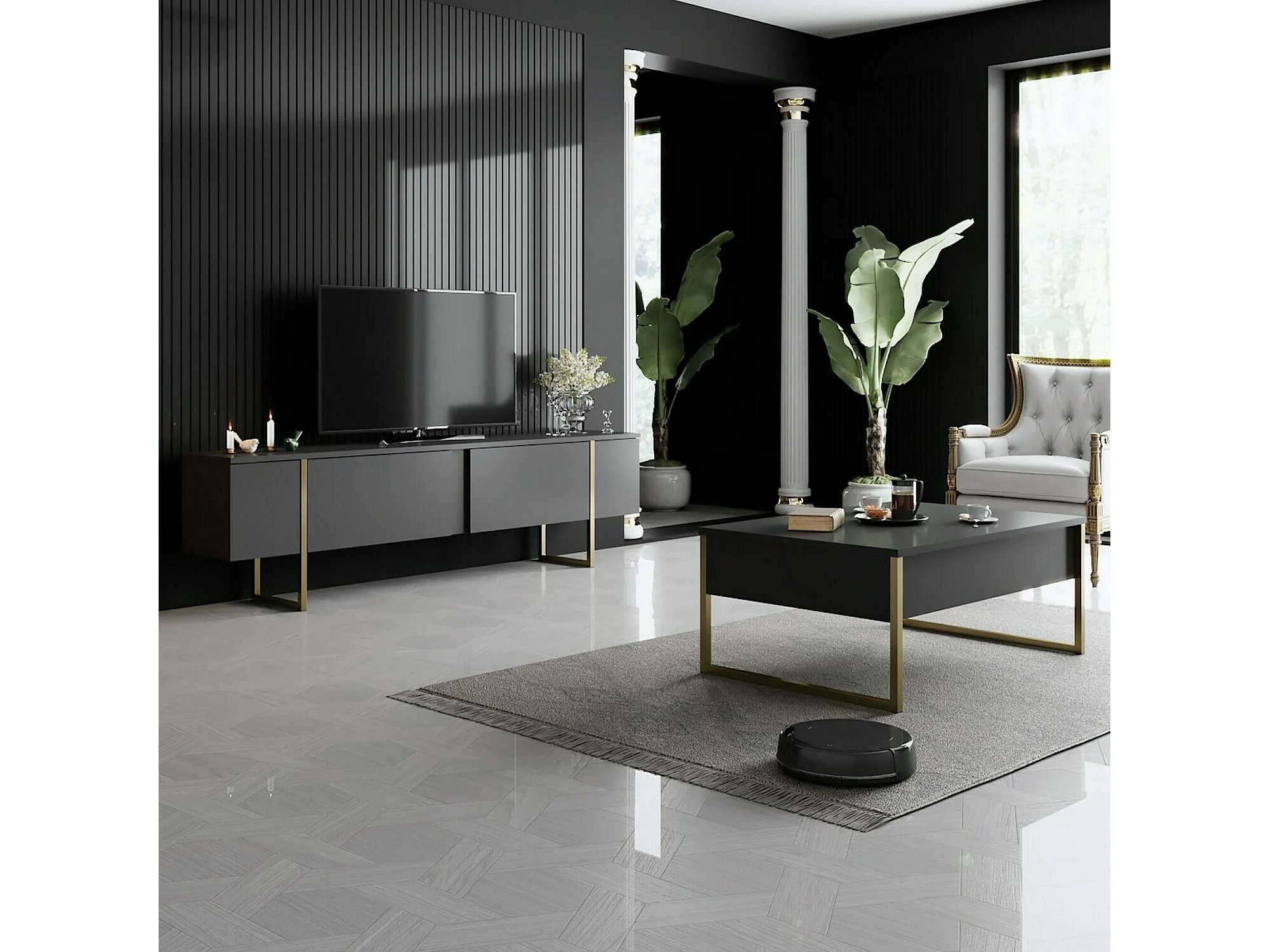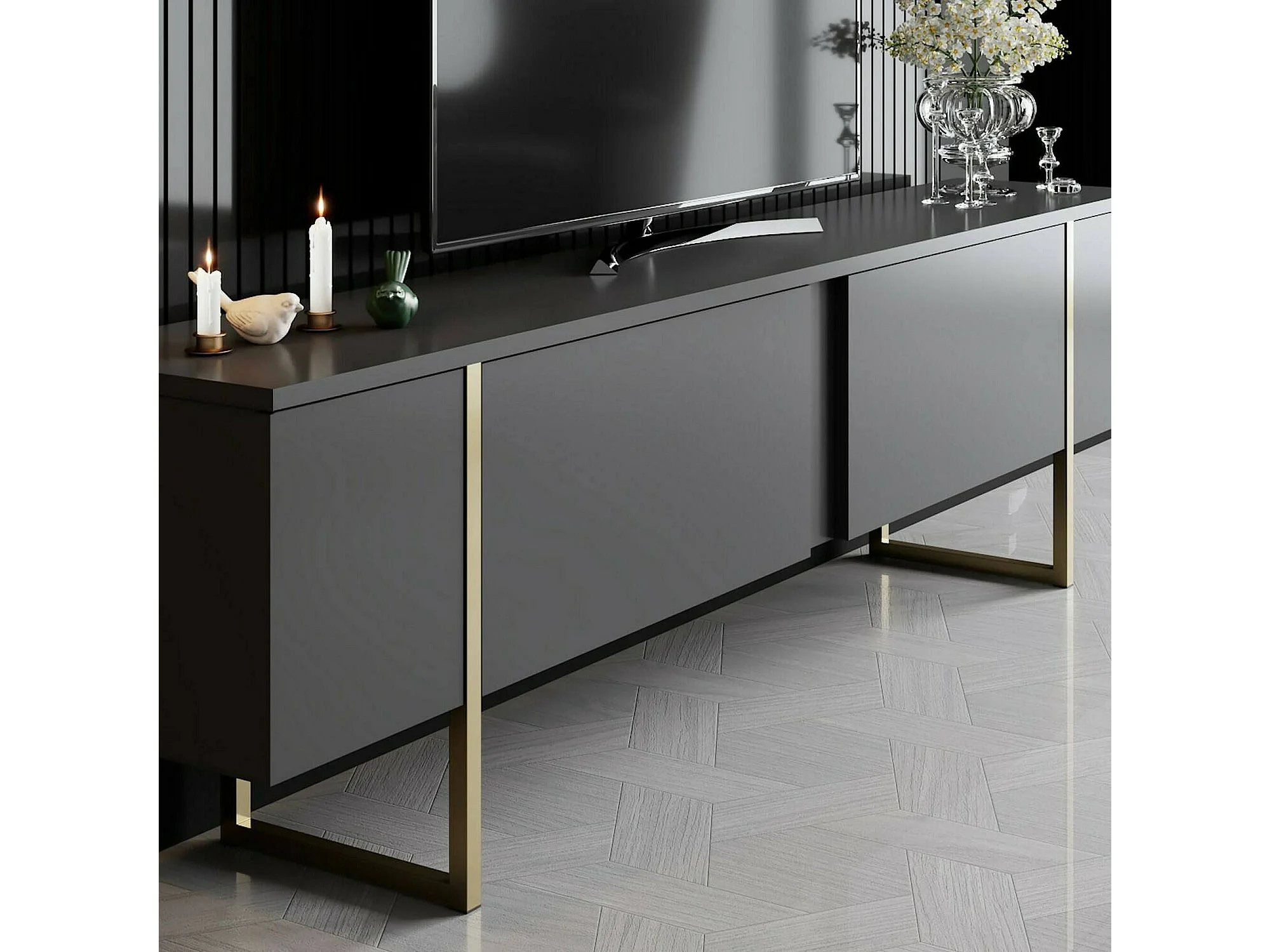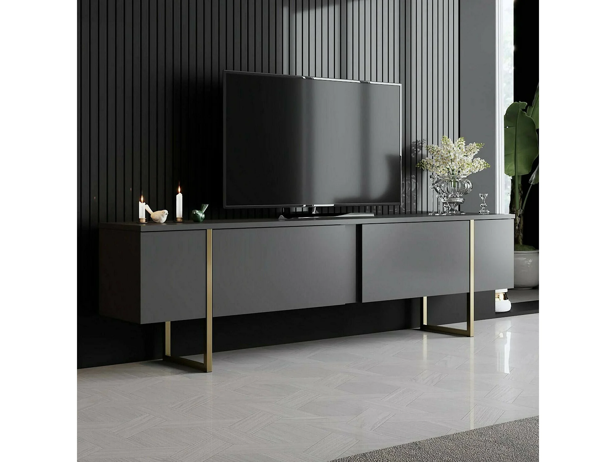 Armário de suporte de TV Dgridell, Aparador de sala, Armário de TV baixo, Base de parede equipada, 180x30h50 cm, Antracite e Ouro