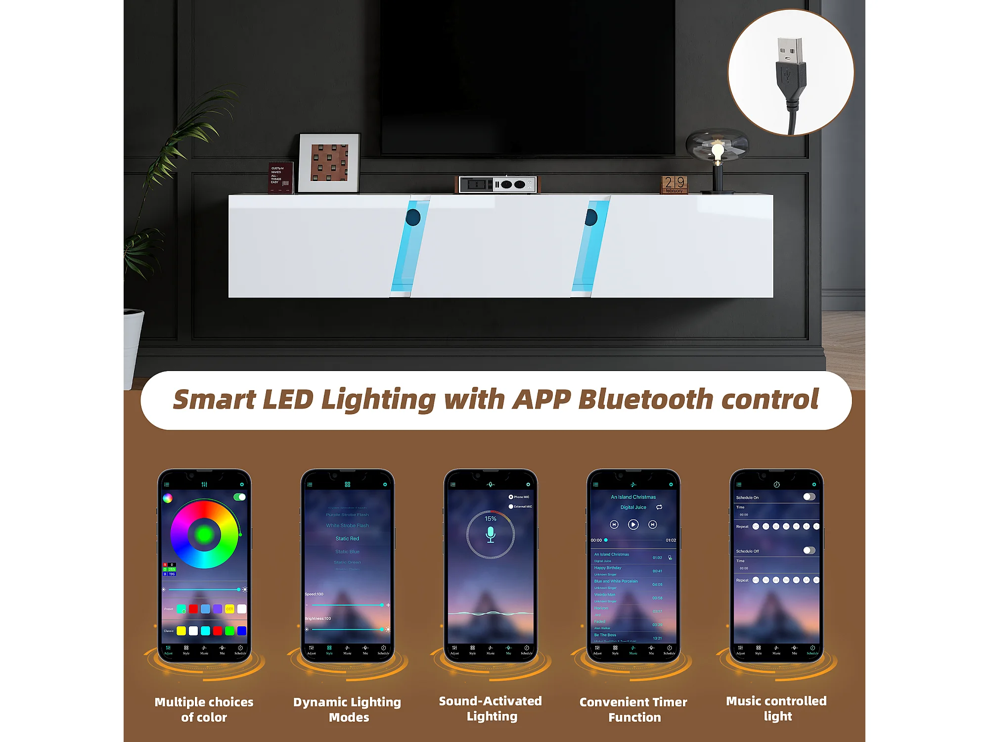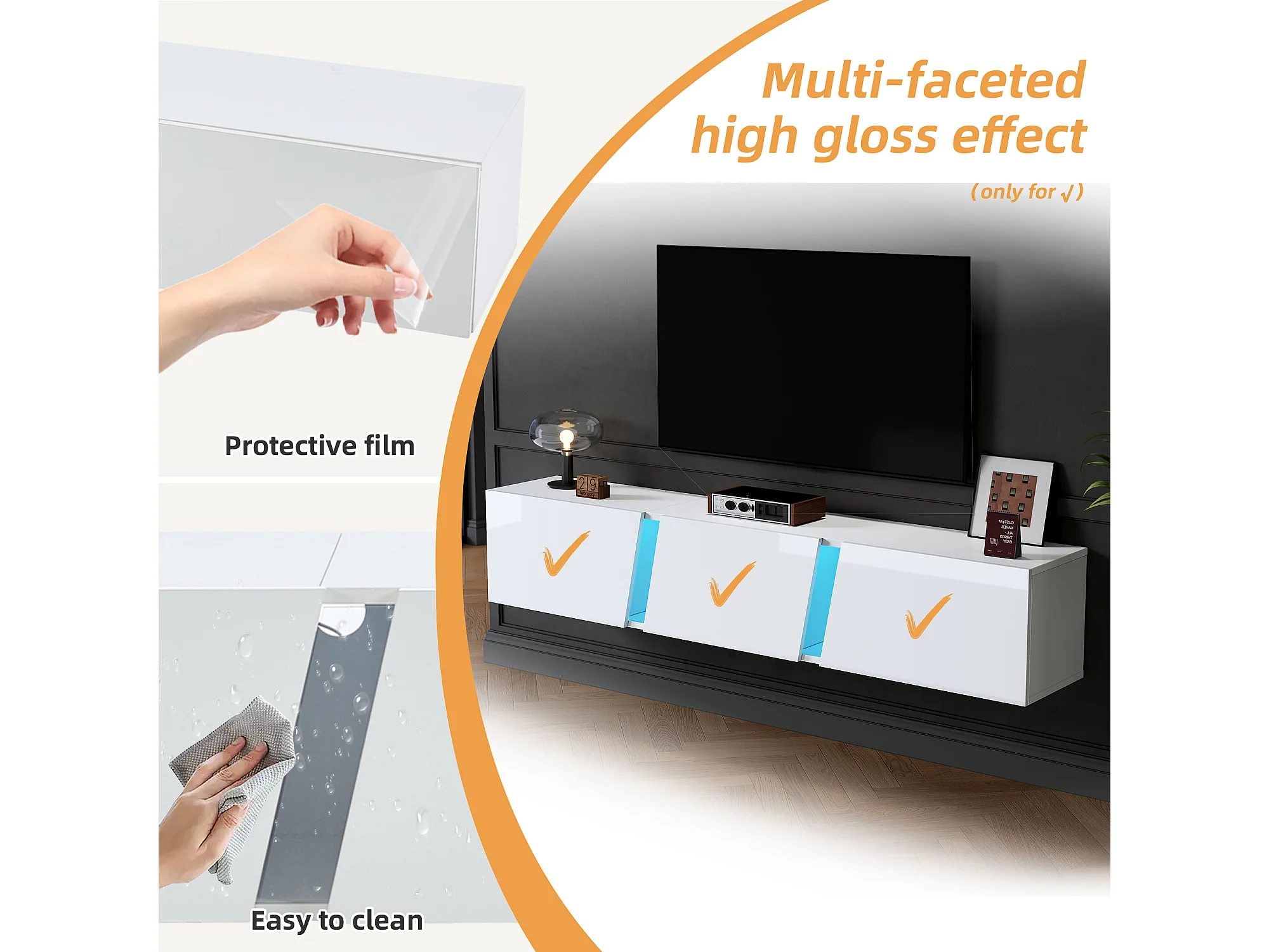 Armário de TV baixo para montagem na parede com luzes LED e 3 portas de armário - Compatível com TV de 75"
