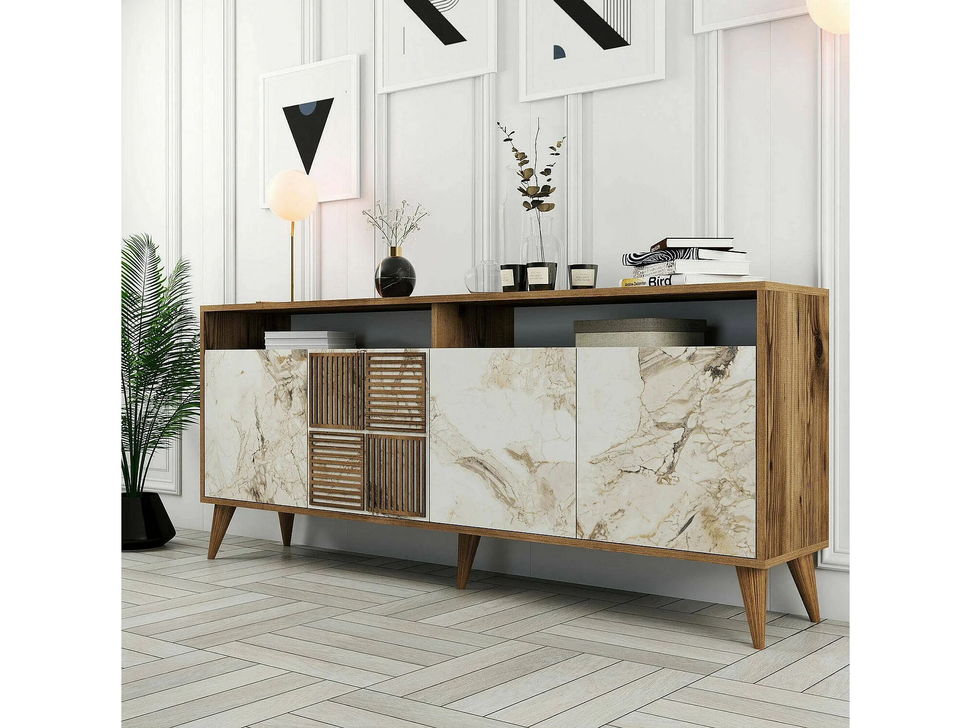 Armário de TV Dpogg, Aparador de sala, Armário de TV baixo, Base de parede equipada, 180x35 h79 cm, Mármore de nogueira e branco