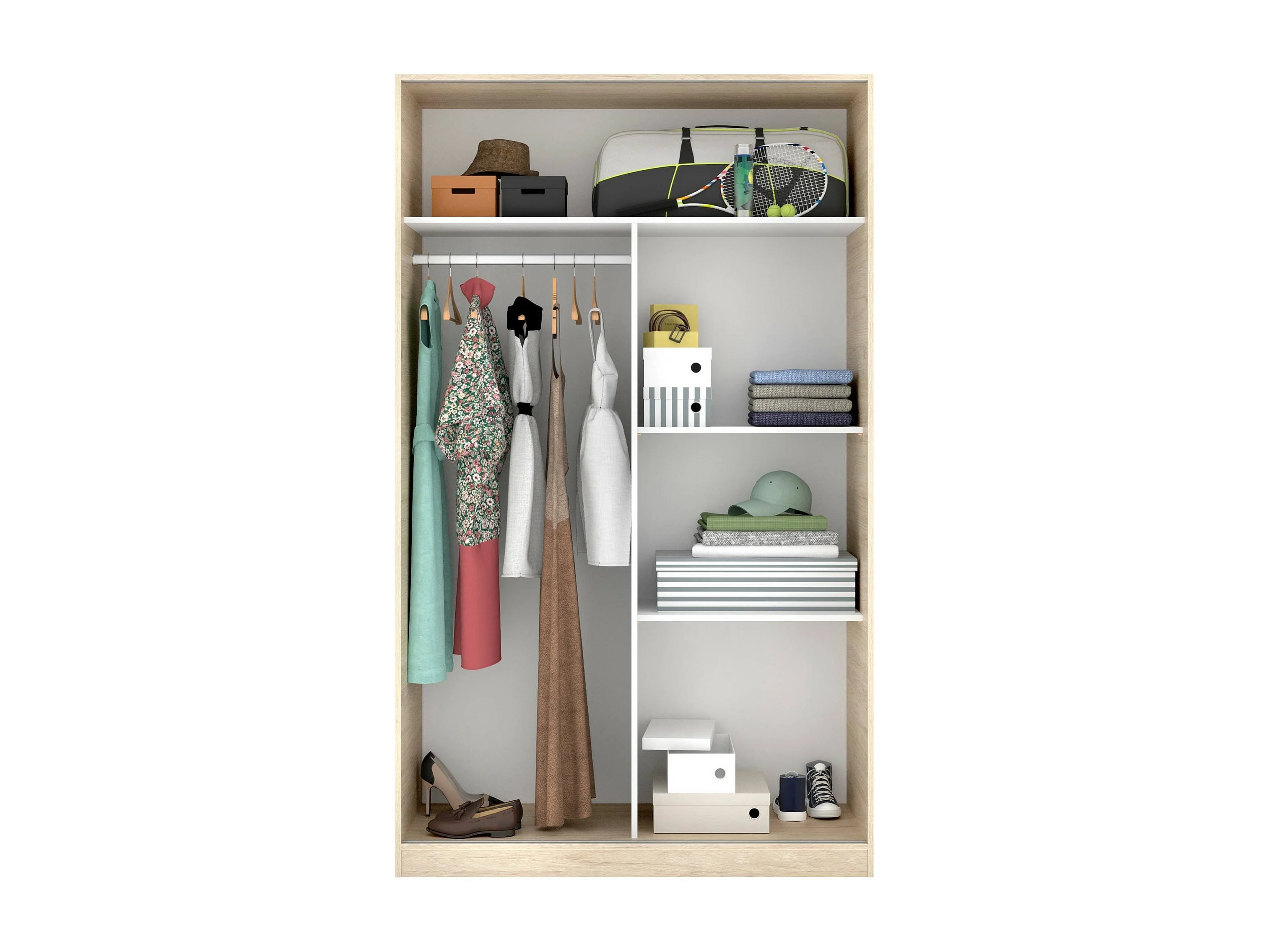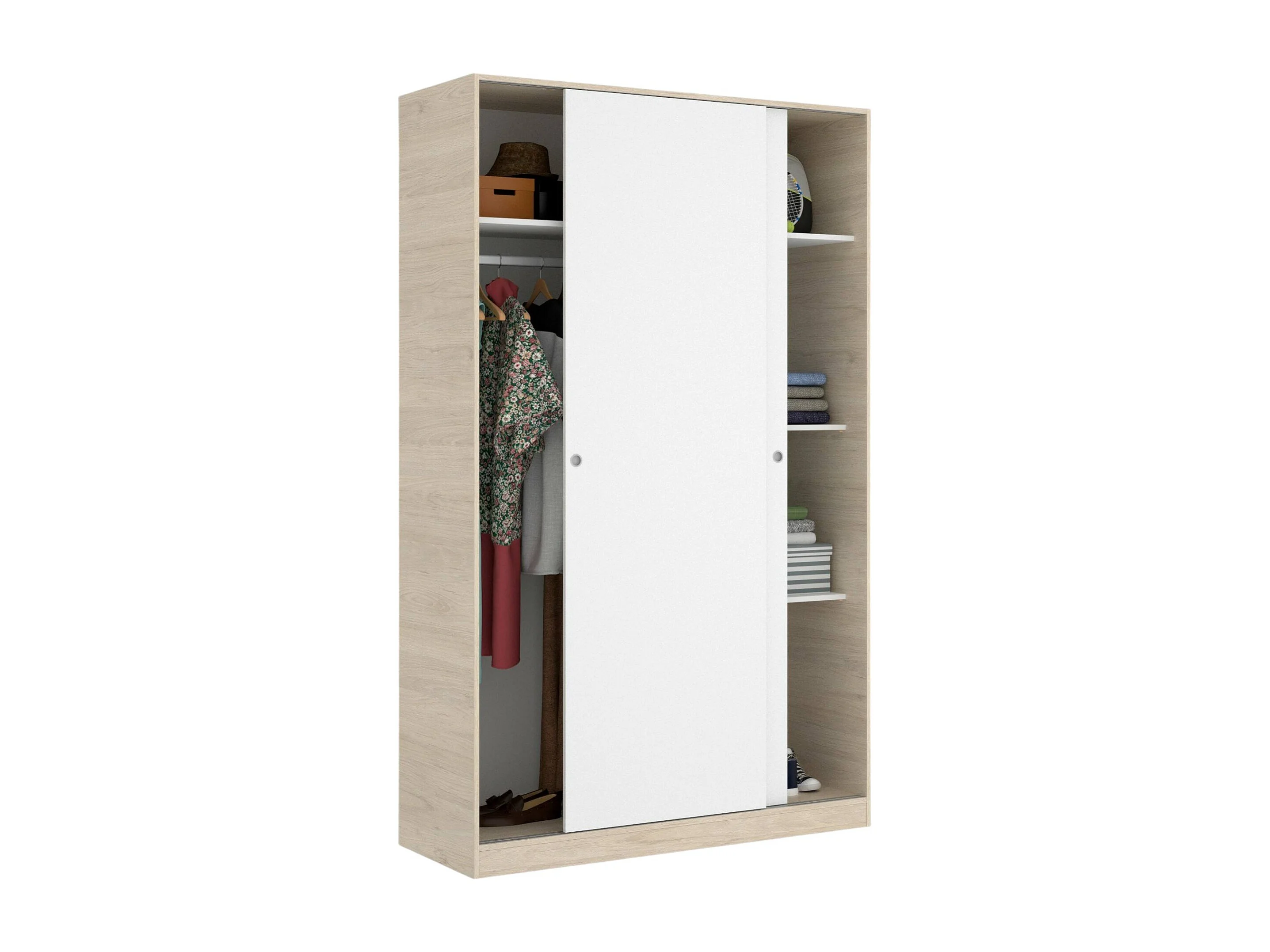 Armário Denali, Cabide para quarto, Armário com 2 portas de correr, 120x50h204 cm, Branco e Carvalho
