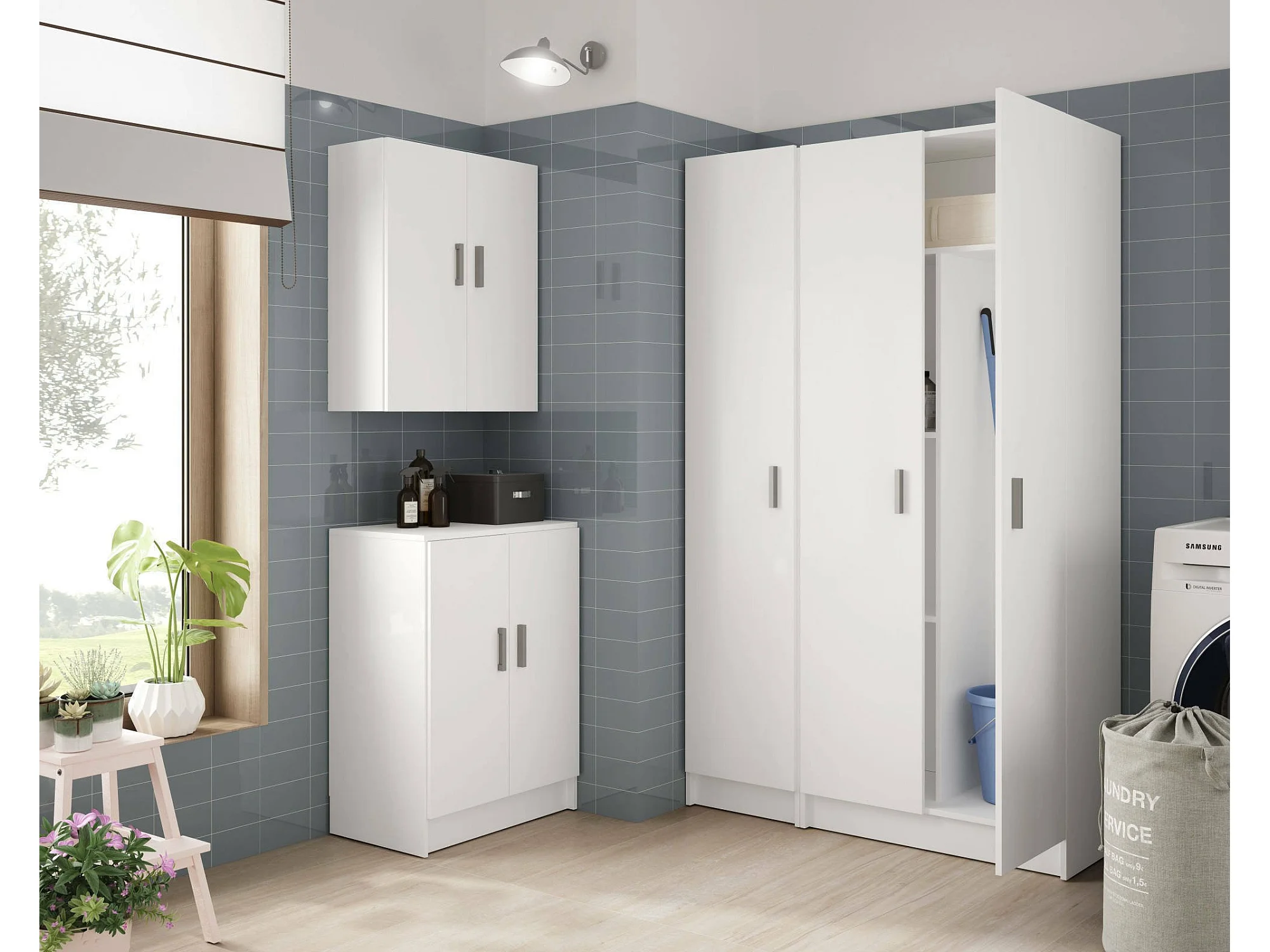 Armário multiuso Dmeli, Armário porta-vassouras multifuncional, guarda-roupa 3 portas, 116x35h190 cm, Branco