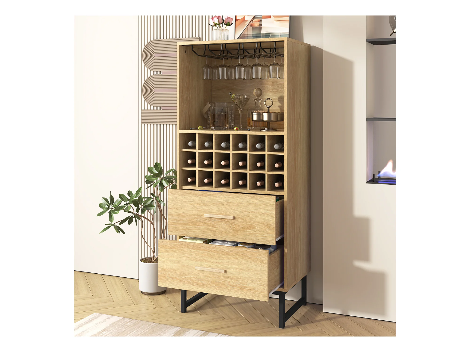 Armário para vinhos em madeira natural PB com porta-garrafas e porta-copos, 18 compartimentos, 2 gavetas, 60 x 39,5 x 141 cm