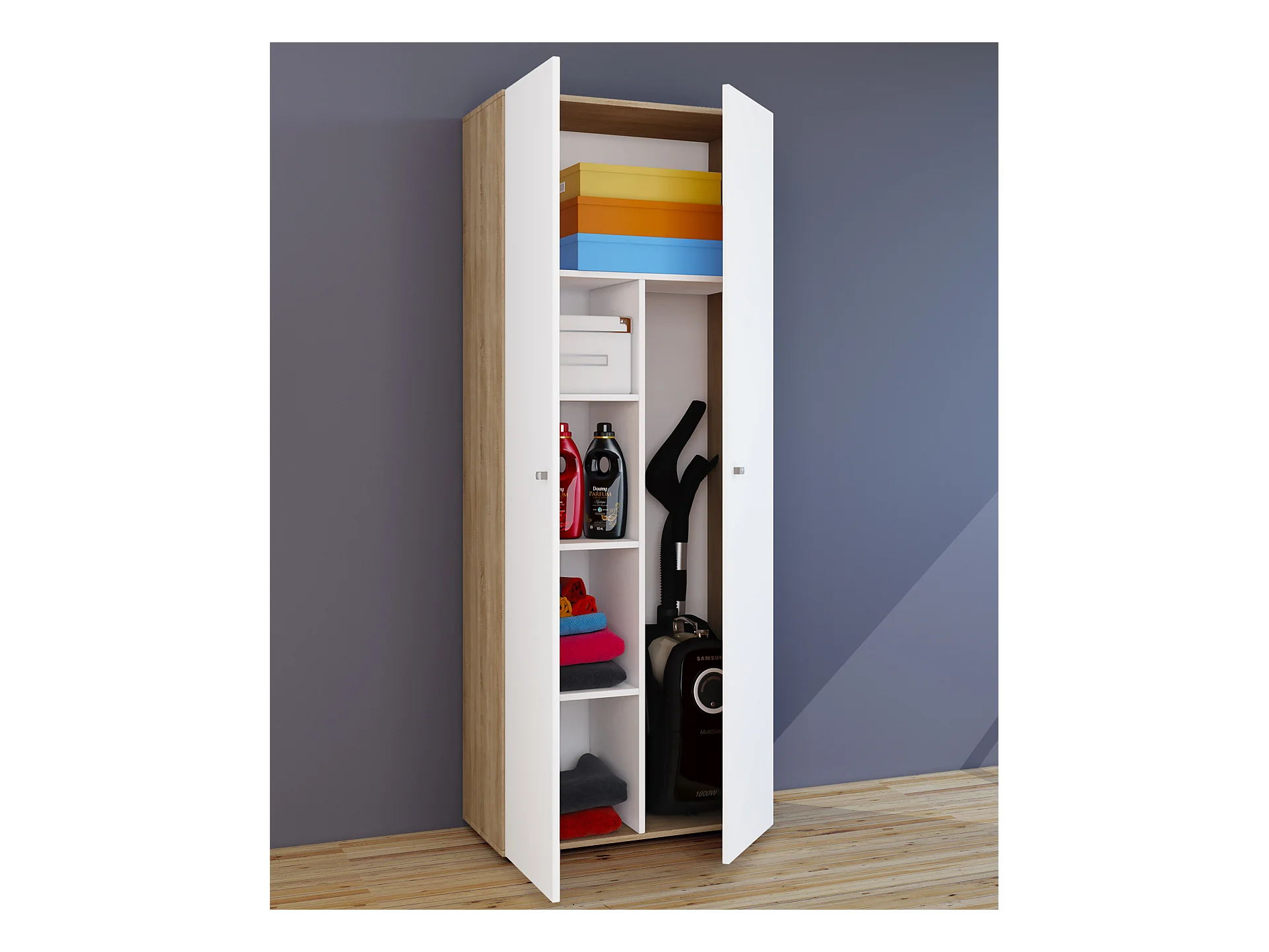 Armário vassoura VCM | 6 compartimentos | Dimensões L. 70 x A. 238 x P. 40 cm | Armário doméstico | Armário multiuso | Montagem com duas portas - Vandol (Beech)