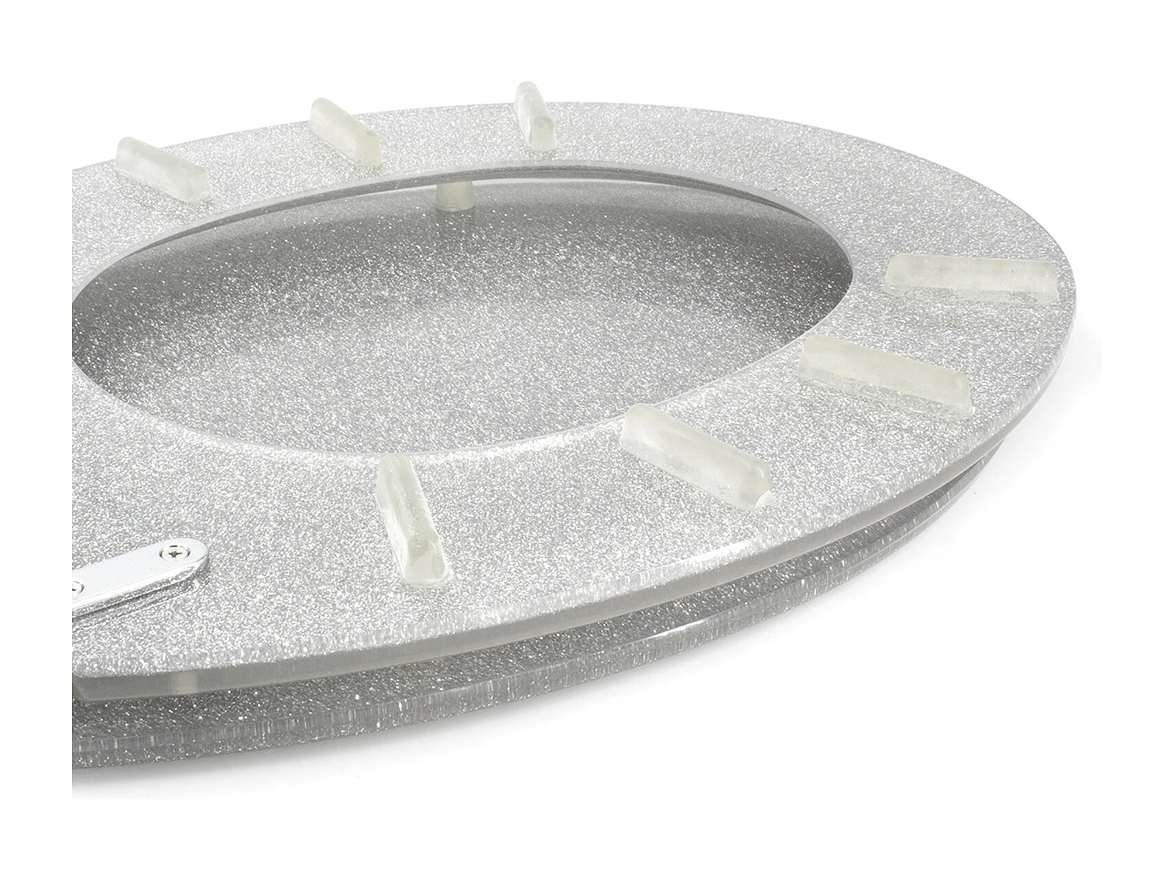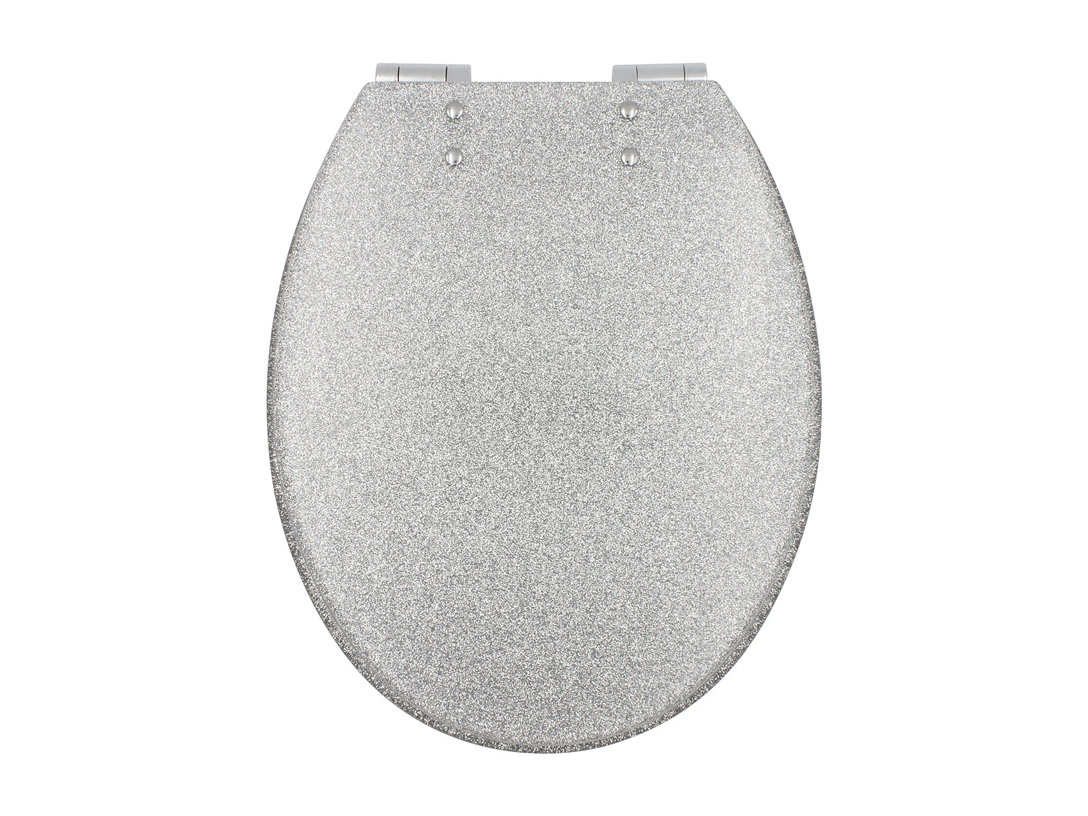 Assento sanitário de resina glitter prata com dobradiças metálicas cromadas e fechamento suave SOFT CLOSE