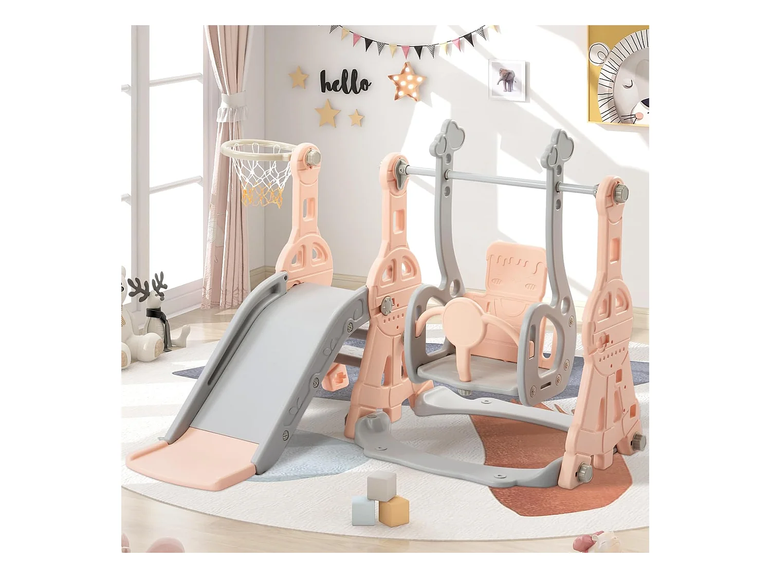 Escorregador infantil 4 em 1 com suporte para basquete, escada de escalada, balanço de jardim, rosa e cinza