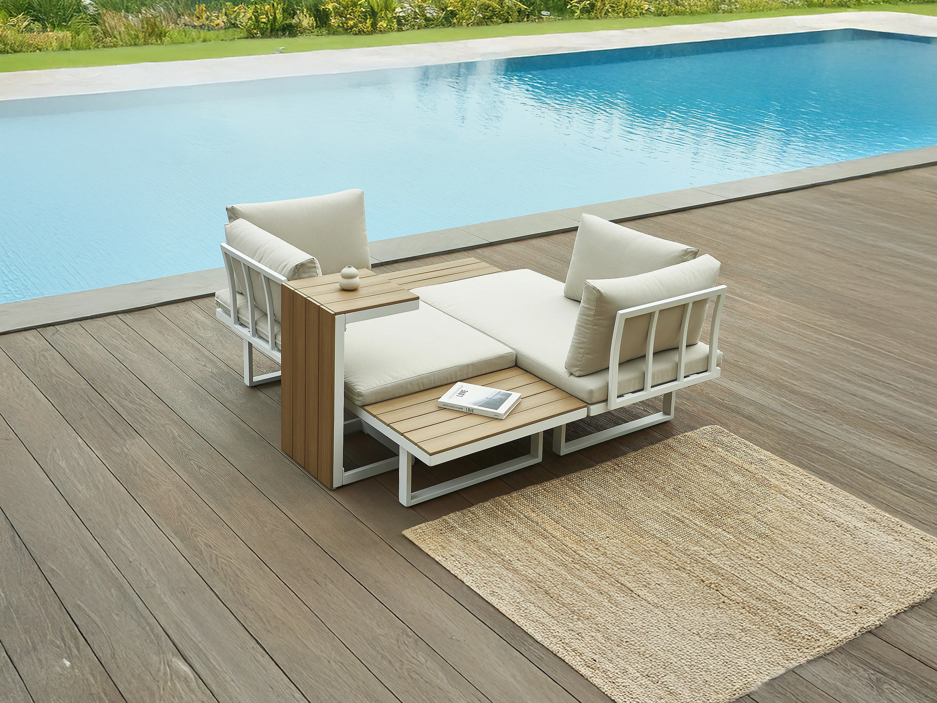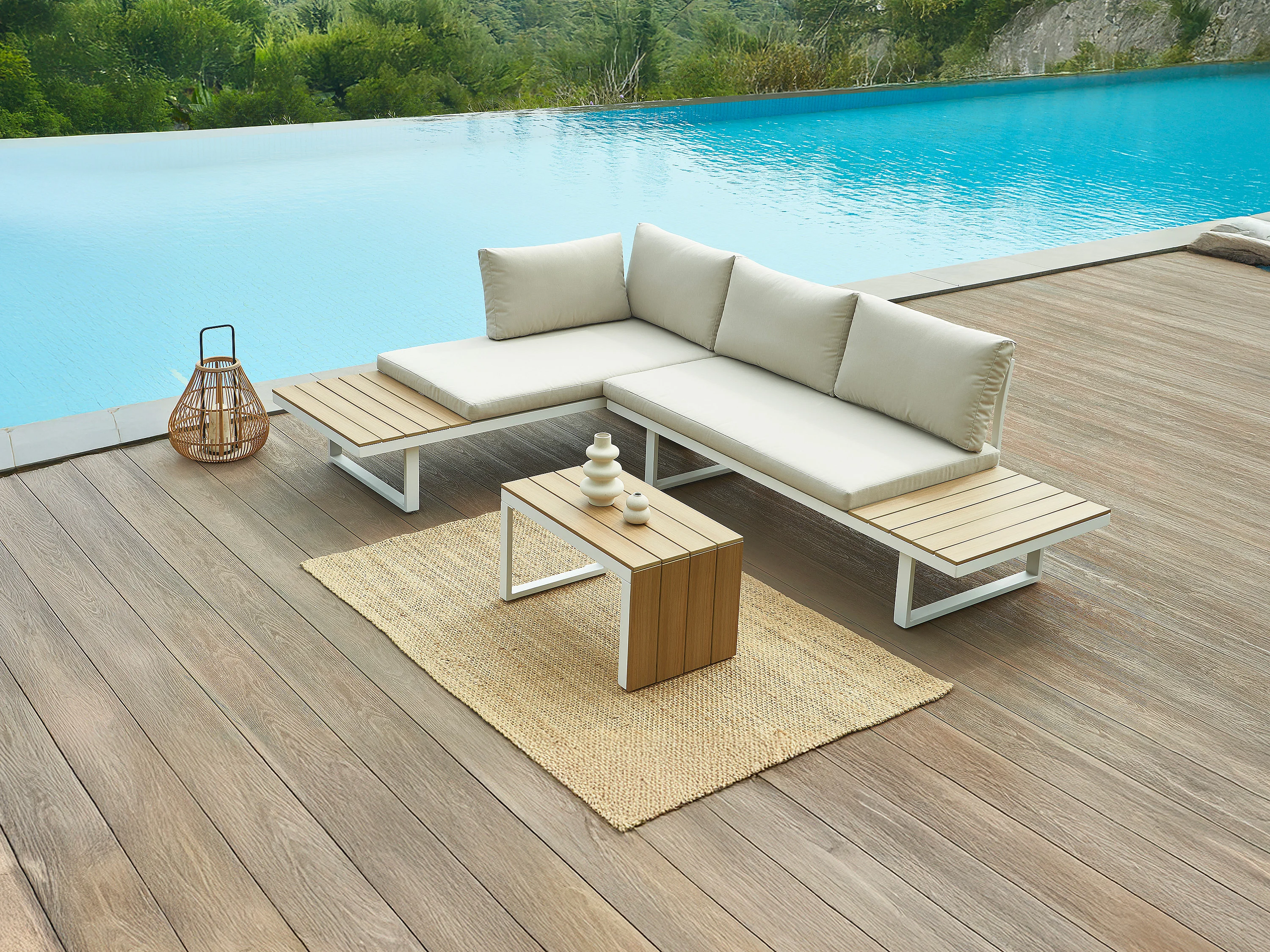 Conjunto de jardim modular em alumínio: 2 sofás e uma mesa de centro - Branco com almofadas bege - BAMBAÏA de MYLIA