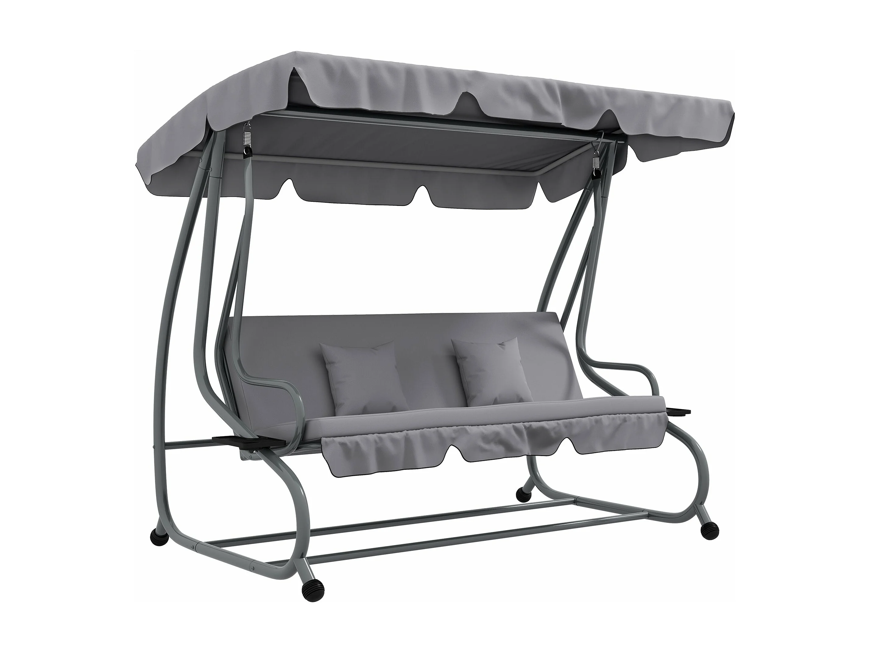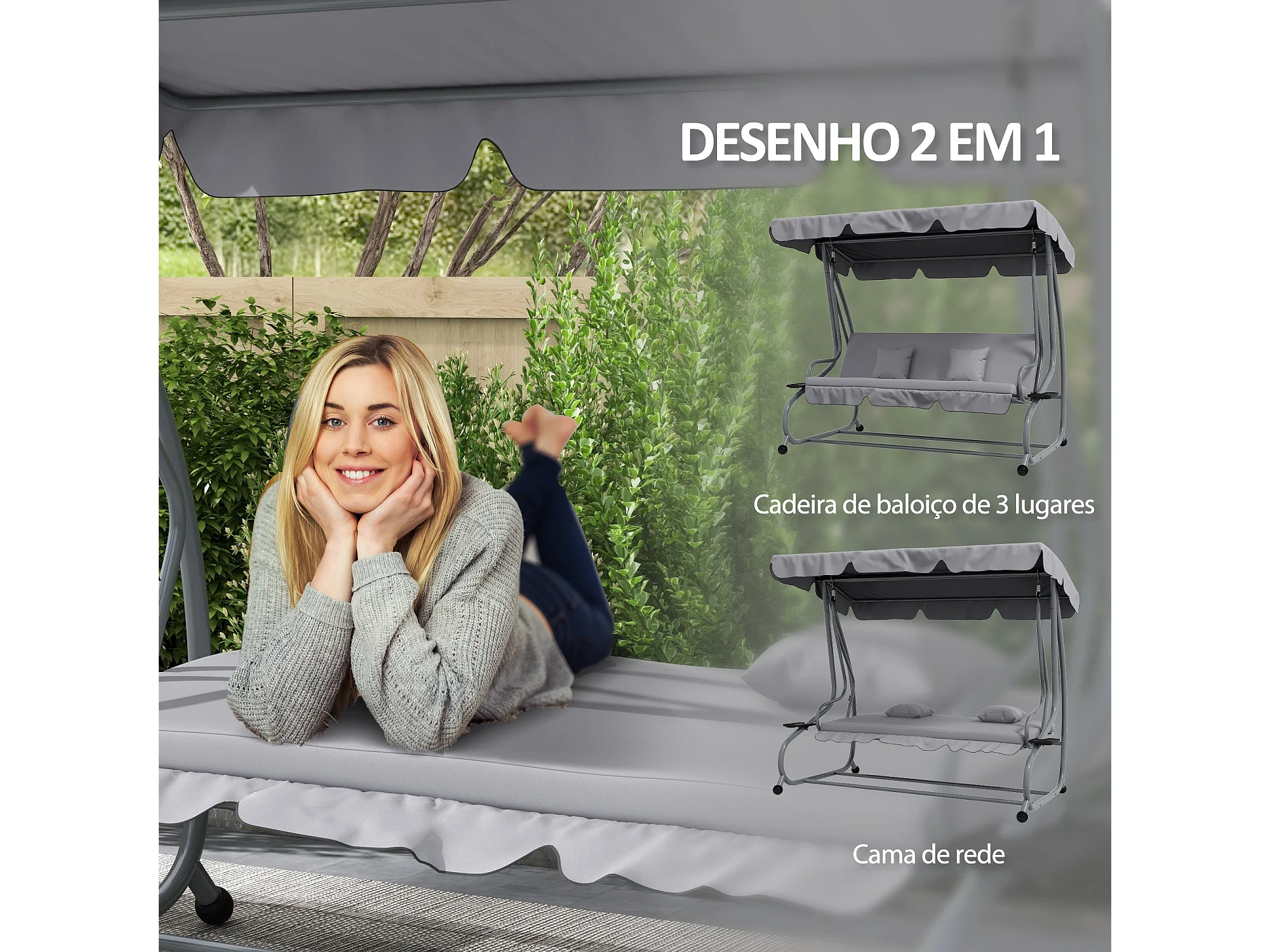 Banco Baloiço de Jardim 3 Lugares com Toldo Ajustável e Almofadas - Cama Convertível Cinza