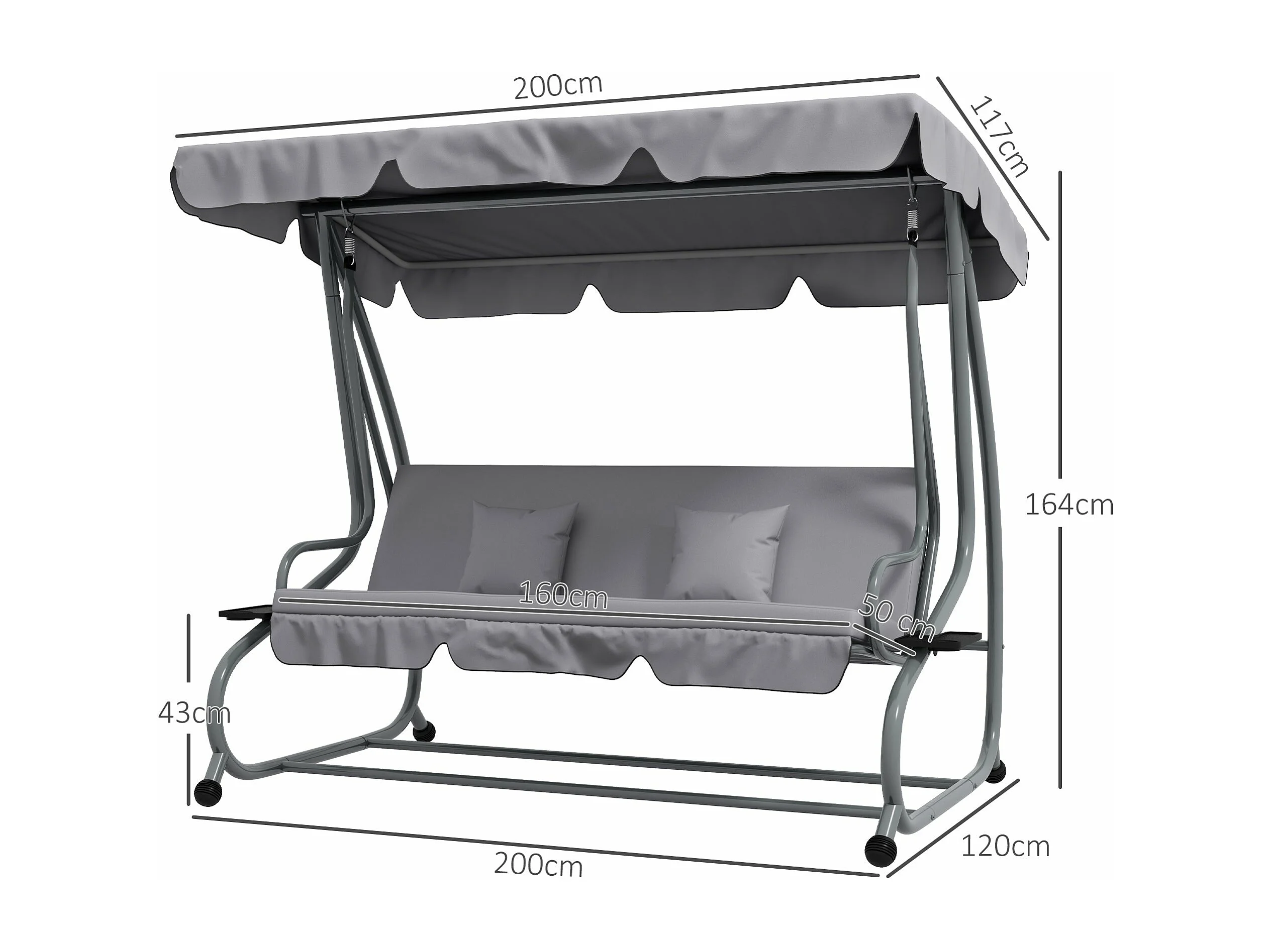 Outsunny Baloiço de Jardim para 3 Pessoas com Toldo Ajustável e Estrutura Resistente em Aço - Cinza
