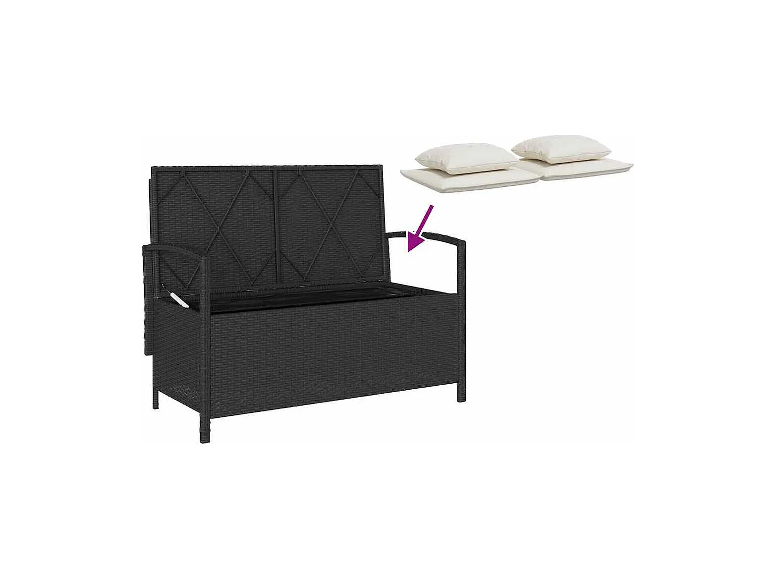 Banco de jardim para arrumação com almofada vime PE preto